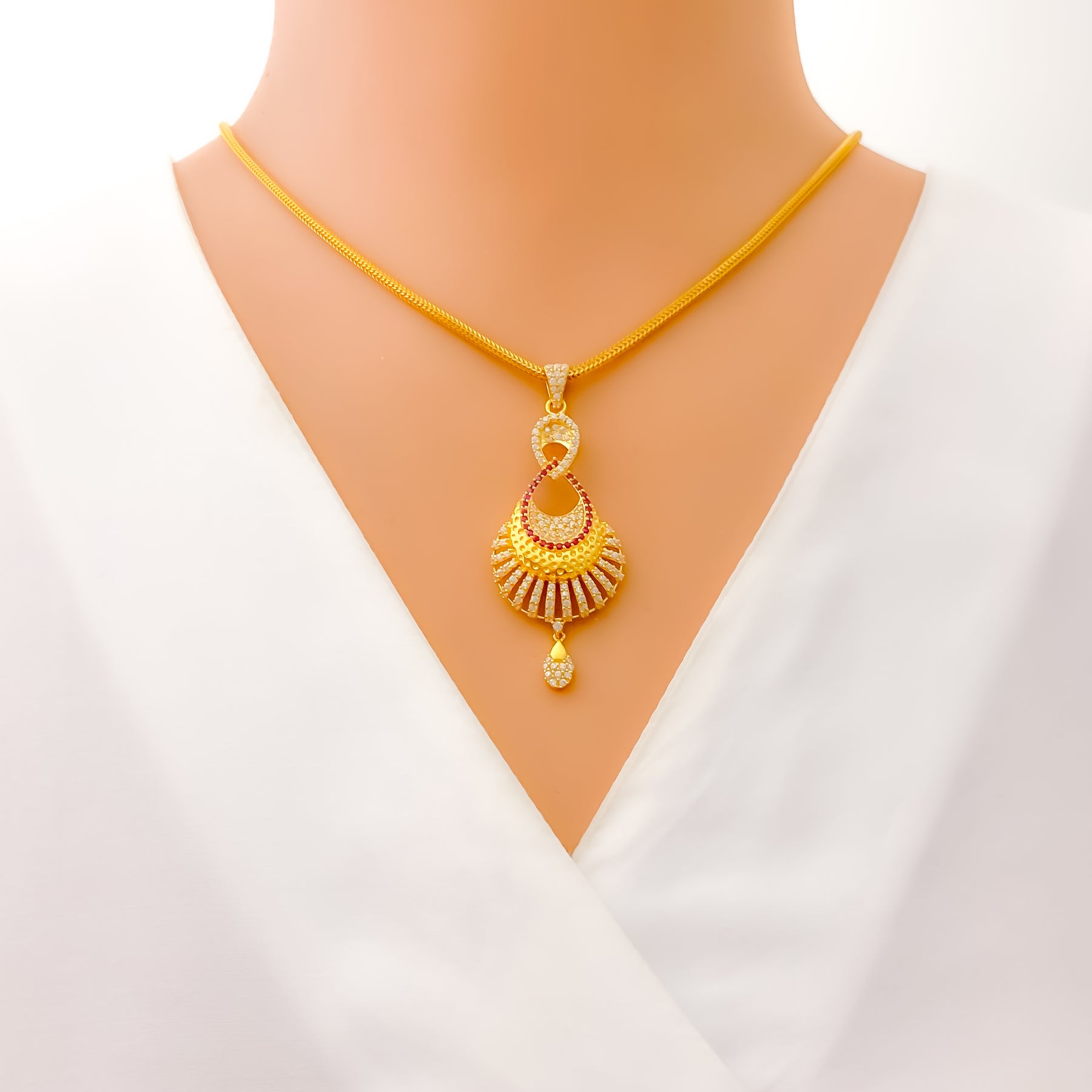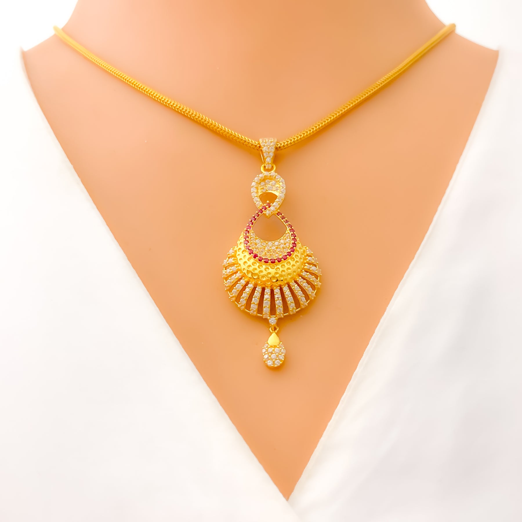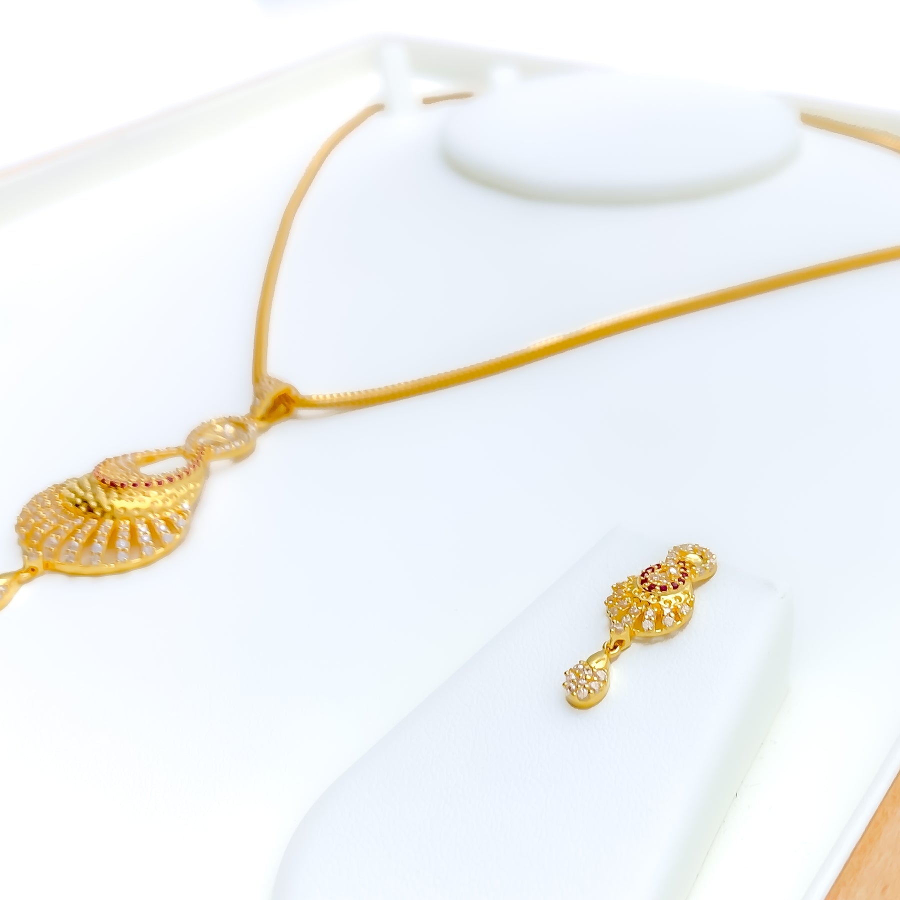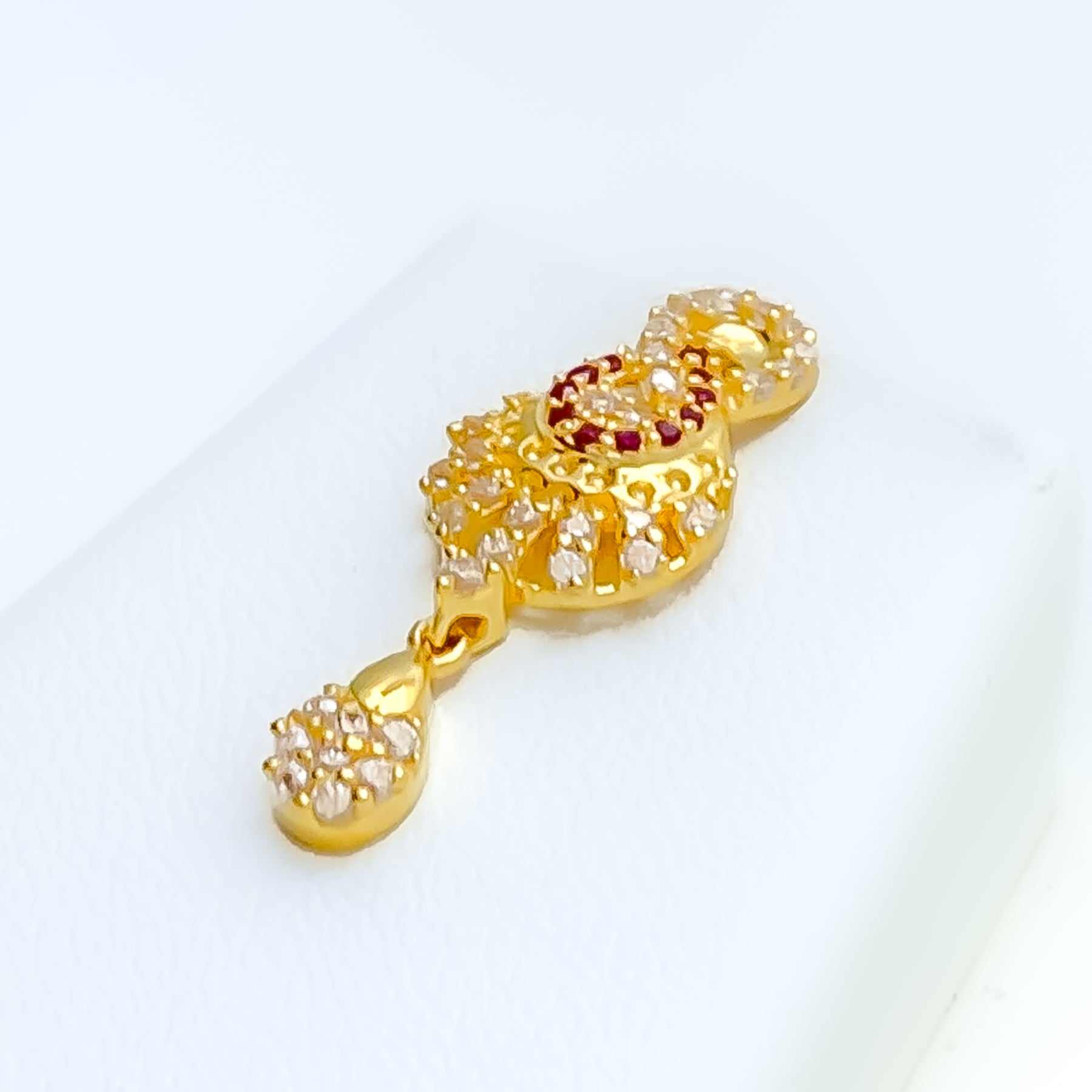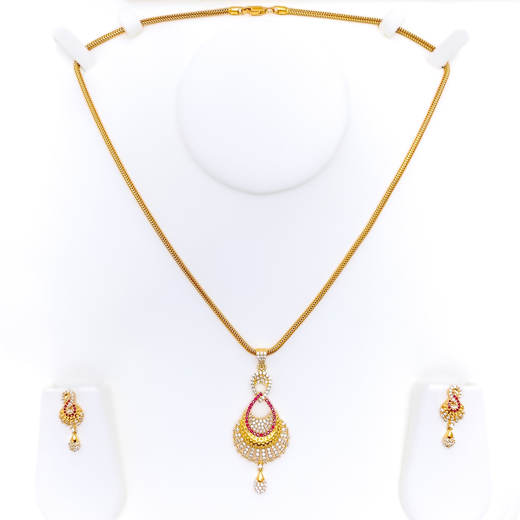 Shimmering with radiant brilliance, this 22k yellow gold pendant set weighs 10.6 grams and showcases sparkling cubic zirconia stones that exude timeless allure. The detailed craftsmanship highlights elegance in every curve, complemented by matching screw-back earrings for refined balance. Perfect for both festive and formal occasions, it captures a blend of grace and sophistication. Designed to dazzle, this three-piece set adds effortless luxury to your collection.