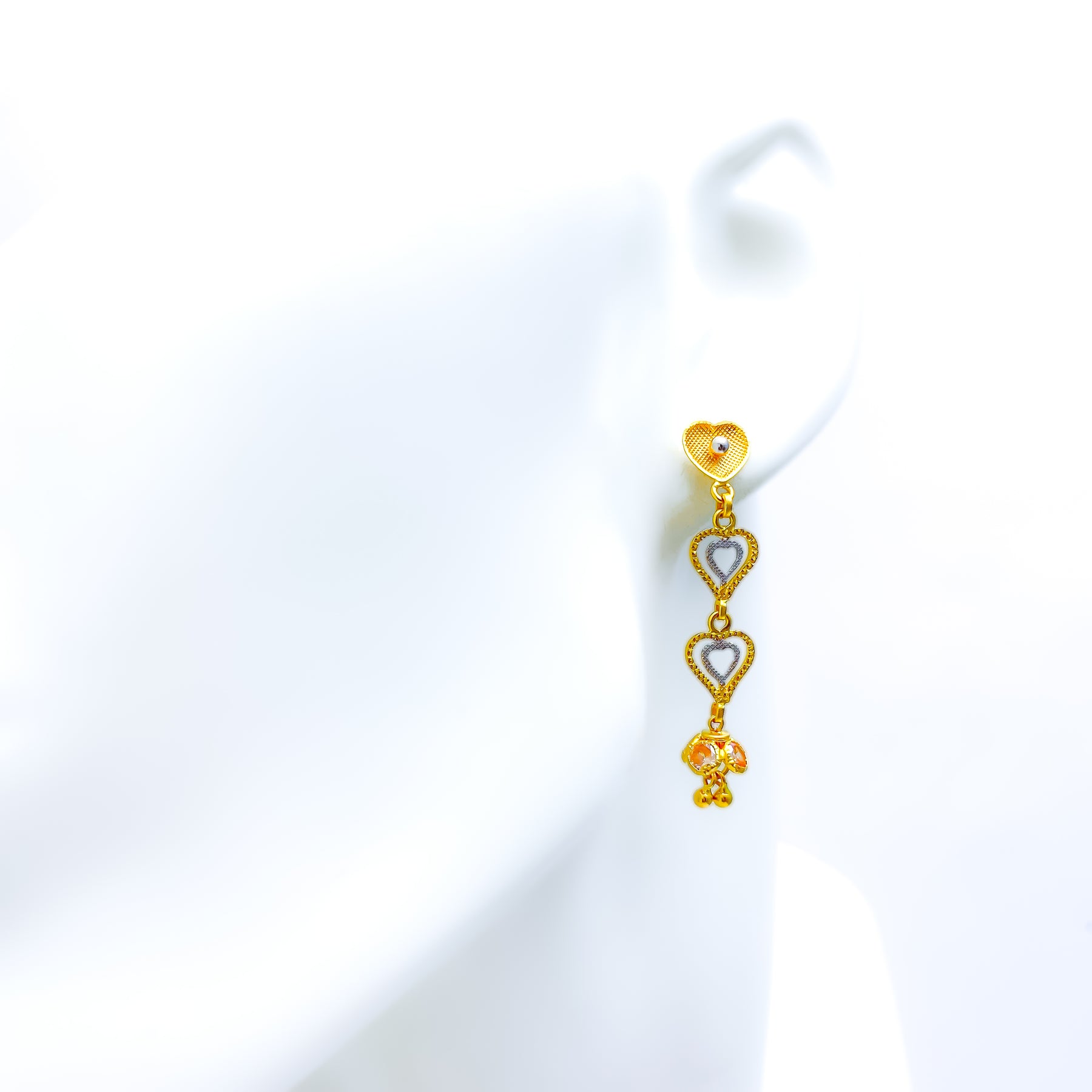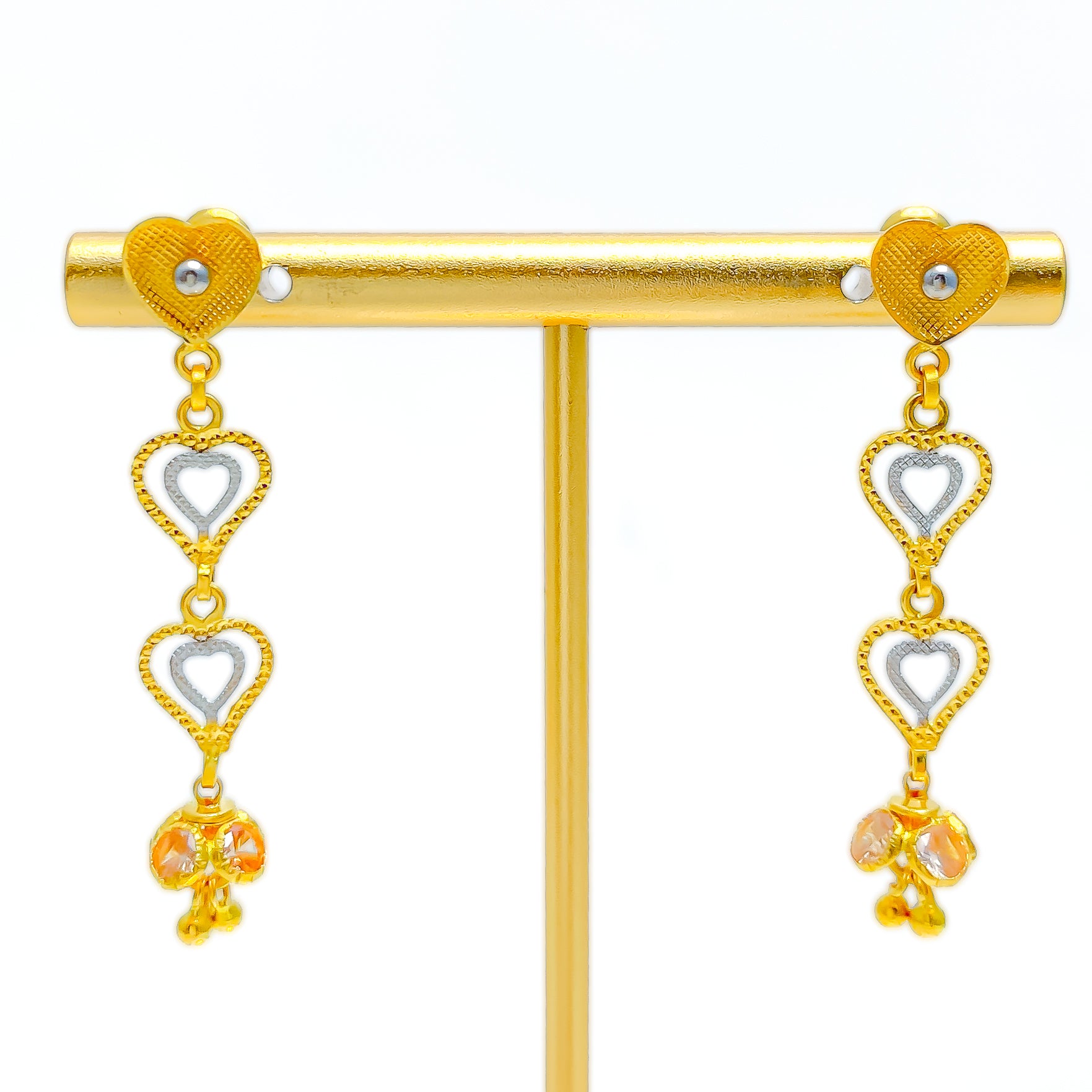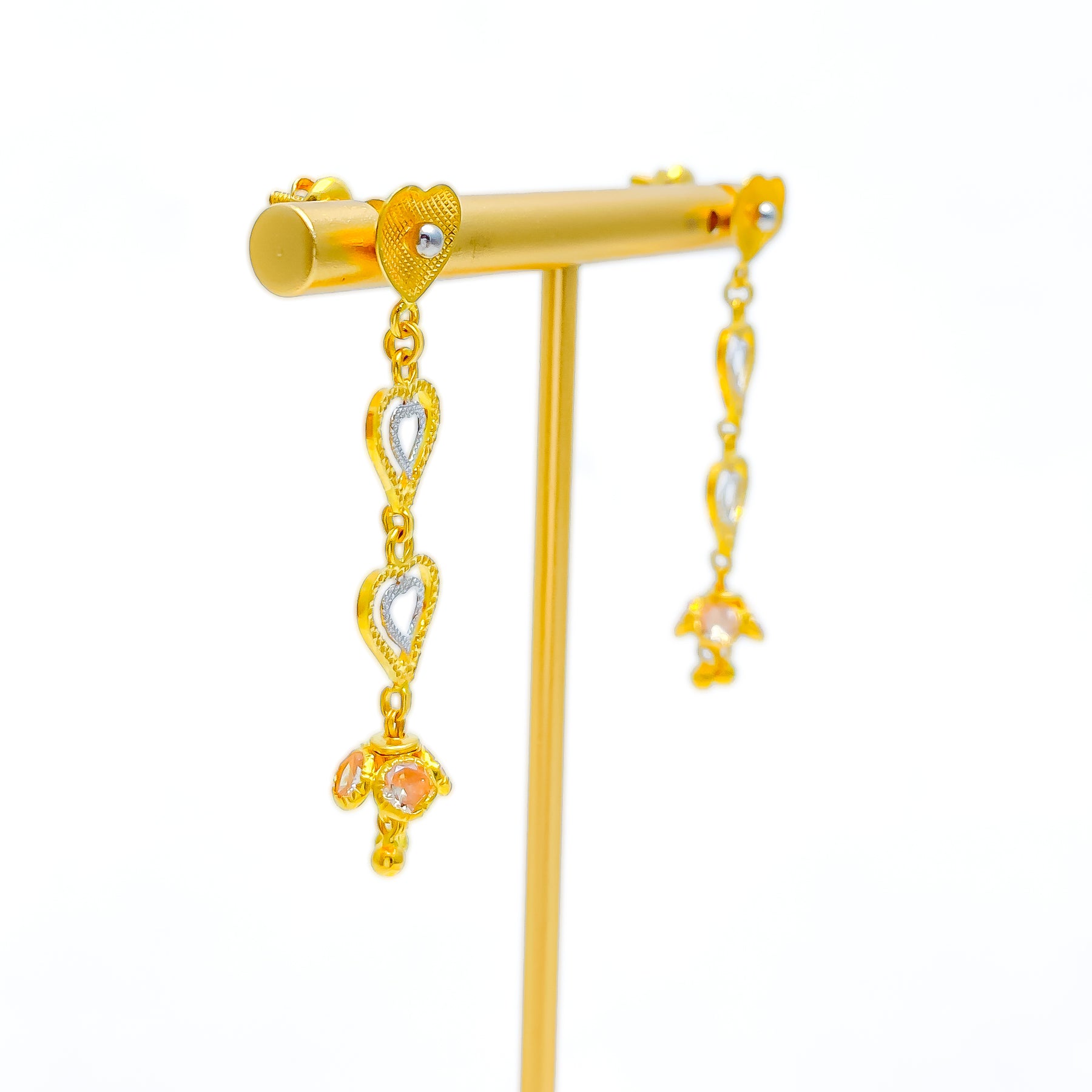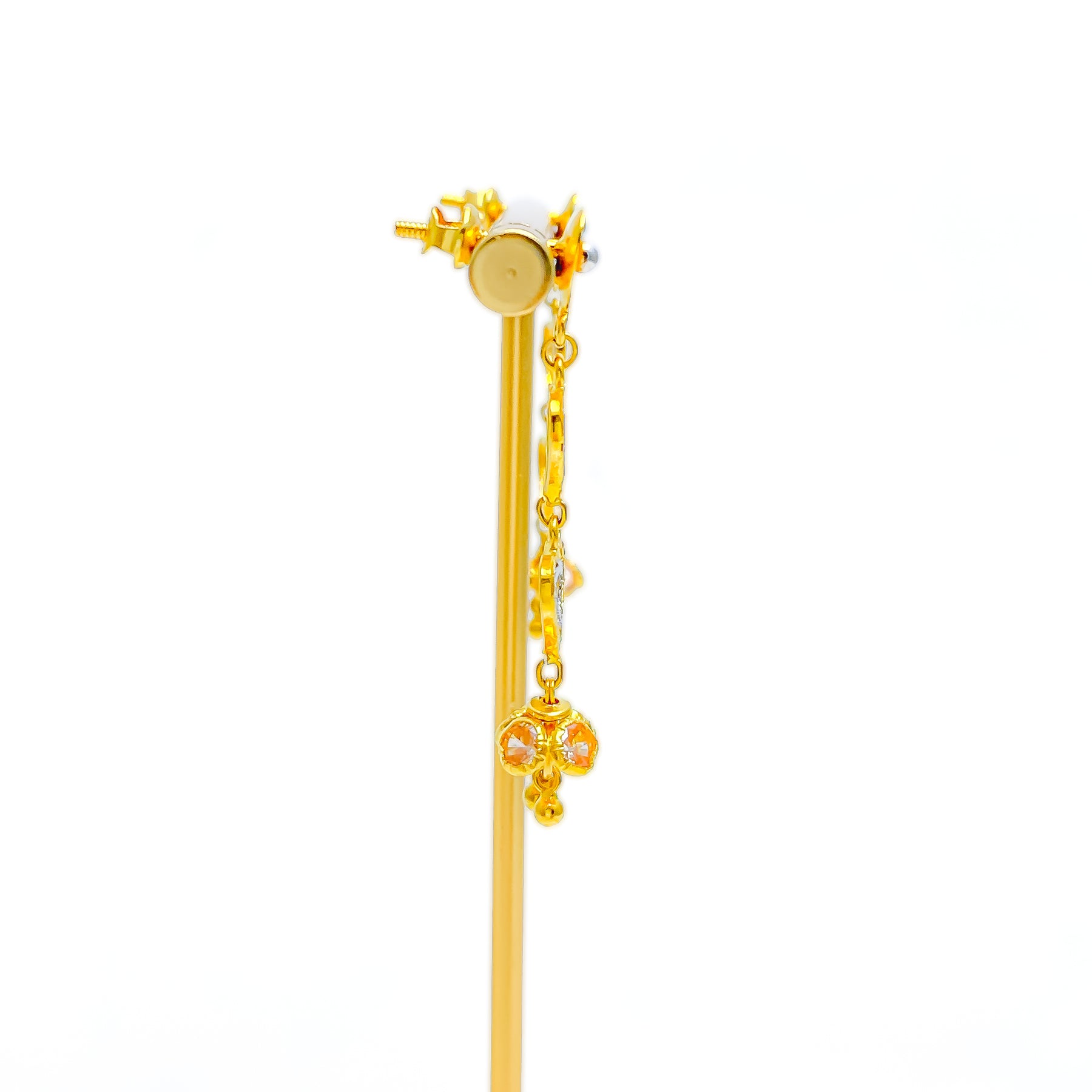 Exquisitely crafted, these 22k gold earrings shimmer with the brilliance of CZ stones set in a stunning yellow and white gold finish. Weighing 5.2 grams, their 1.75-inch hanging design adds fluid elegance. The screw-back closure ensures secure wear. Perfect for making a refined yet contemporary statement.