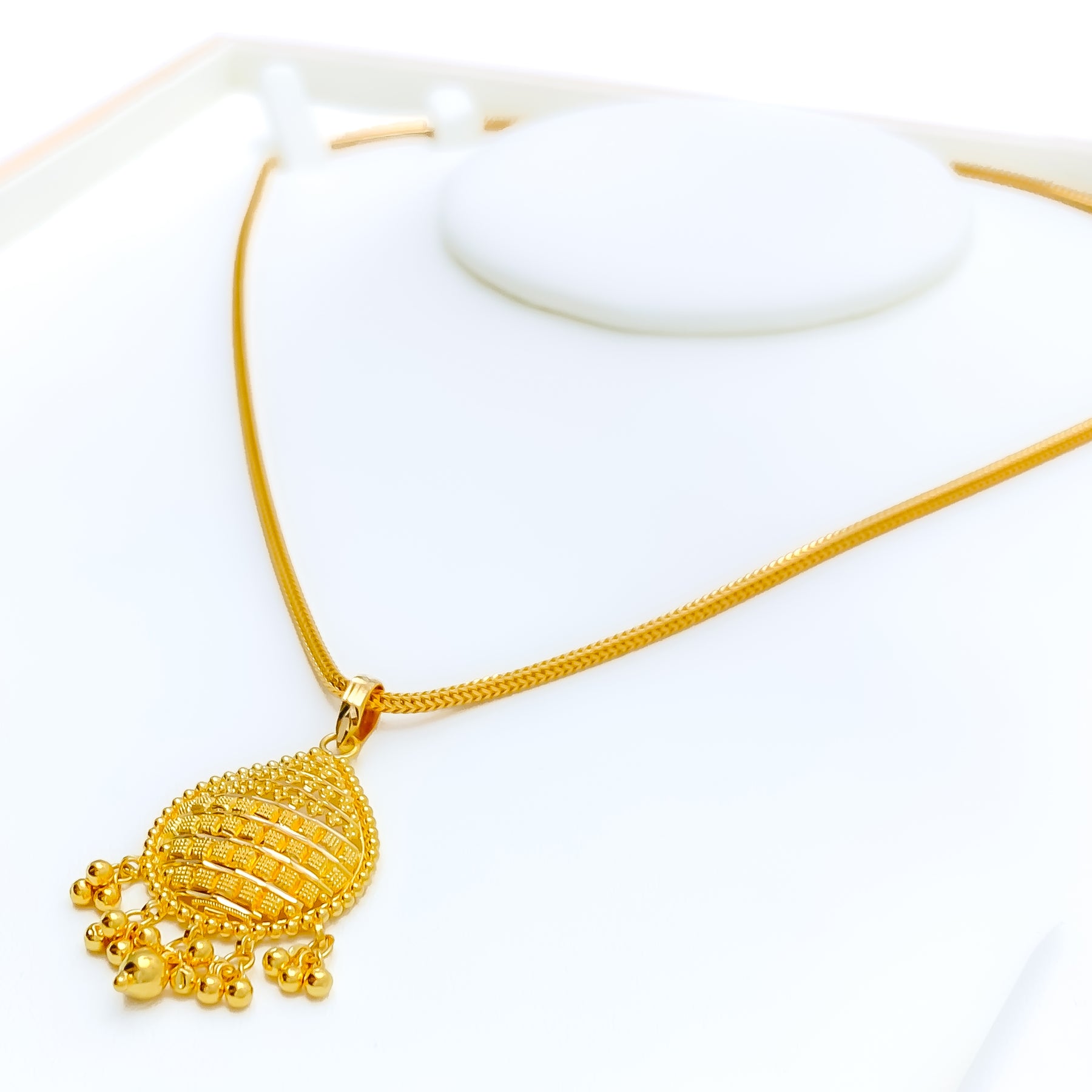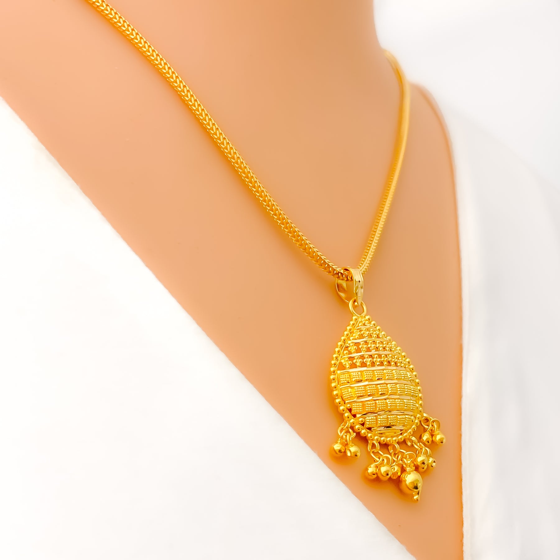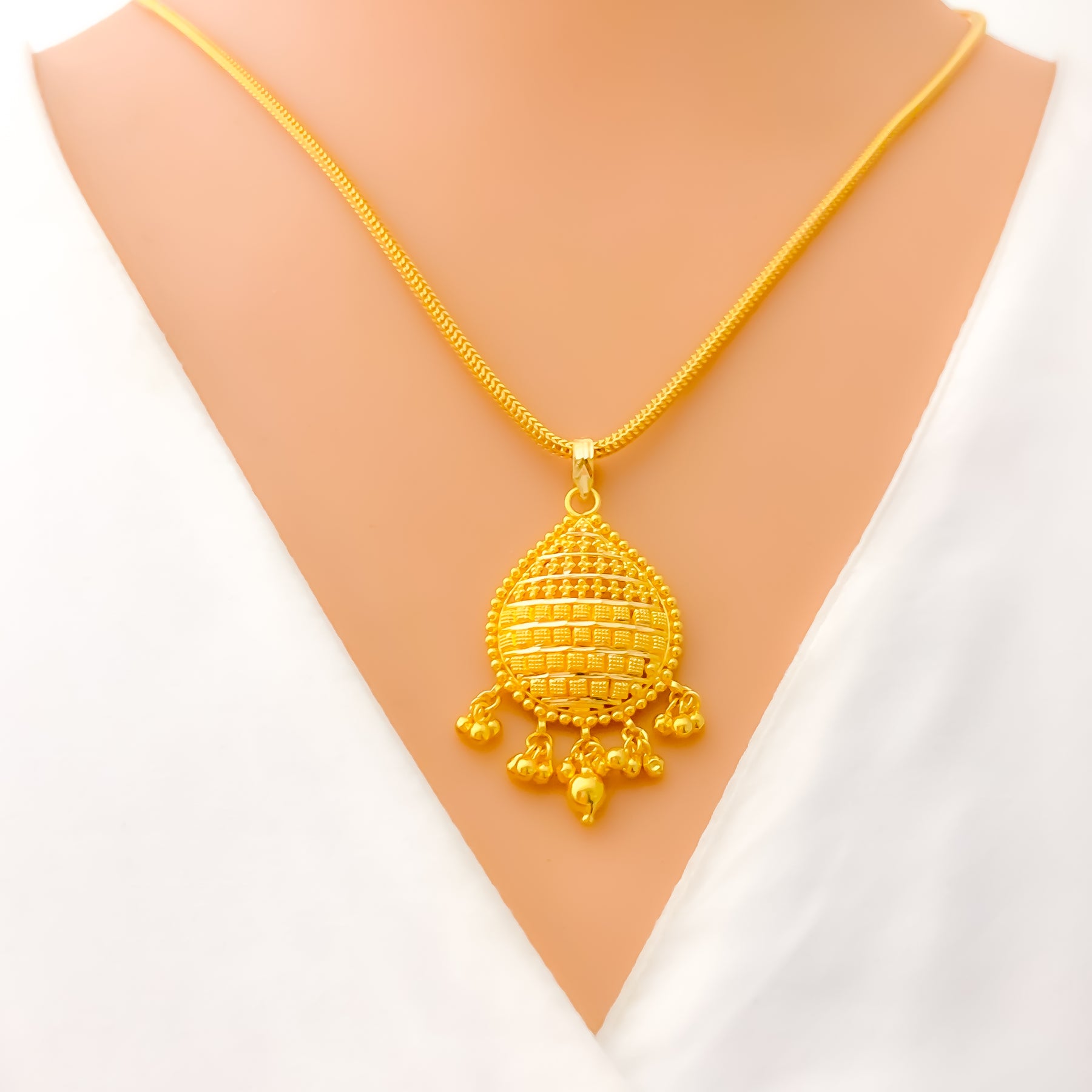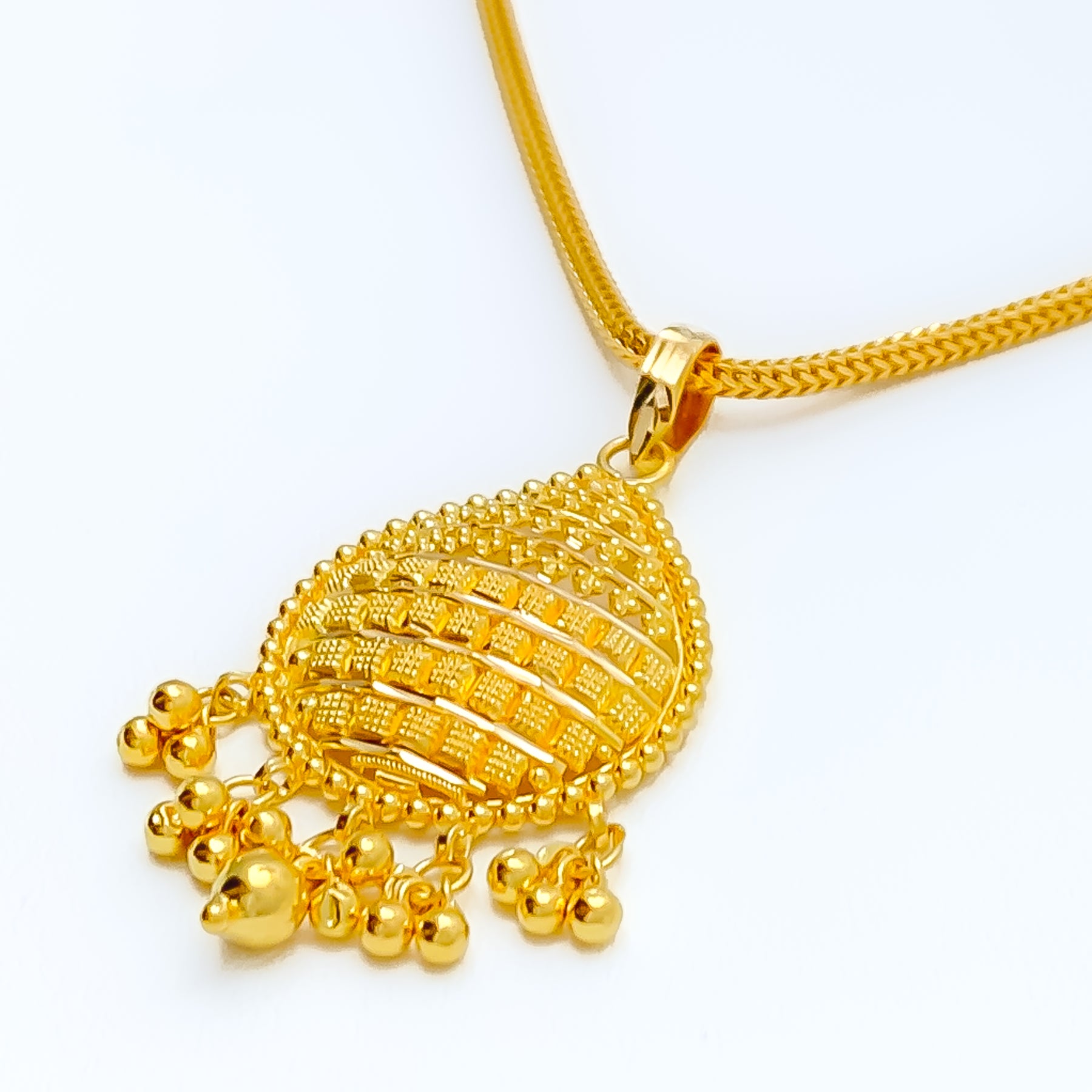 This striking 22k yellow gold pendant, weighing 4.5 grams, showcases a vibrant design that radiates dazzling brilliance. The polished finish enhances its golden glow, adding refined sophistication. Measuring 1.75" in length, it offers a graceful yet bold presence. A timeless accessory that beautifully blends classic artistry with modern elegance, perfect for both daily wear and festive occasions, with chain not included.