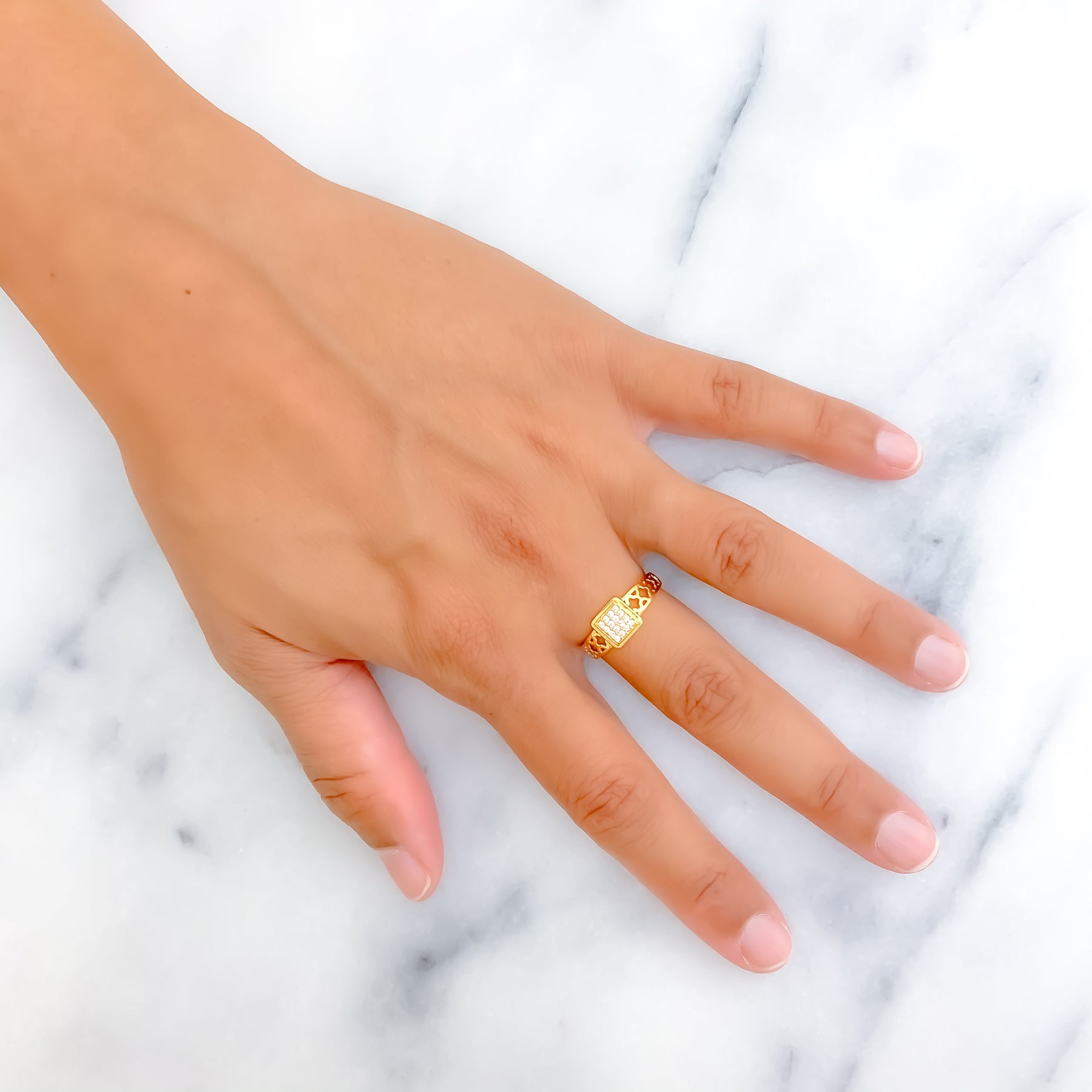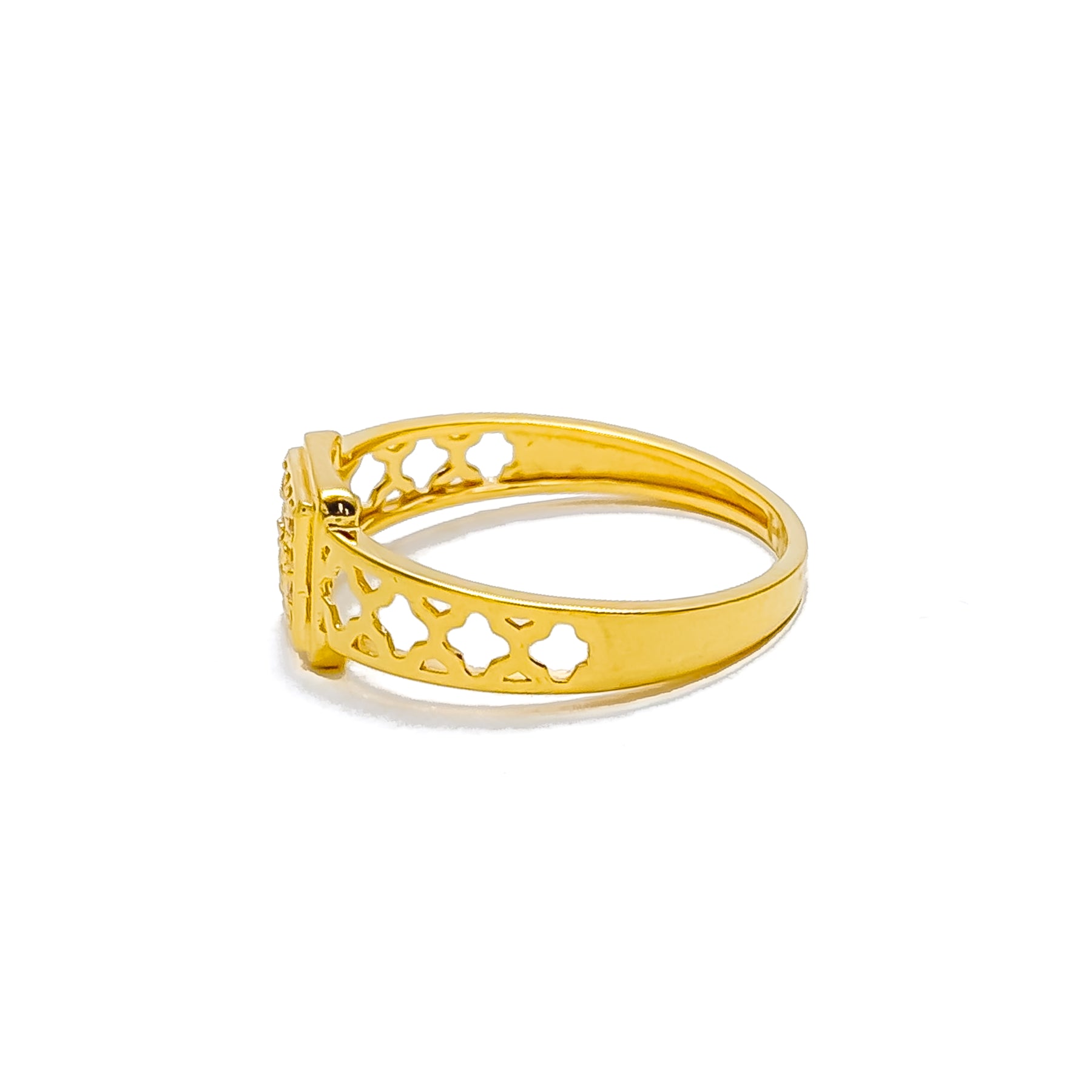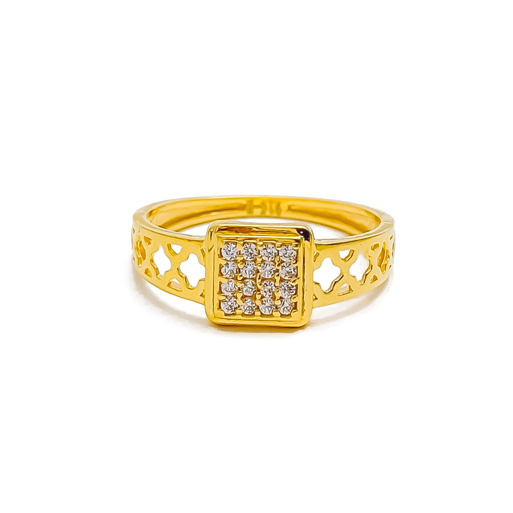 Beautifully designed in 22k yellow gold and weighing 2.4 grams, this ring features a refined square motif accentuated by dazzling cubic zirconia stones. Its decorative detailing and radiant polish create a graceful fusion of modern artistry and classic charm. Perfect for both daily elegance and festive occasions, it adds a sophisticated sparkle to any ensemble. Available in size 6.75 with re-sizing options for a tailored fit.