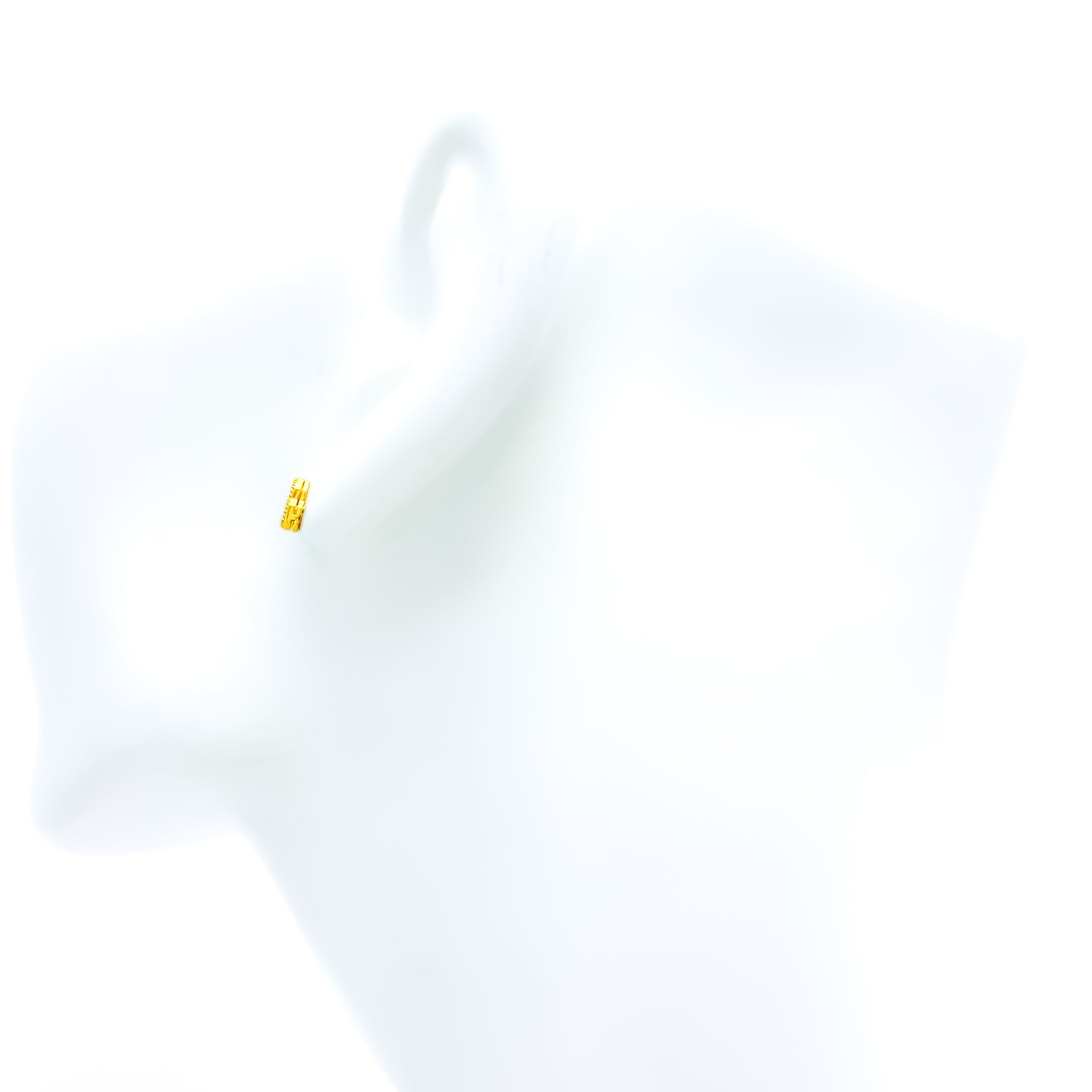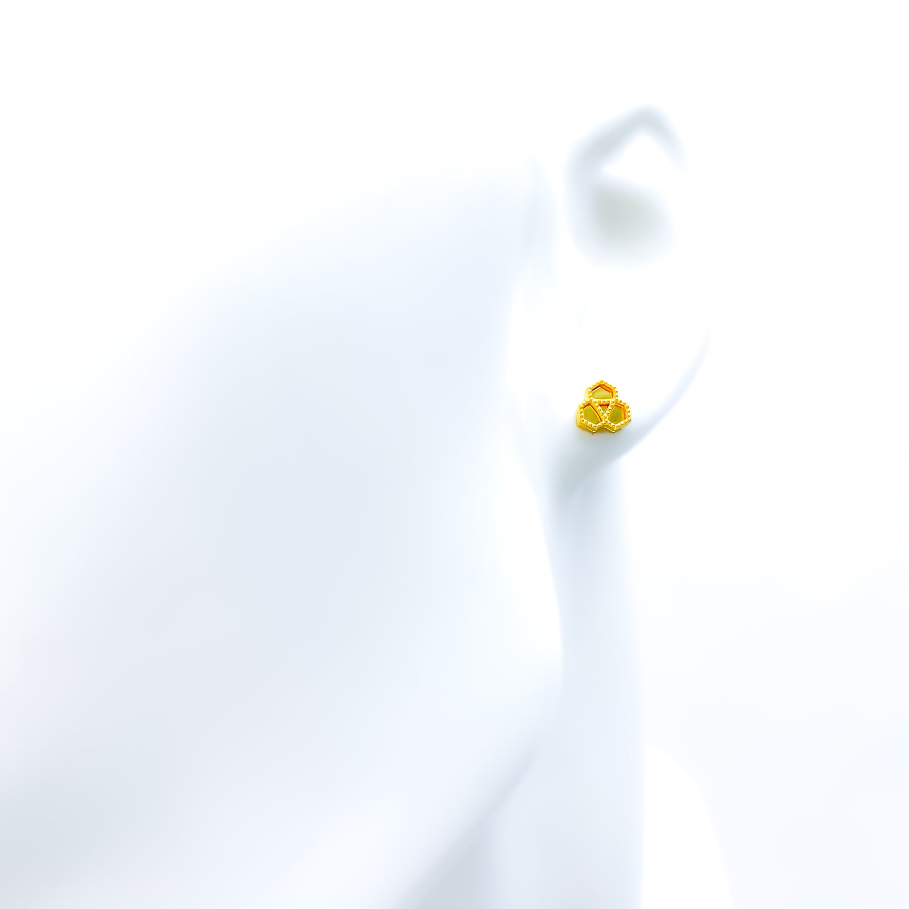 Finely designed, these 21k gold earrings showcase modern artistry with their geometric charm and polished finish. Weighing 1.8 grams, they blend contemporary elegance with timeless refinement. The radiant yellow gold surface enhances their captivating brilliance. Measuring 0.25 inches in diameter, they’re a stylish accent of effortless sophistication.