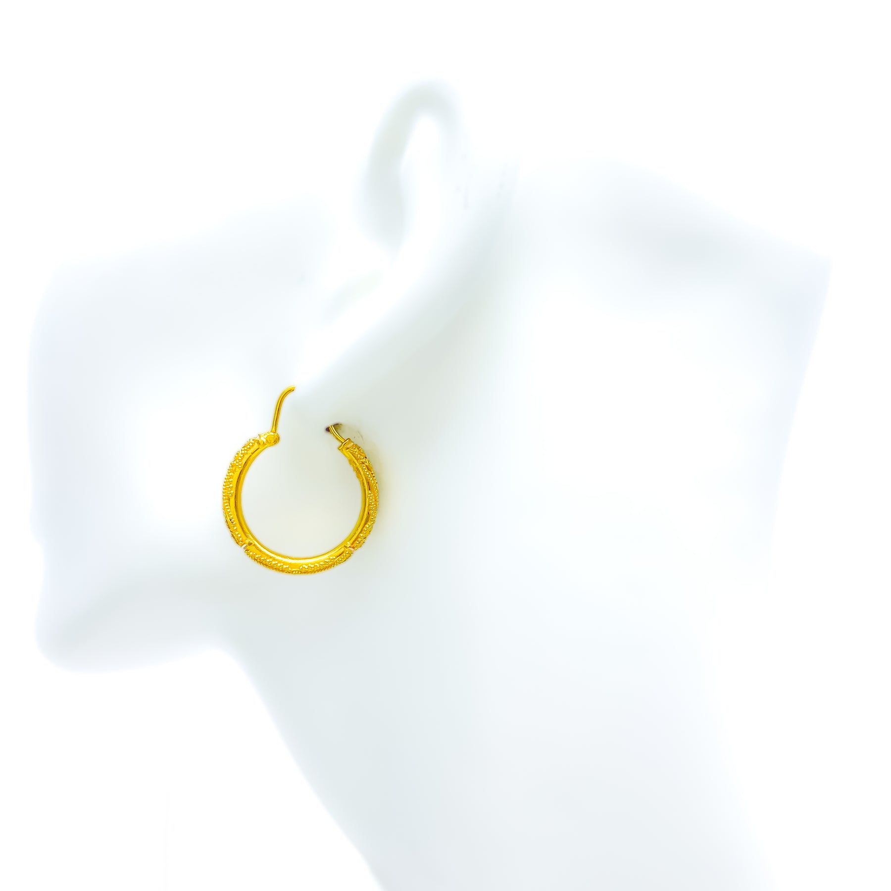 This refined pair of 22k yellow gold Bali earrings, weighing 7.6 grams, features a graceful hoop design that radiates timeless charm. The polished finish enhances their luminous brilliance, creating a versatile accessory. With a diameter of 0.8", they strike the perfect balance of subtlety and elegance. A classic choice that complements both everyday style and special occasions with sophistication.