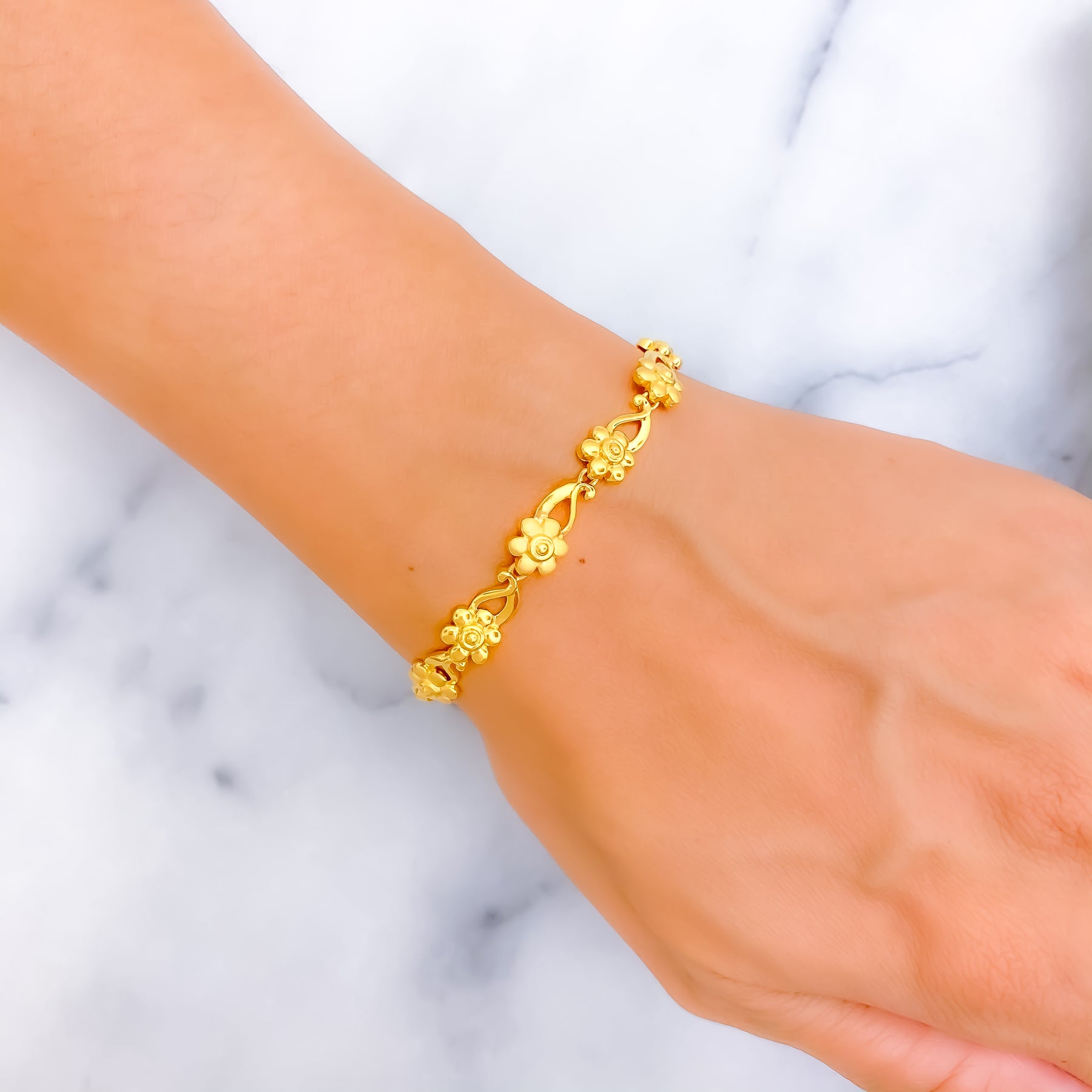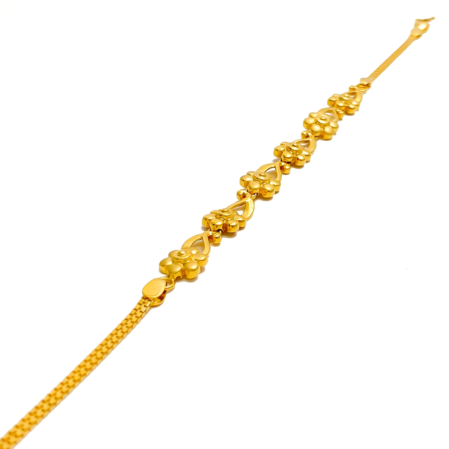 Crafted in 22k yellow gold with a weight of 9.6 grams, this graceful bracelet radiates timeless brilliance. The polished finish enriches its shimmering design, offering a luminous balance of elegance and charm. Measuring 7.8 inches in length, it drapes beautifully with versatile sophistication. Completed with a secure S lock, it is a refined jewel suited for both daily wear and festive occasions.