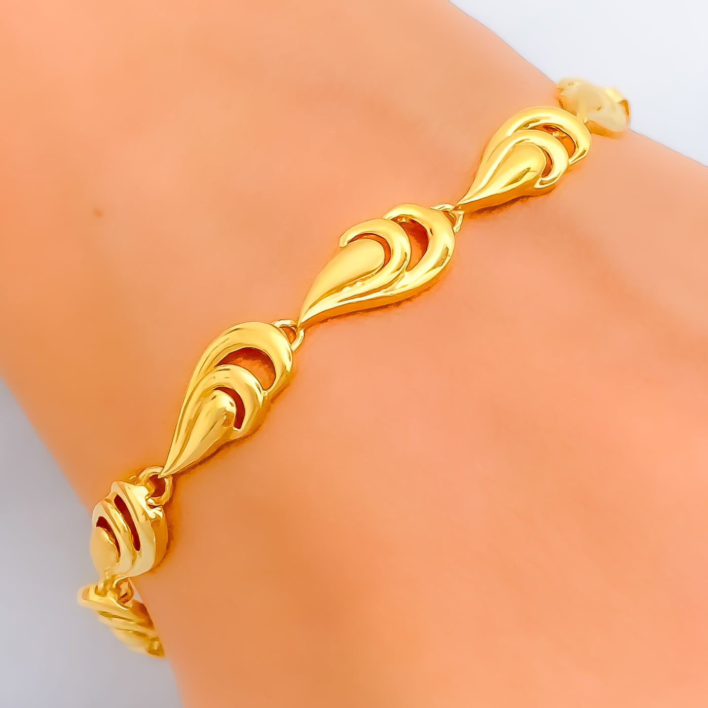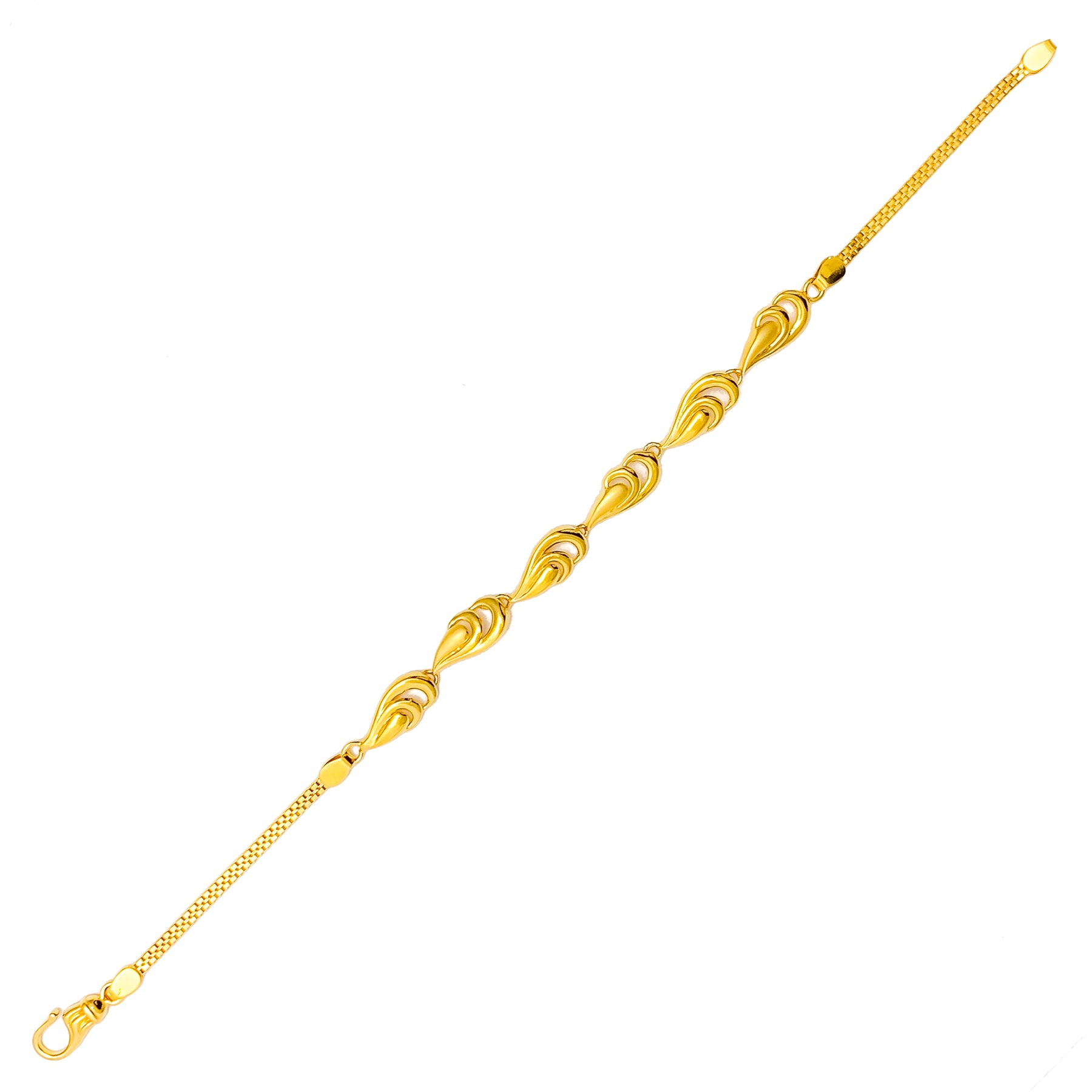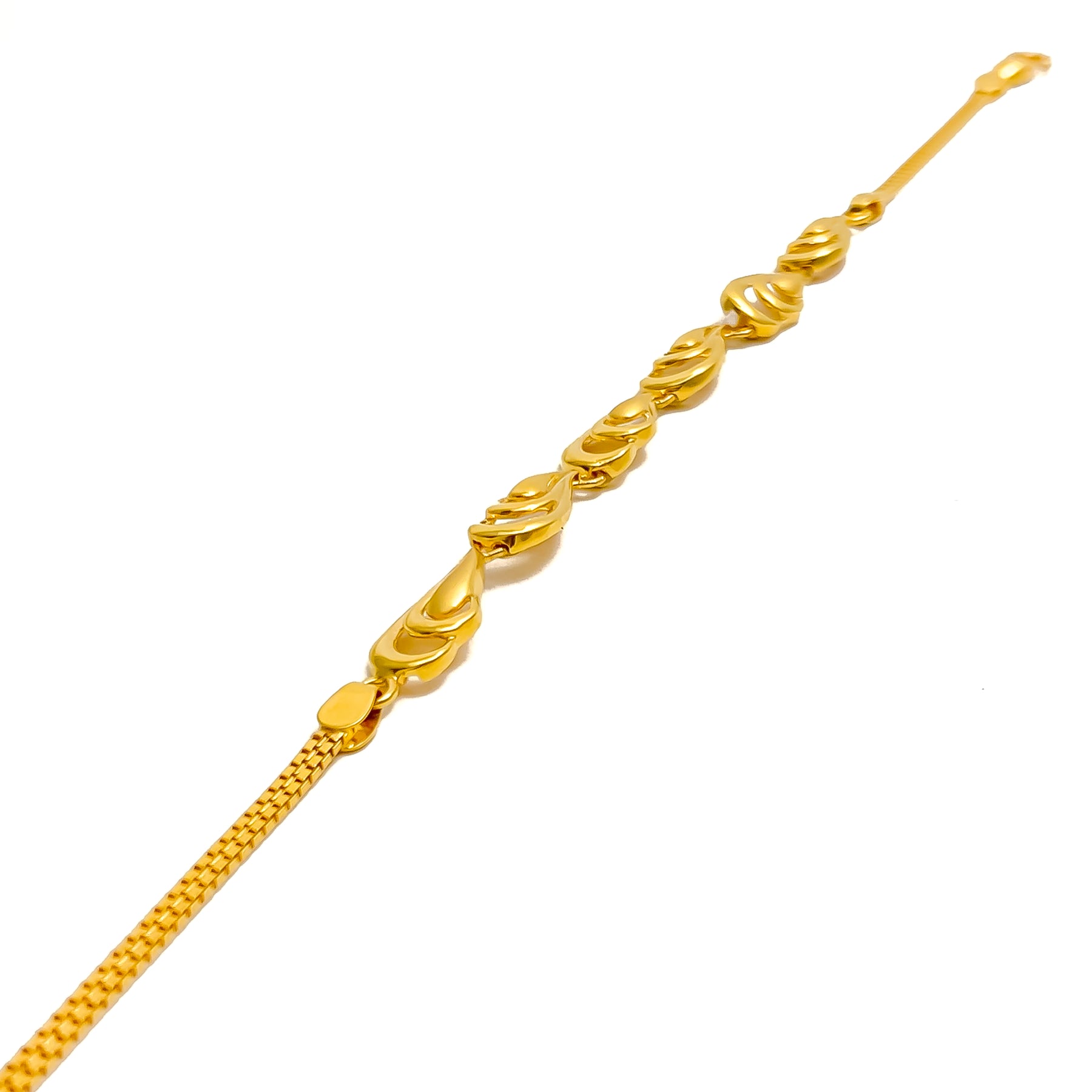 Crafted in 22k yellow gold with a weight of 7.1 grams, this delicate bracelet radiates graceful charm. The polished finish highlights its dainty design, creating a luminous harmony of refinement and sophistication. Measuring 7.5 inches in length, it drapes elegantly with versatile appeal. Completed with a secure S lock, it is a timeless jewel for both everyday wear and special occasions.