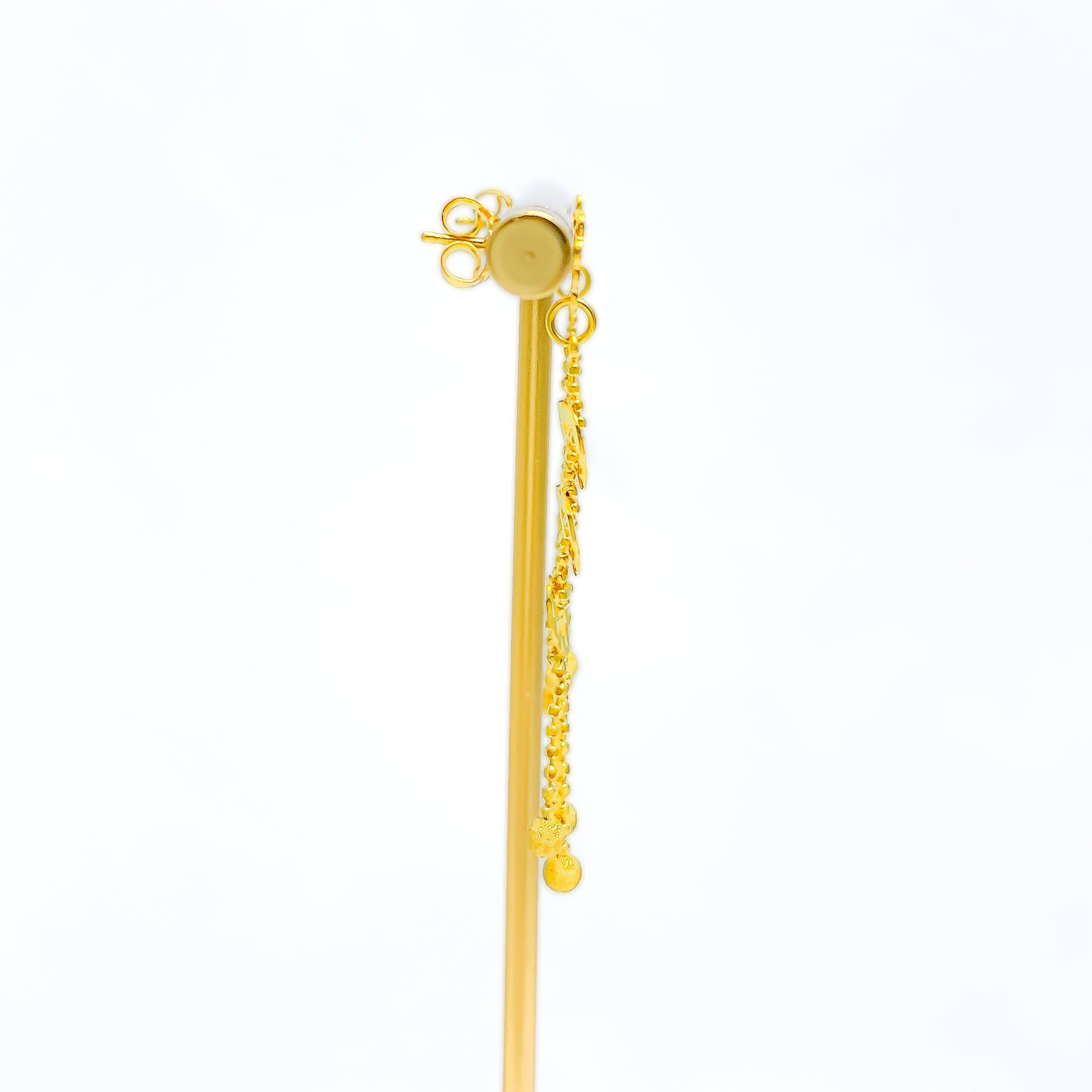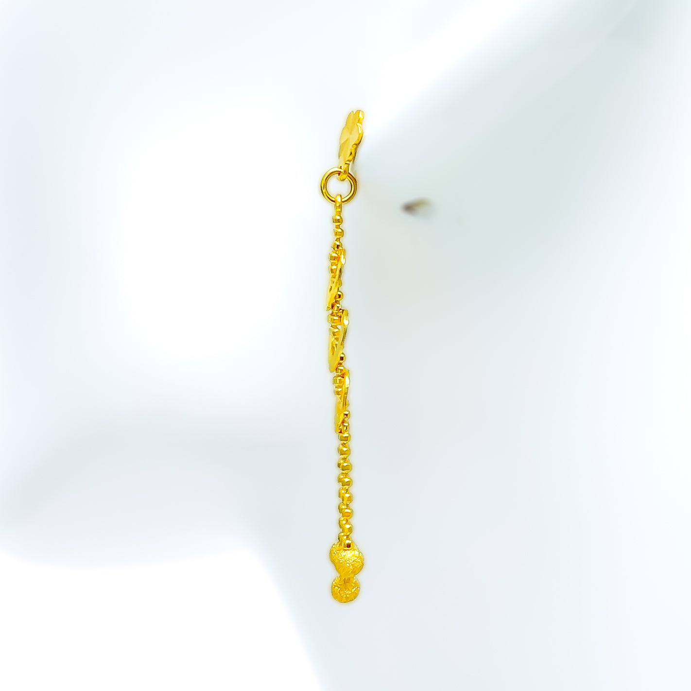 Gracefully designed, these 22k gold earrings feature delicate heart motifs that embody romance and sophistication. Weighing 4.0 grams, their 2.1-inch hanging design creates an elegant flow with every movement. The yellow gold finish enhances their radiant allure. Ideal for adding a charming, timeless touch to any outfit.