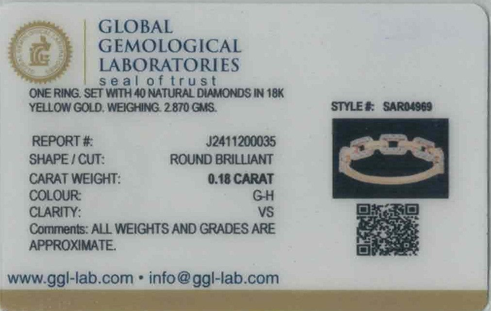 Exquisitely crafted, this 18k yellow gold diamond ring radiates sophistication through its elegant and refined design. Weighing 2.87 grams, it blends luxurious craftsmanship with timeless allure. The 0.18ct of G-H color, VS quality round brilliant-cut diamonds sparkle with captivating brilliance. Sized 7.25 with re-sizing available, it’s a graceful statement of enduring elegance.
