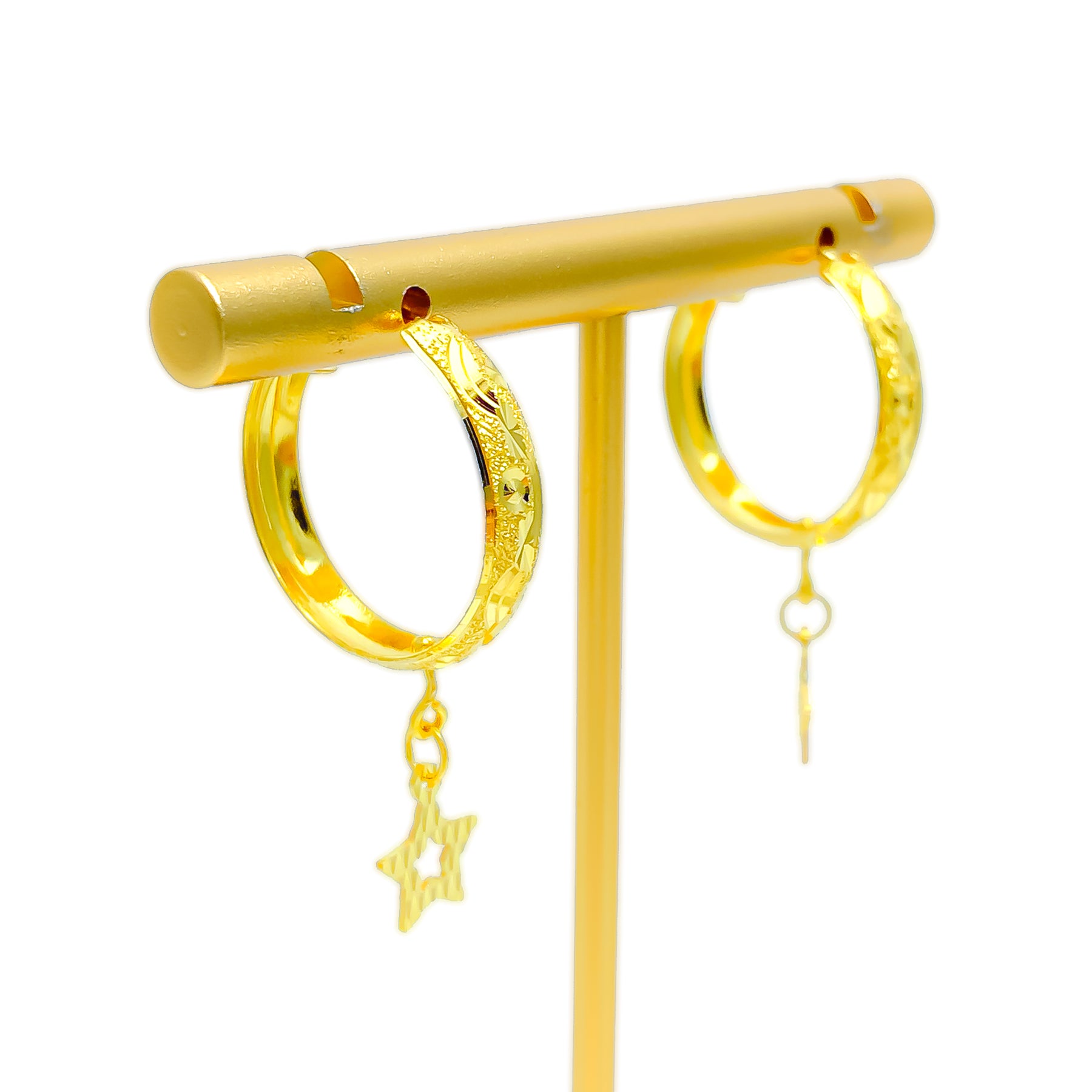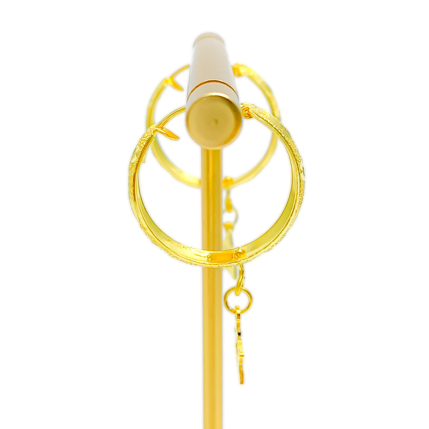 Radiant and intricately designed, these 22k gold hoops capture classic charm with refined detail. Weighing 3.6 grams and measuring 0.75 inches in diameter with a 1.3-inch length, they blend elegance and artistry seamlessly. The polished yellow gold finish enhances their luminous texture, perfect for adding sophistication to any ensemble.