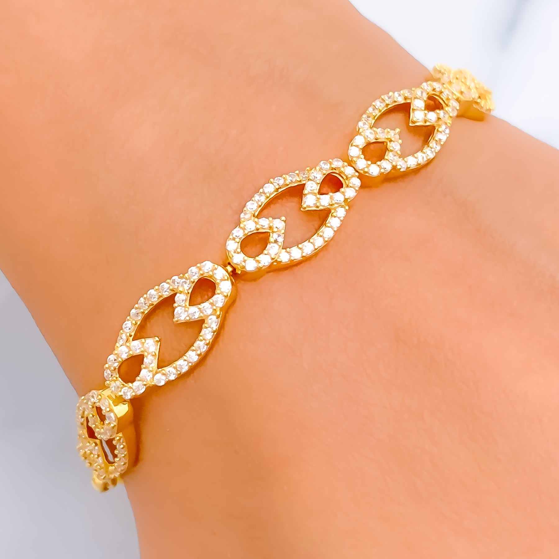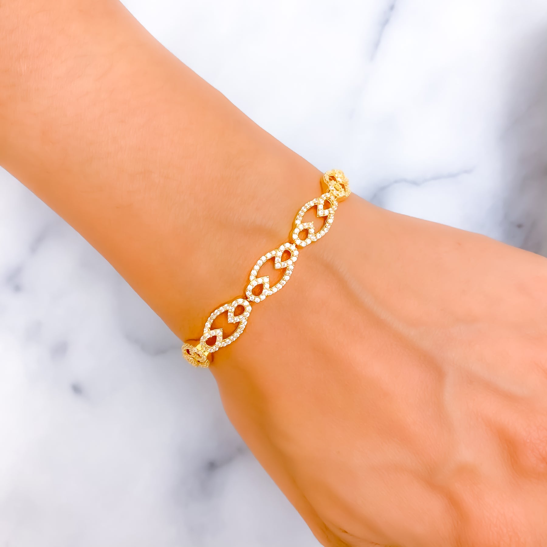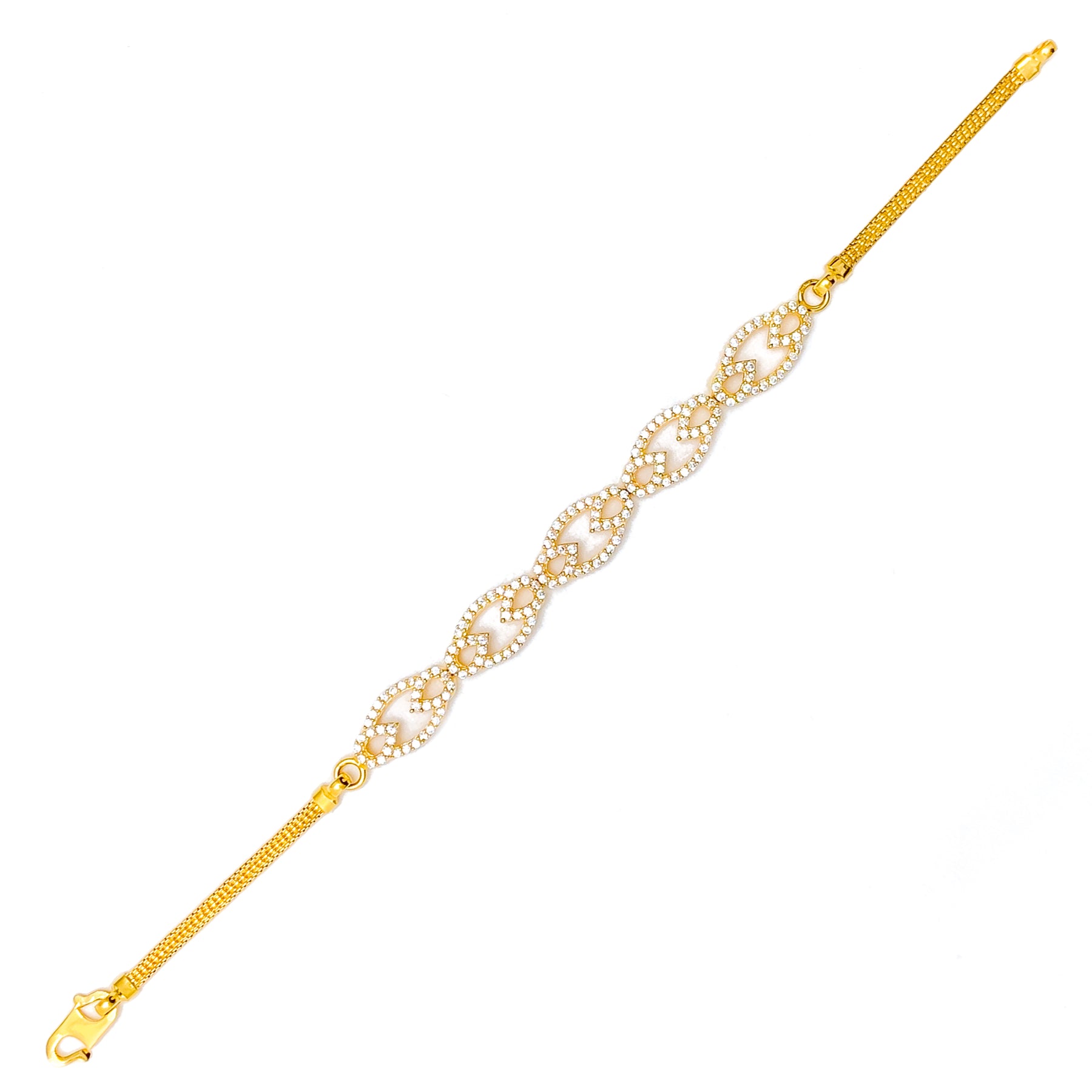 This elegant 22k yellow gold bracelet, weighing 7.1 grams, features a decorative design beautifully accented with sparkling cubic zirconia. The polished finish enhances its radiant brilliance, creating refined charm. Measuring 6.75" in length, it secures comfortably with an S lock. A sophisticated piece that blends timeless craftsmanship with contemporary elegance, perfect for elevating both daily wear and special occasions.
