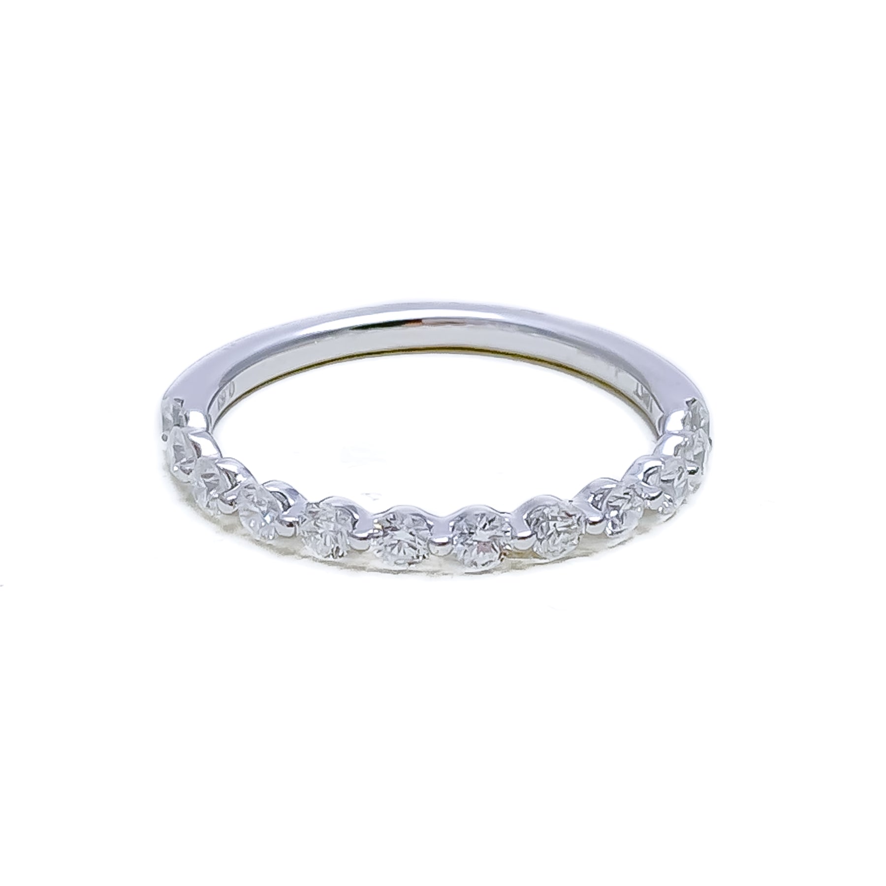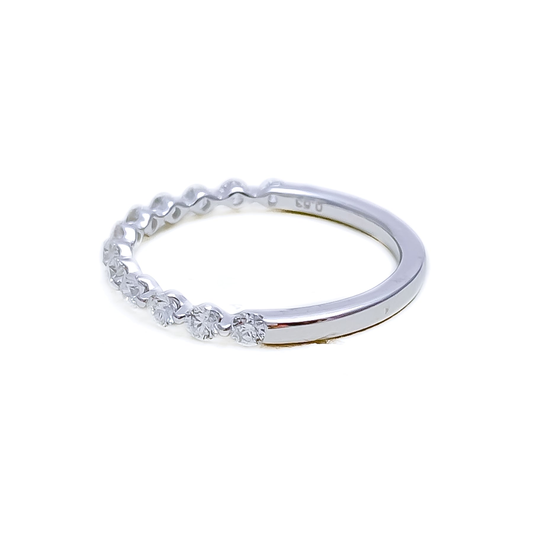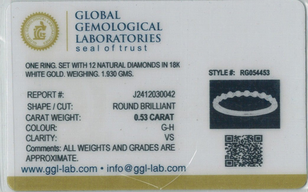 Crafted in luminous 18k white gold and weighing 1.9 grams, this elegant band sparkles with 0.53 carats of round brilliant cut diamonds, graded G-H in color and VS in clarity. The polished finish enhances the ring’s radiant presence, offering a perfect balance of grace and brilliance. Sized at 7 with re-sizing available, this piece is ideal as a standalone stunner or a luxurious complement to a stacked look—effortlessly elevating any ensemble.