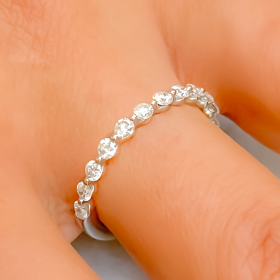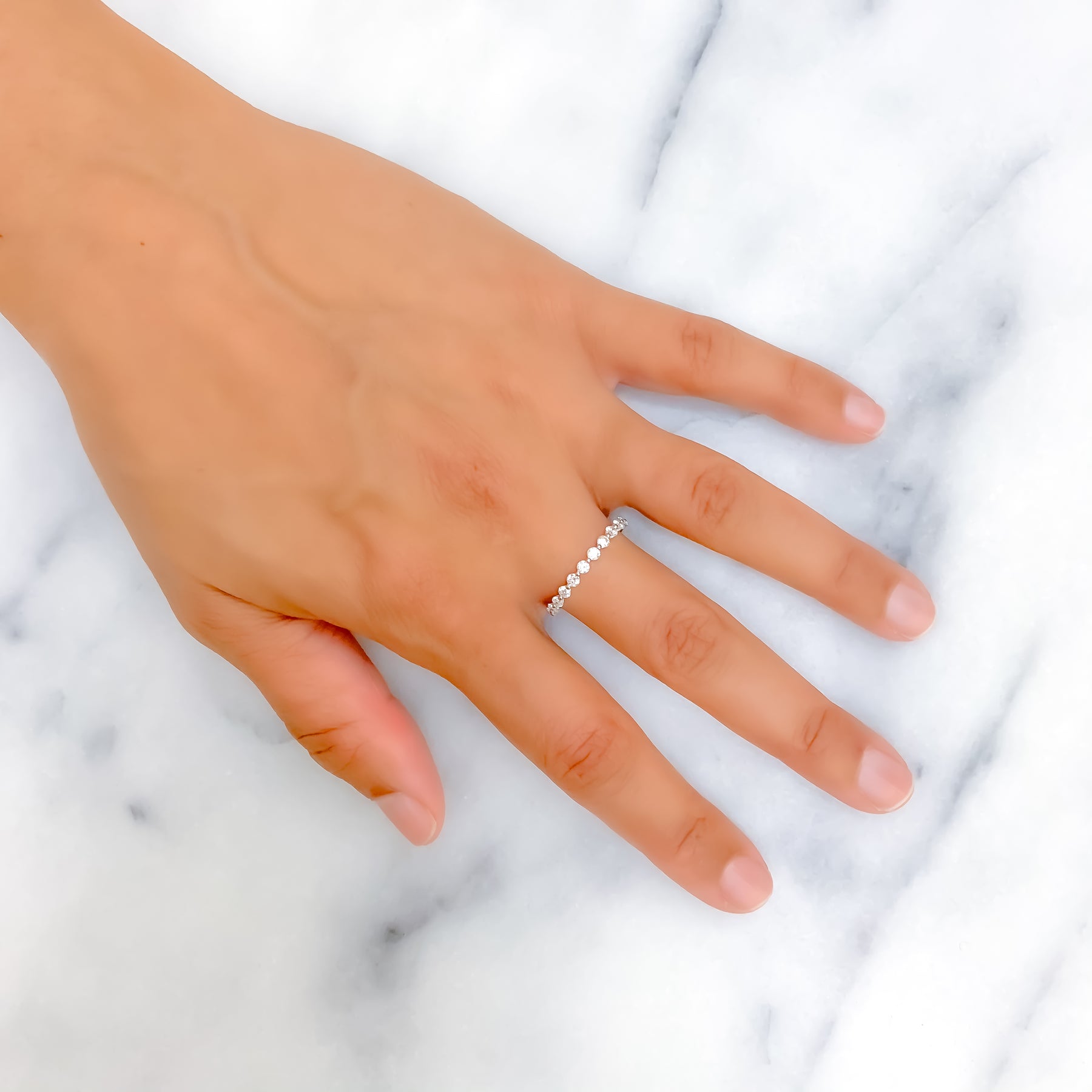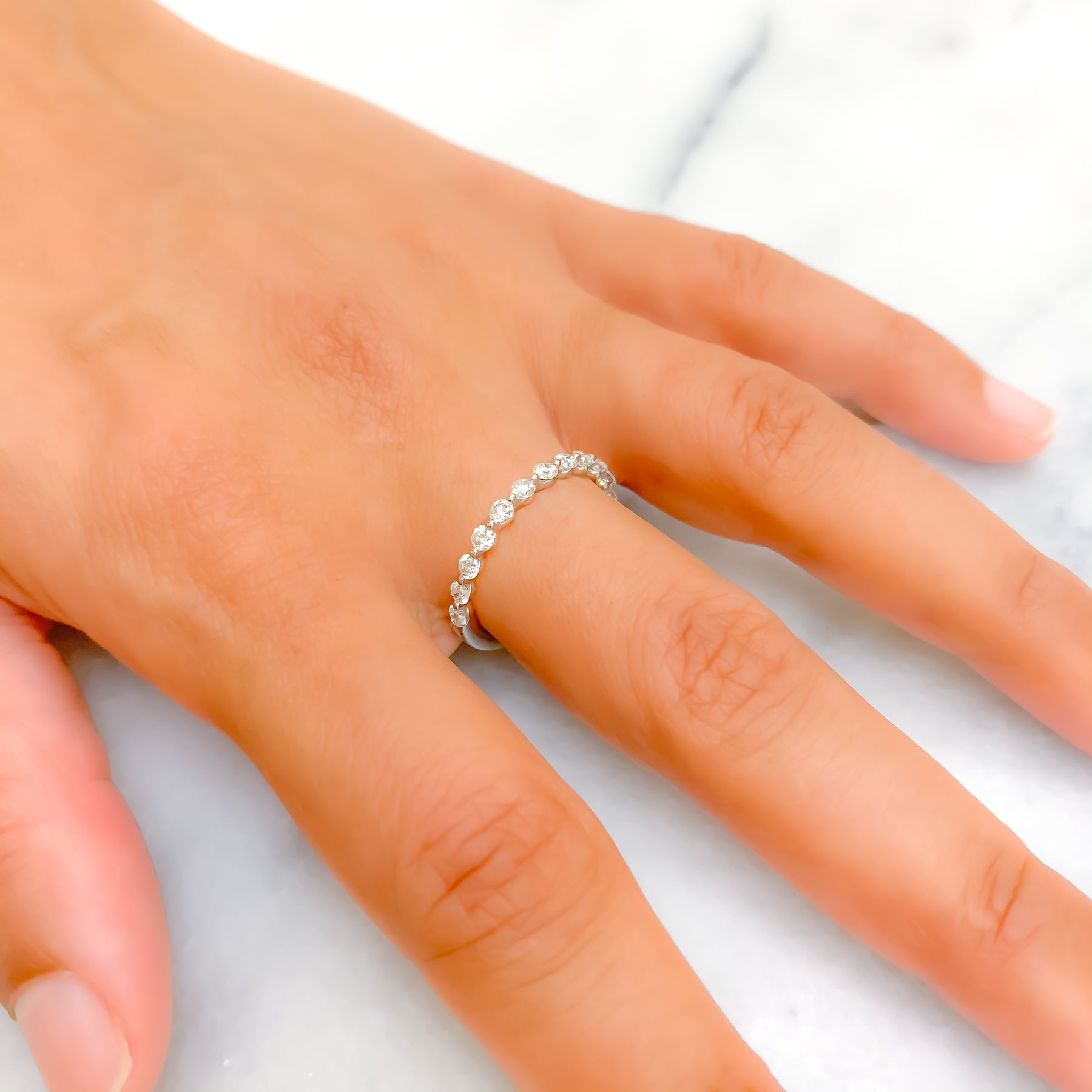 Crafted in luminous 18k white gold and weighing 1.9 grams, this elegant band sparkles with 0.53 carats of round brilliant cut diamonds, graded G-H in color and VS in clarity. The polished finish enhances the ring’s radiant presence, offering a perfect balance of grace and brilliance. Sized at 7 with re-sizing available, this piece is ideal as a standalone stunner or a luxurious complement to a stacked look—effortlessly elevating any ensemble.