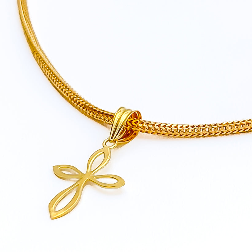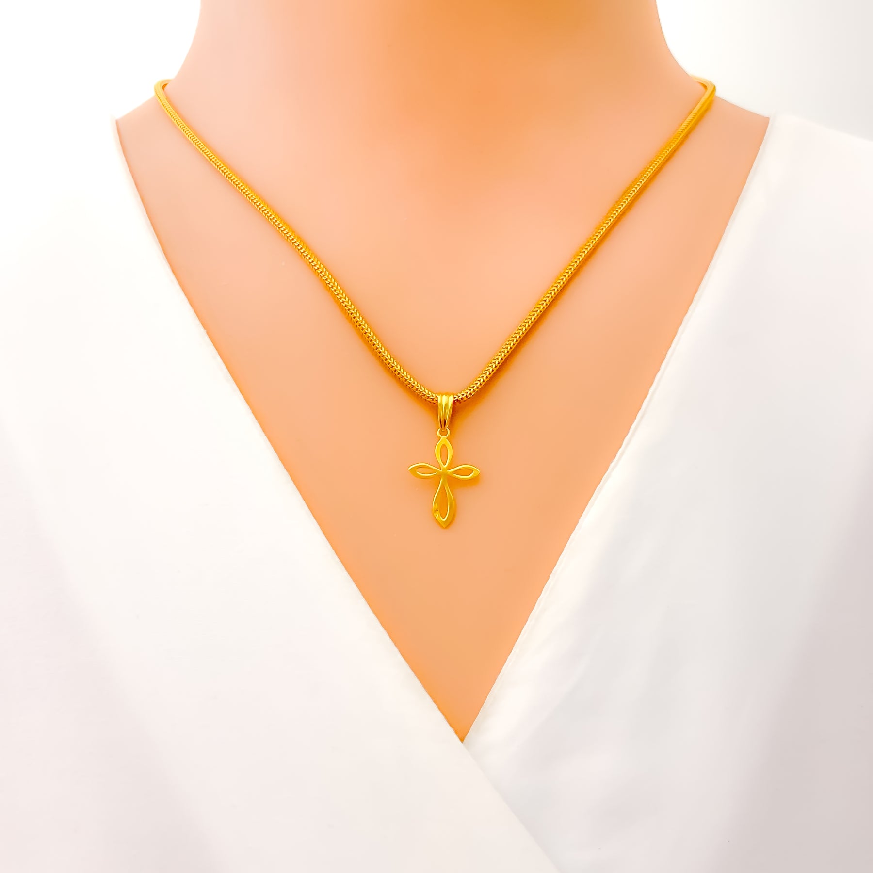 Crafted from radiant 22k yellow gold, this pendant showcases a graceful cross design with a luminous polished finish. Its petite 1" length offers subtle elegance, perfect for layering or wearing alone. Weighing just 0.6 grams, it is light and comfortable for daily wear. A timeless accessory, it beautifully blends simplicity with meaningful charm.