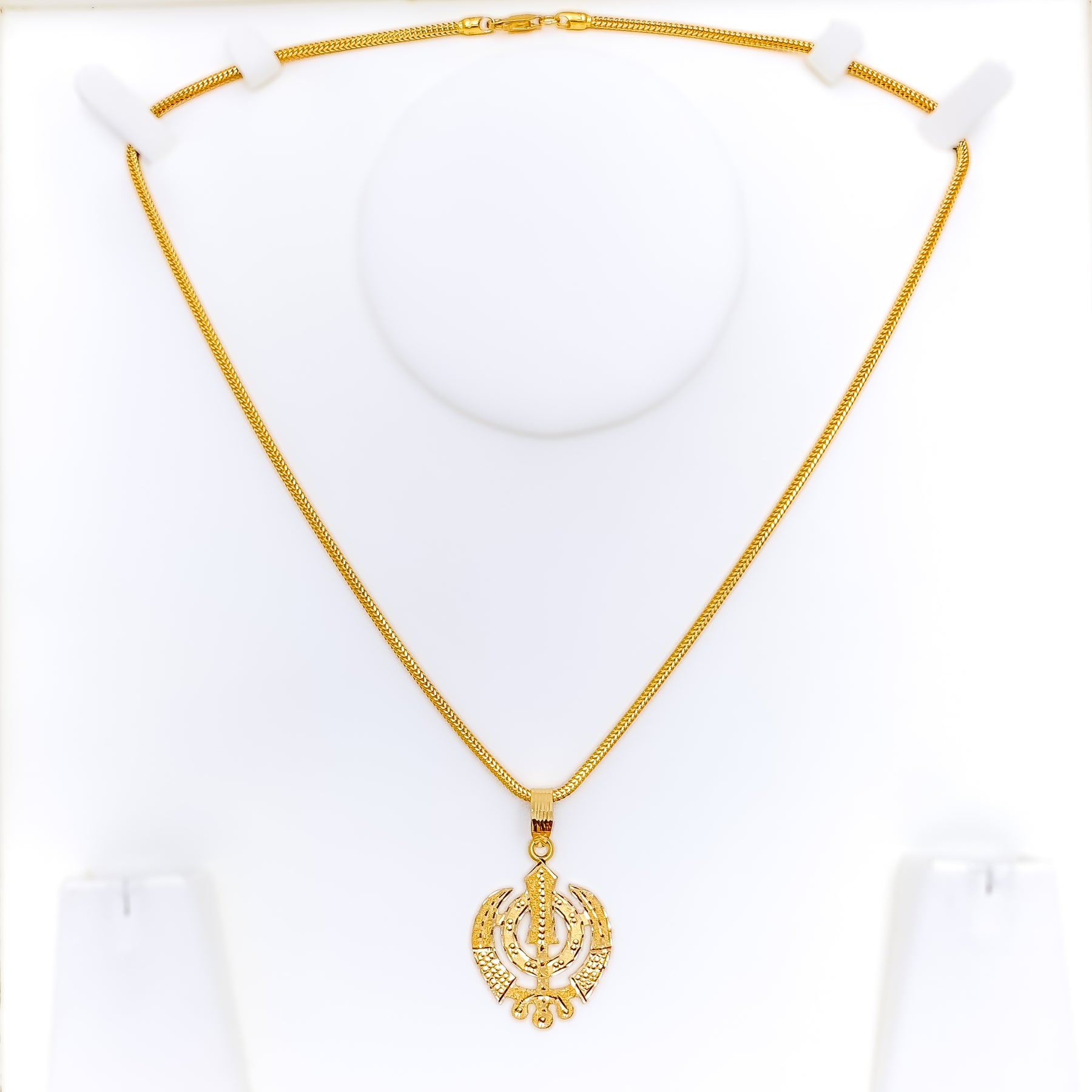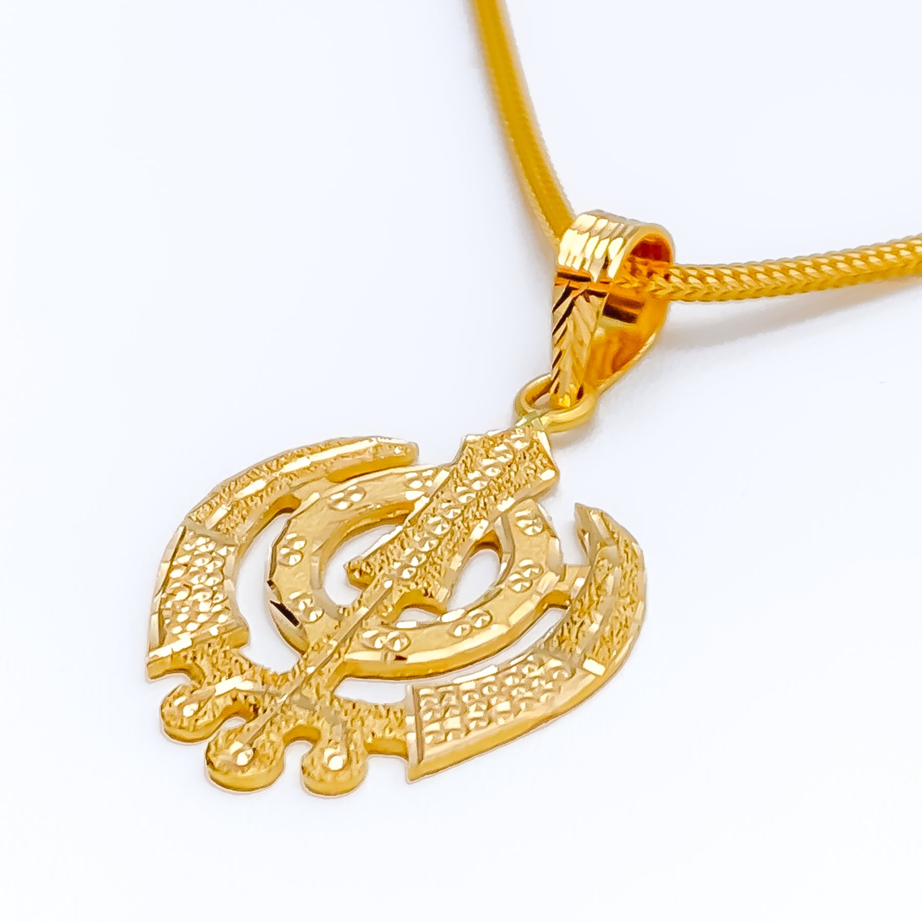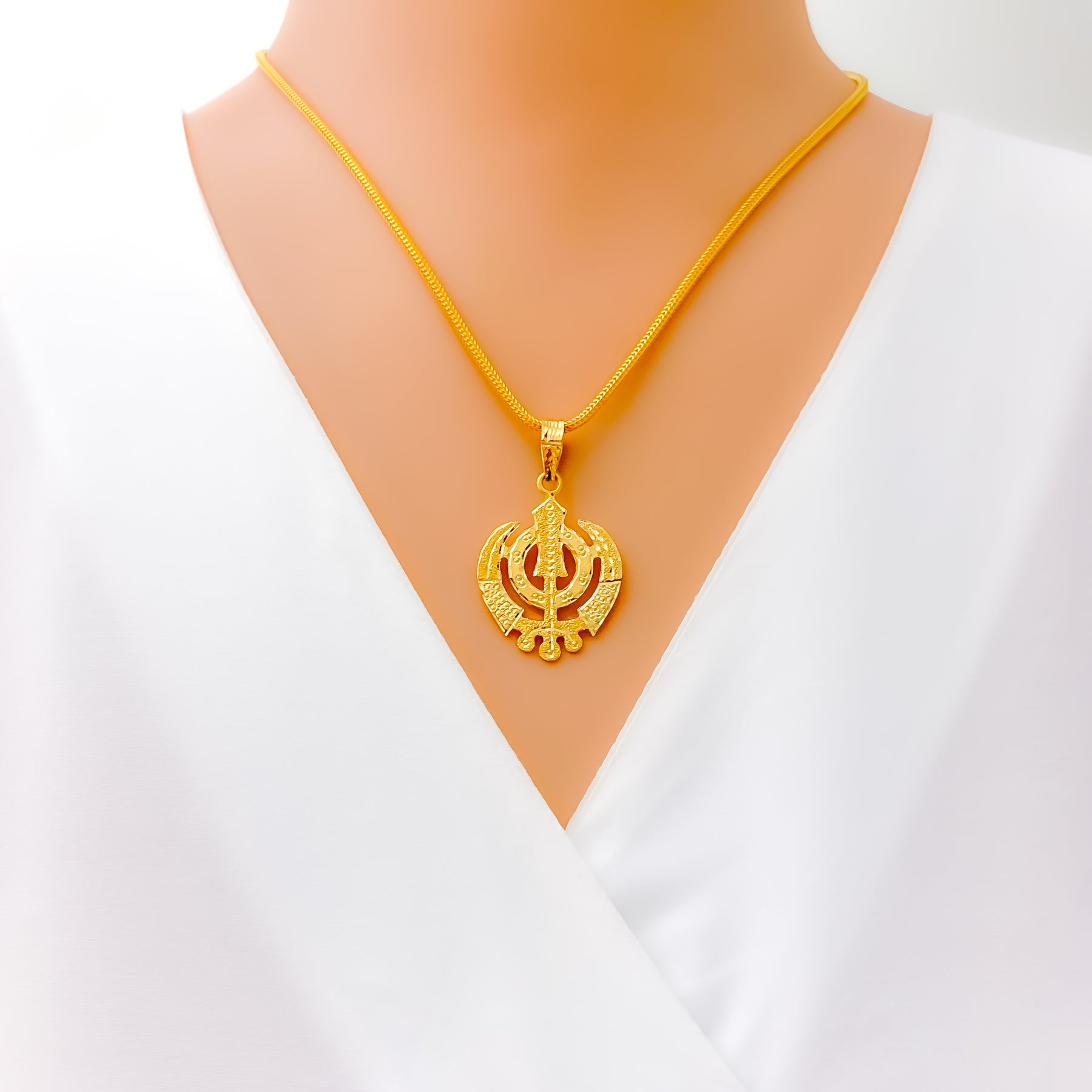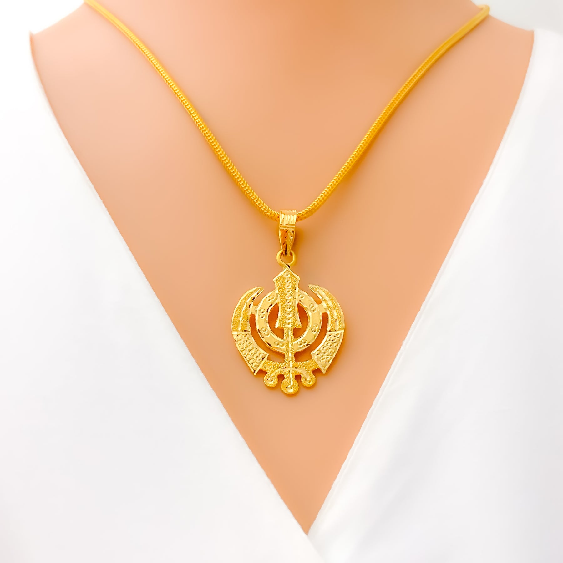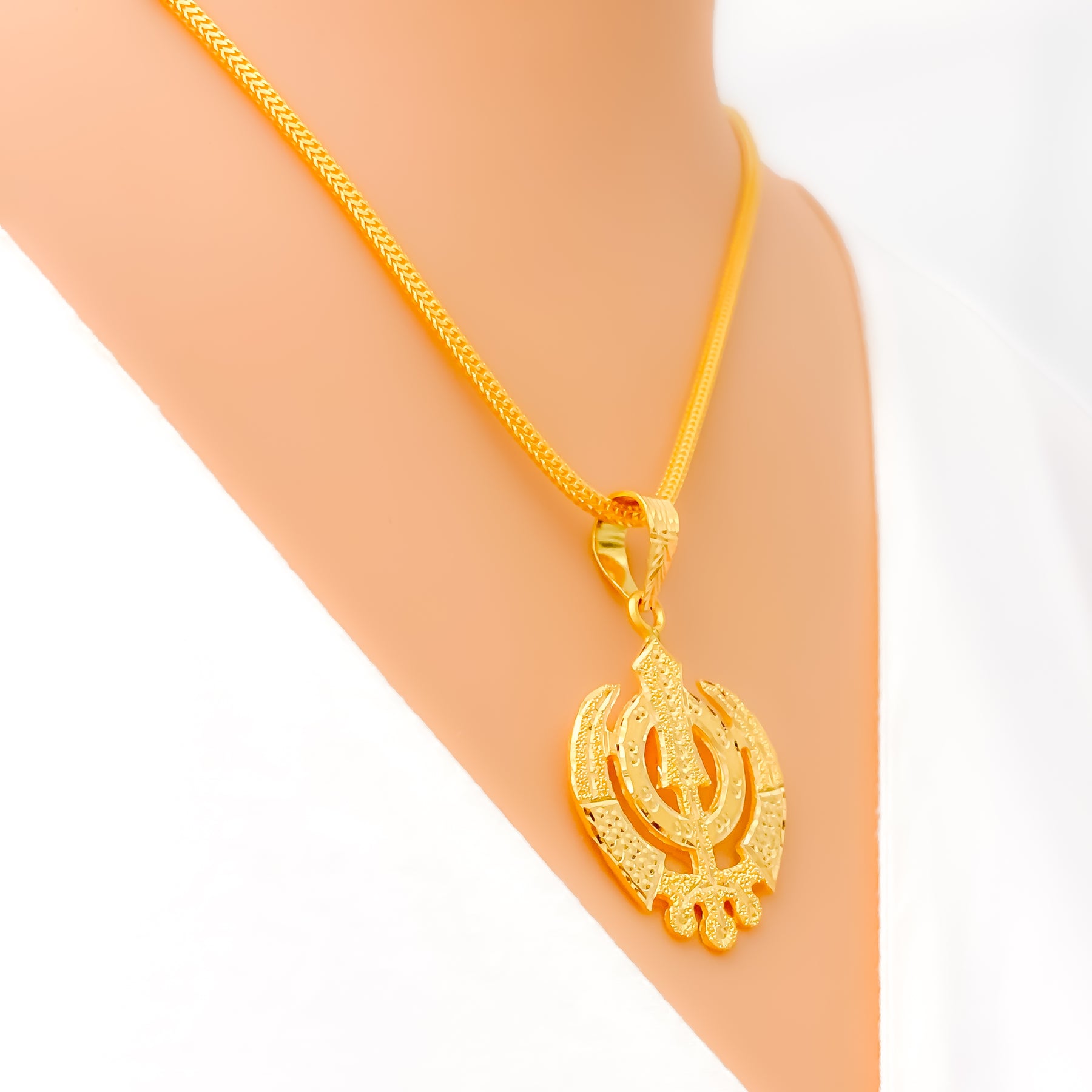 This luxurious Khanda pendant, crafted from 22k yellow gold, weighs 7.0 grams and reflects both elegance and devotion. Measuring 1.7 inches in length, it offers a bold yet refined presence that makes a meaningful statement. The polished finish enhances its fine craftsmanship, creating a radiant glow. Designed without a chain, it allows flexible styling with your choice of necklace.