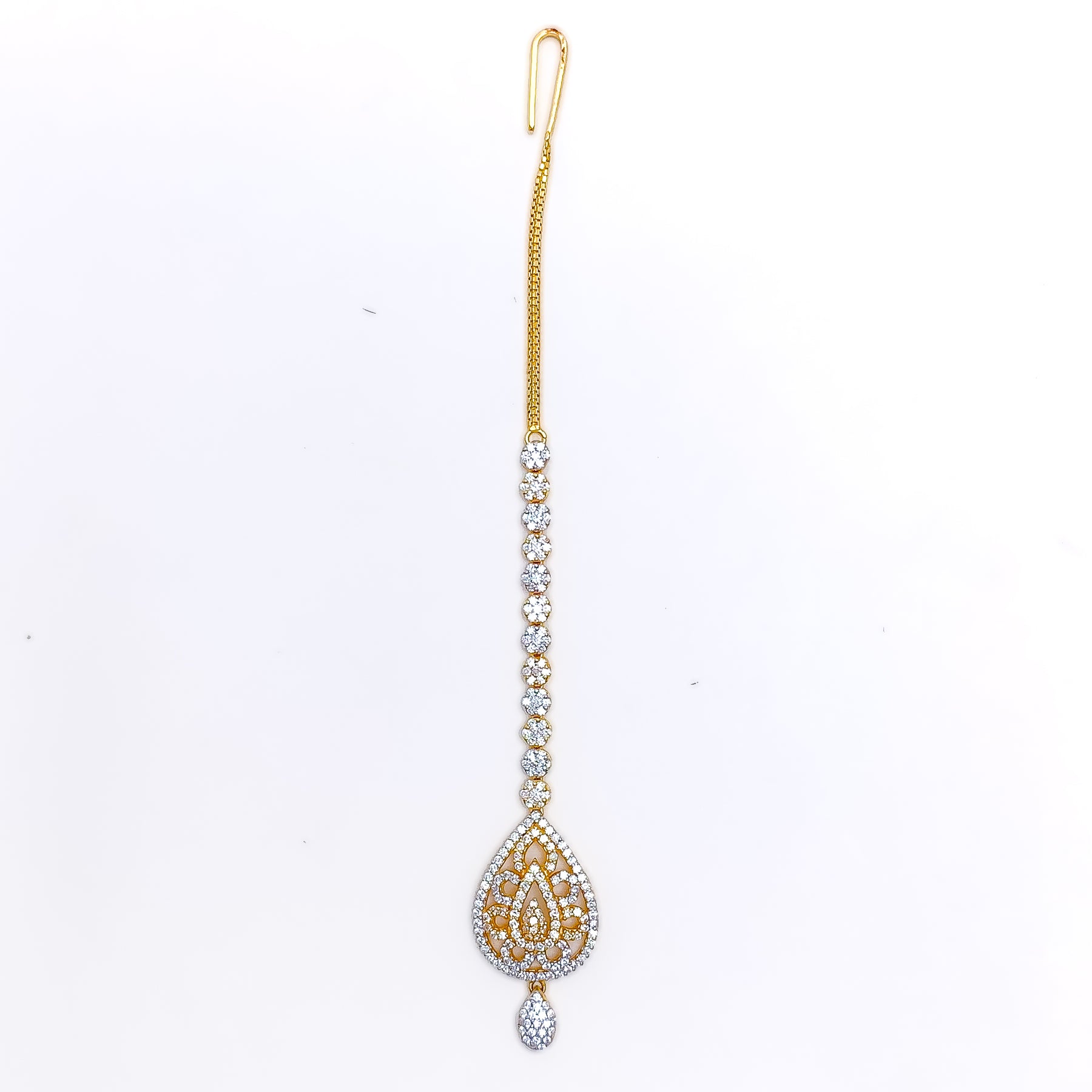 Crafted in 22k yellow gold with a weight of 8.9 grams, this ornate tikka radiates graceful brilliance. Sparkling cubic zirconia stones enrich its polished finish, creating a luminous balance of elegance and charm. Measuring 5.5 inches in length, the drop design drapes beautifully with timeless appeal. Completed with a secure hook clasp, it is a refined accessory for weddings and festive occasions.