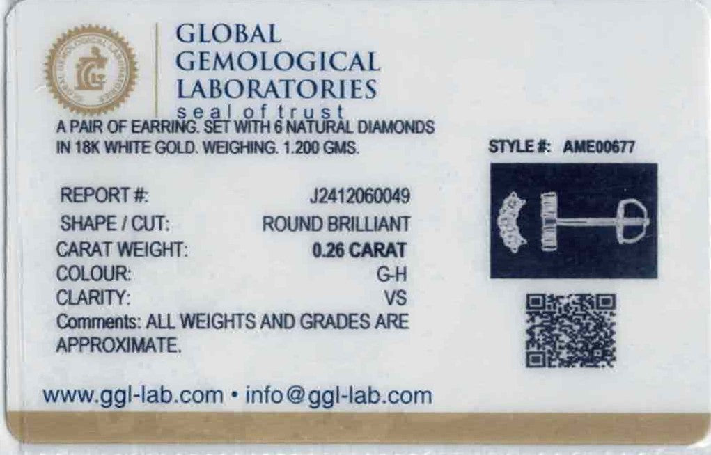 Airy in design, these 18k white gold diamond earrings weigh 1.2 grams and feature round brilliant cut diamonds totaling 0.26 carats in G–H color with VS clarity, finished with a sleek polished glow. Styled as refined tops, the delicate crescent silhouette measures 0.25 inches in length, offering subtle sparkle with graceful balance. Secure screw-back posts ensure comfortable, confident wear while maintaining a clean, modern profile. GGL certified and thoughtfully crafted, these earrings deliver timeless elegance ideal for everyday luxury and refined occasions.