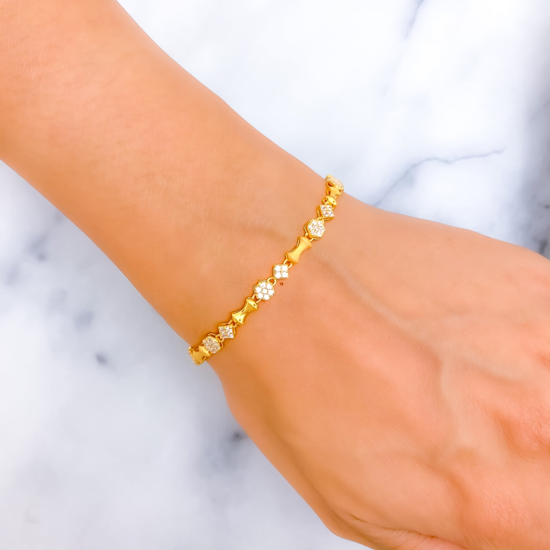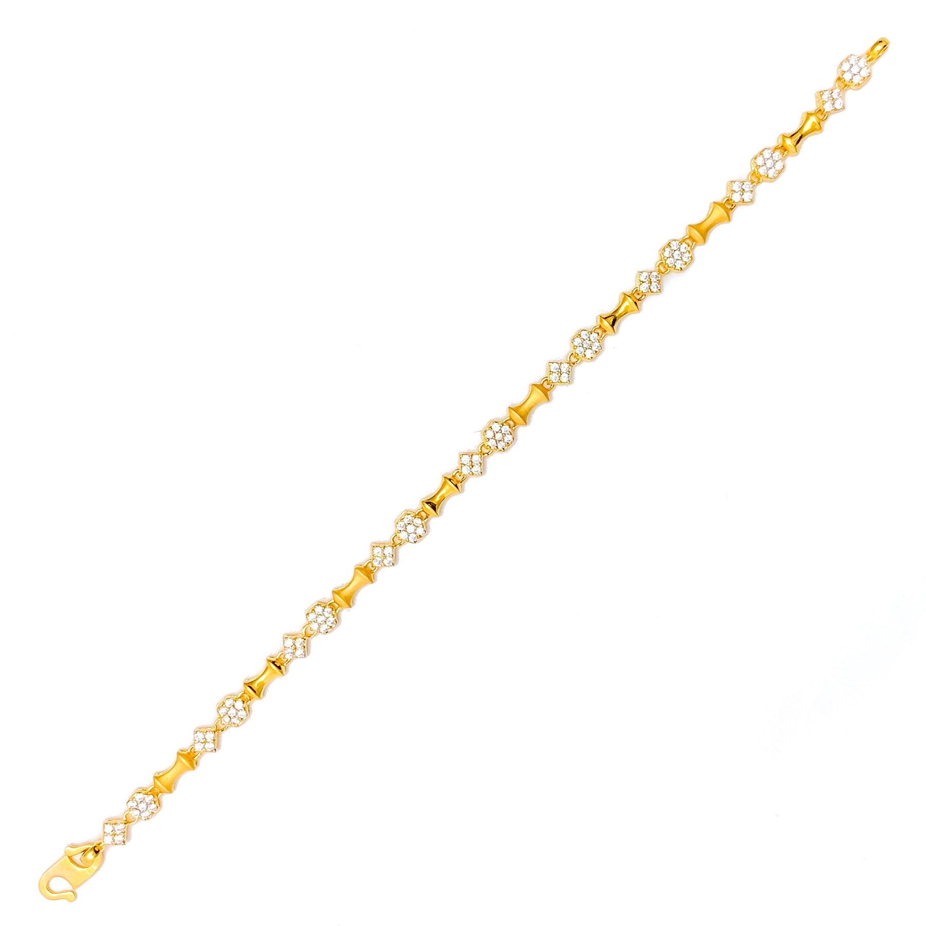 This elegant 22k yellow gold bracelet, weighing 6.9 grams, showcases a chic design accented with sparkling cubic zirconia. The polished finish enhances its radiant brilliance, adding timeless appeal. Measuring 6.8" in length, it secures comfortably with an S lock. A versatile accessory that blends modern sophistication with classic elegance, perfect for everyday wear or special occasions.