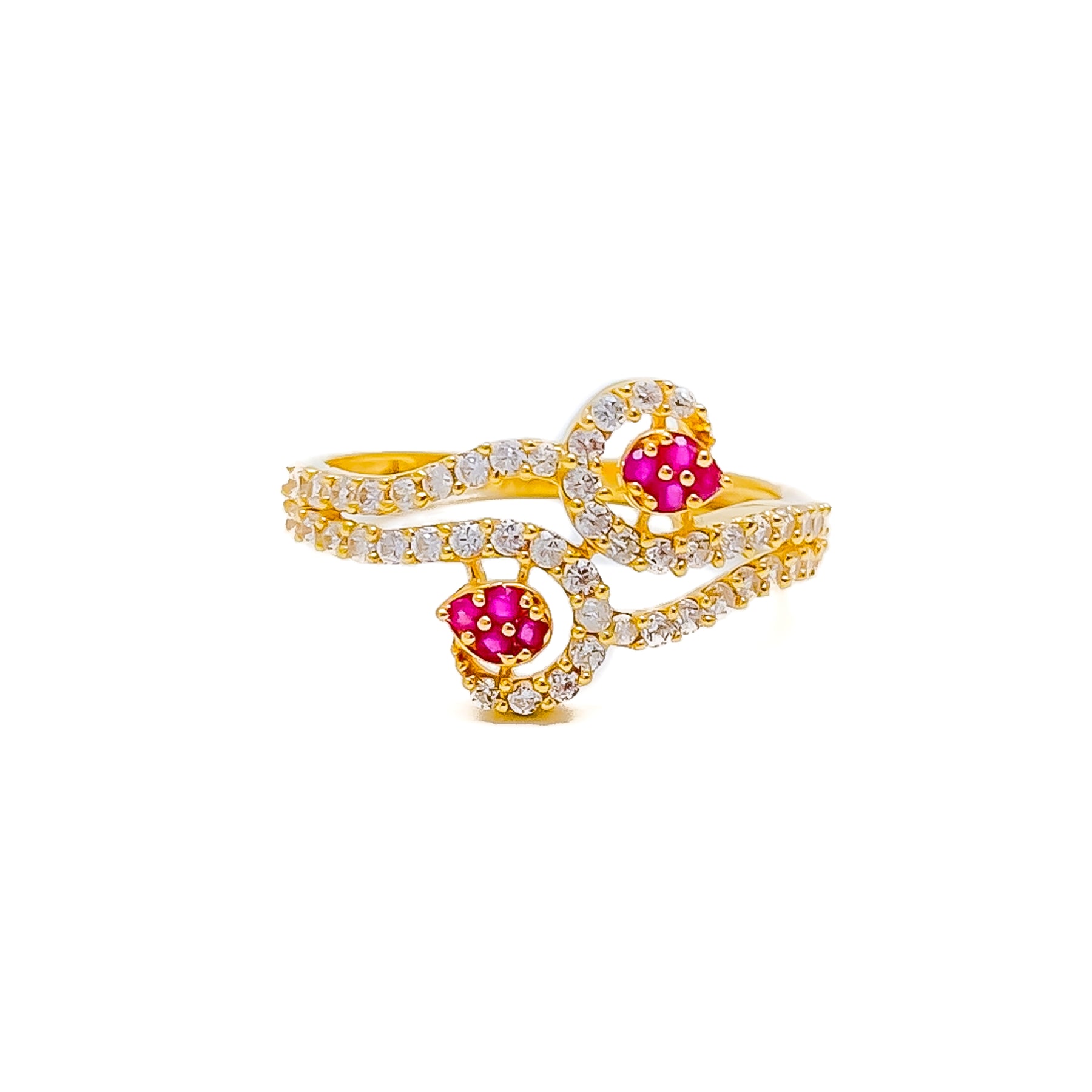Radiating refined charm, this 22k yellow gold ring features a gleaming finish complemented by brilliant cubic zirconia accents. Its graceful design makes it a versatile piece for both everyday elegance and festive occasions. The balanced silhouette offers a classic yet polished look. Ring sizing can be customized for a seamless, tailored fit.