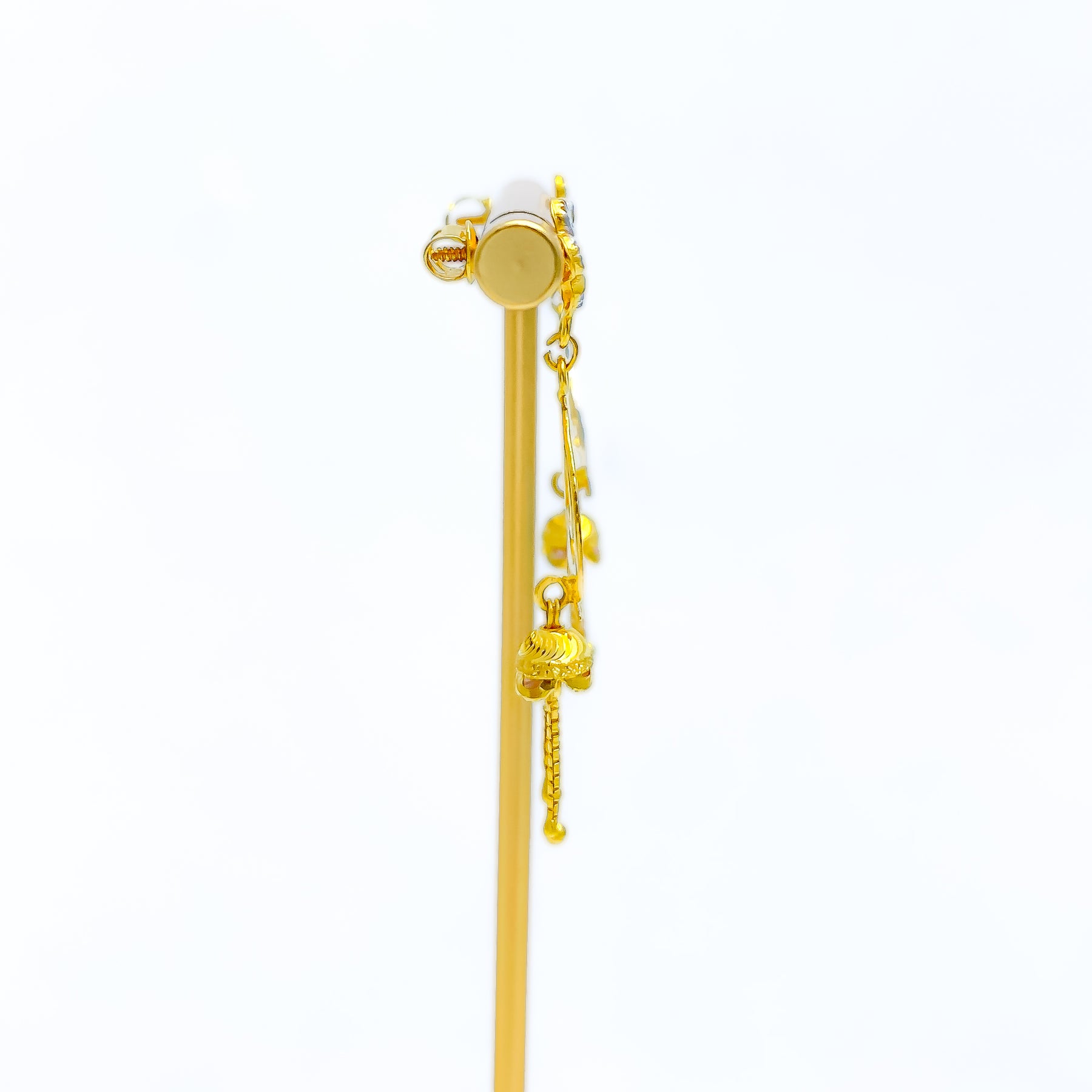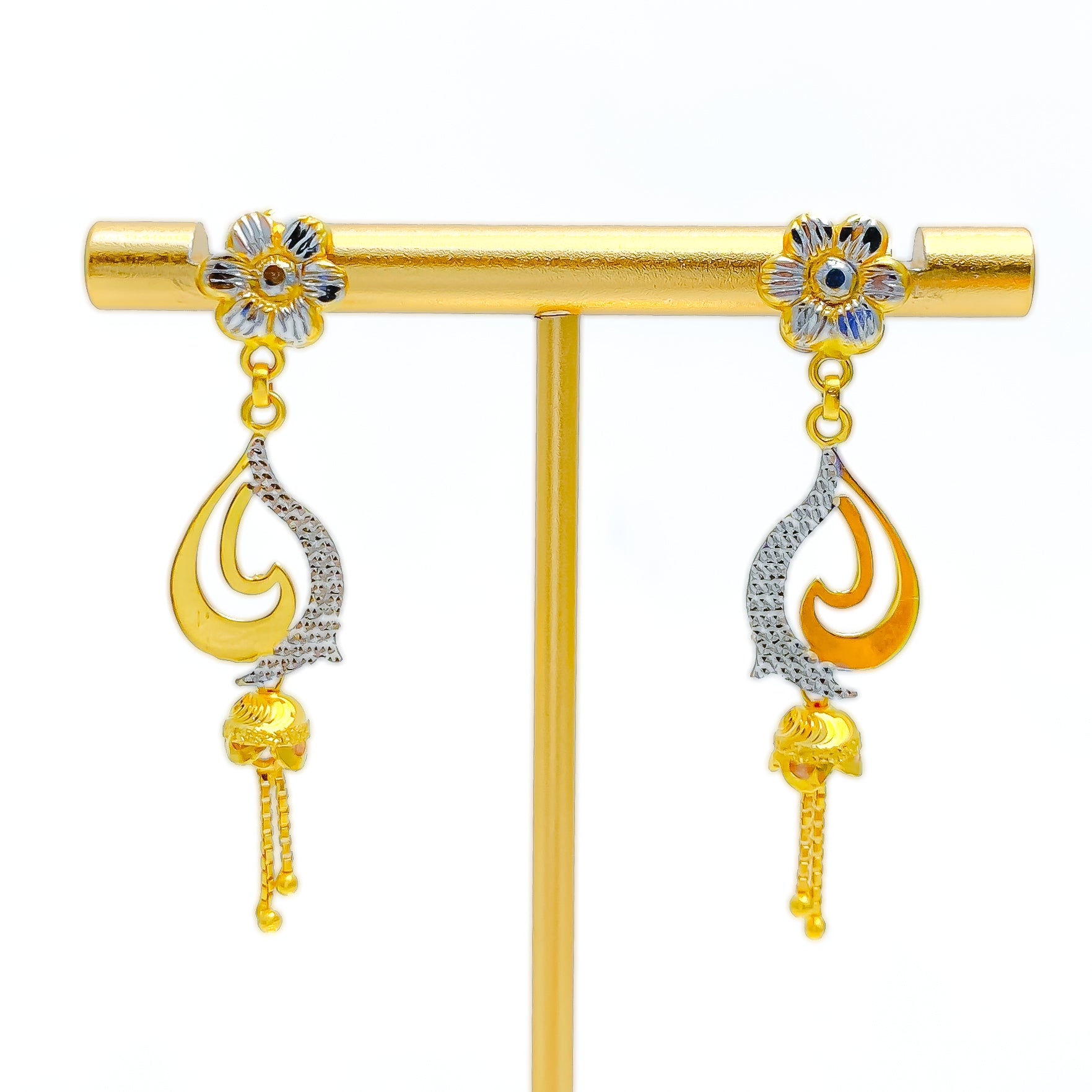 Radiating sophistication, these 22k gold earrings showcase a captivating mix of yellow and white gold for a luxurious dual-tone finish. Weighing 4.5 grams, their 1.8-inch hanging design moves gracefully with every gesture. The screw-back post ensures comfort and security. Perfect for adding timeless elegance to any ensemble.