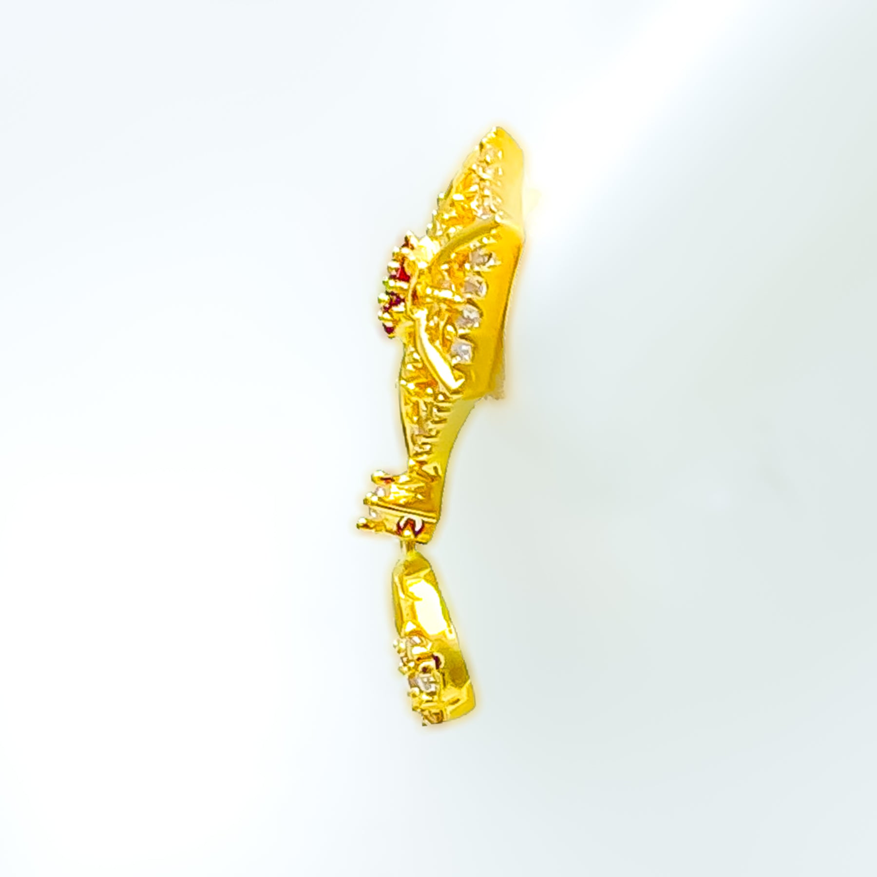 Vibrant and stylish, these 22k gold earrings feature an eye-catching blend of multicolored cubic zirconia stones set in radiant yellow gold. Their 1" length adds a bold yet wearable touch, perfect for both festive and modern looks. The rich hues create a joyful statement while maintaining refined elegance. Completed with secure screw-back posts, they’re crafted for confident daily or occasional wear.