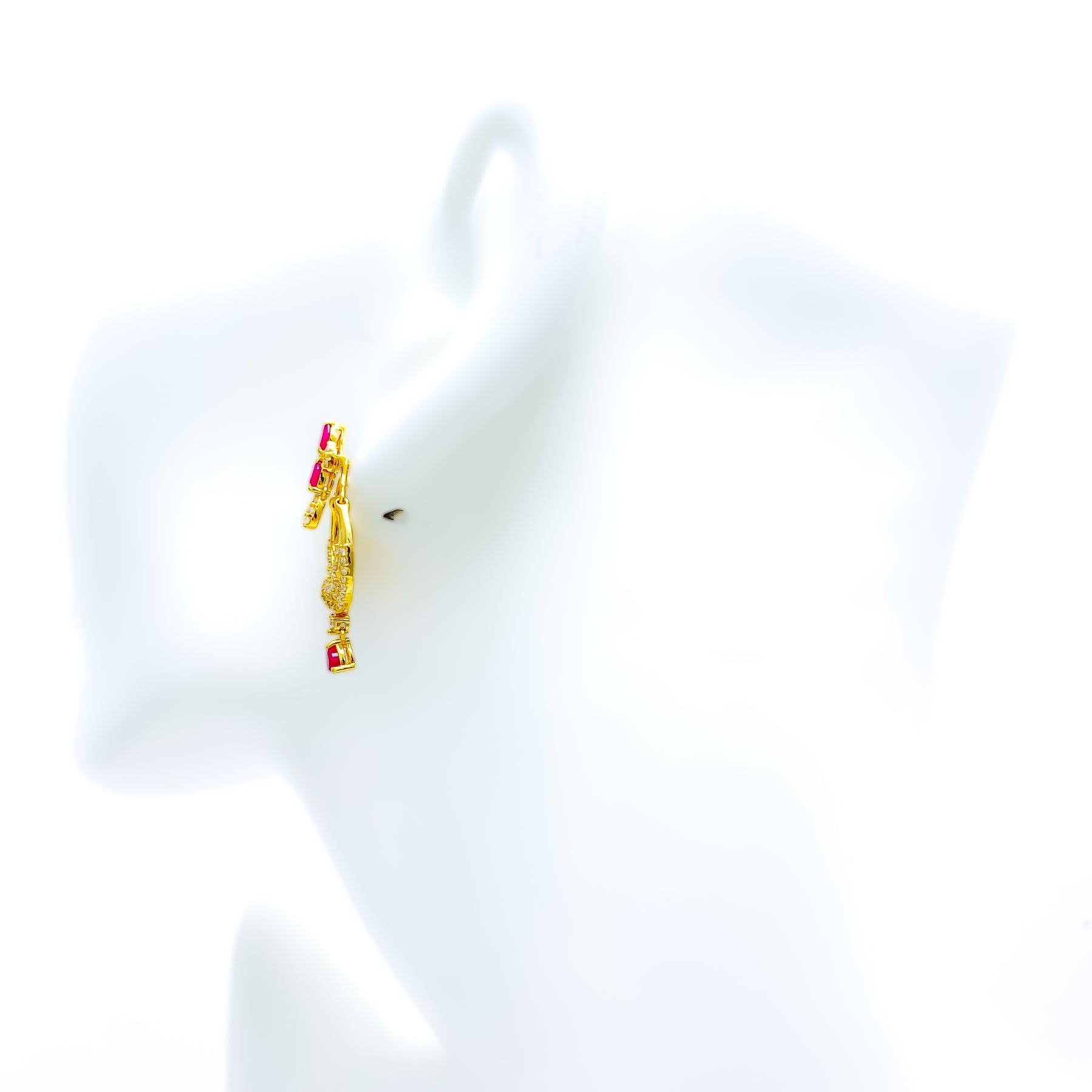 These luminous hanging earrings feature sparkling CZ stones that enhance their elegant 1.4-inch silhouette with refined radiance. The 7.0-gram yellow gold design offers a graceful balance of noticeable presence and comfortable wear, making them ideal for both special occasions and elevated daily styling. Their dainty yet opulent form introduces a touch of sophistication that complements a wide range of looks with ease. Finished with secure screw backs, they bring a timeless and versatile charm to any thoughtfully curated jewelry collection.