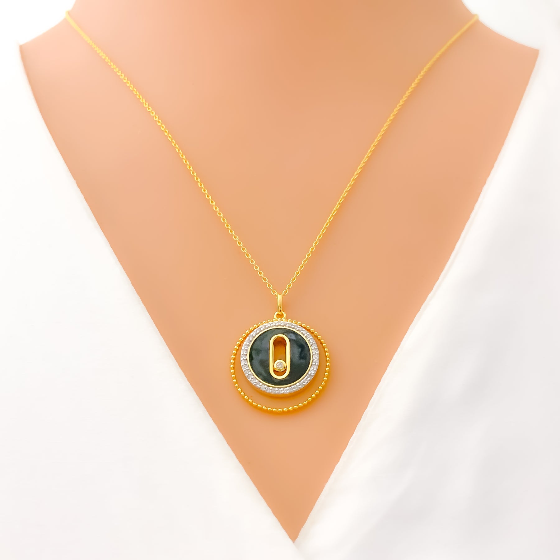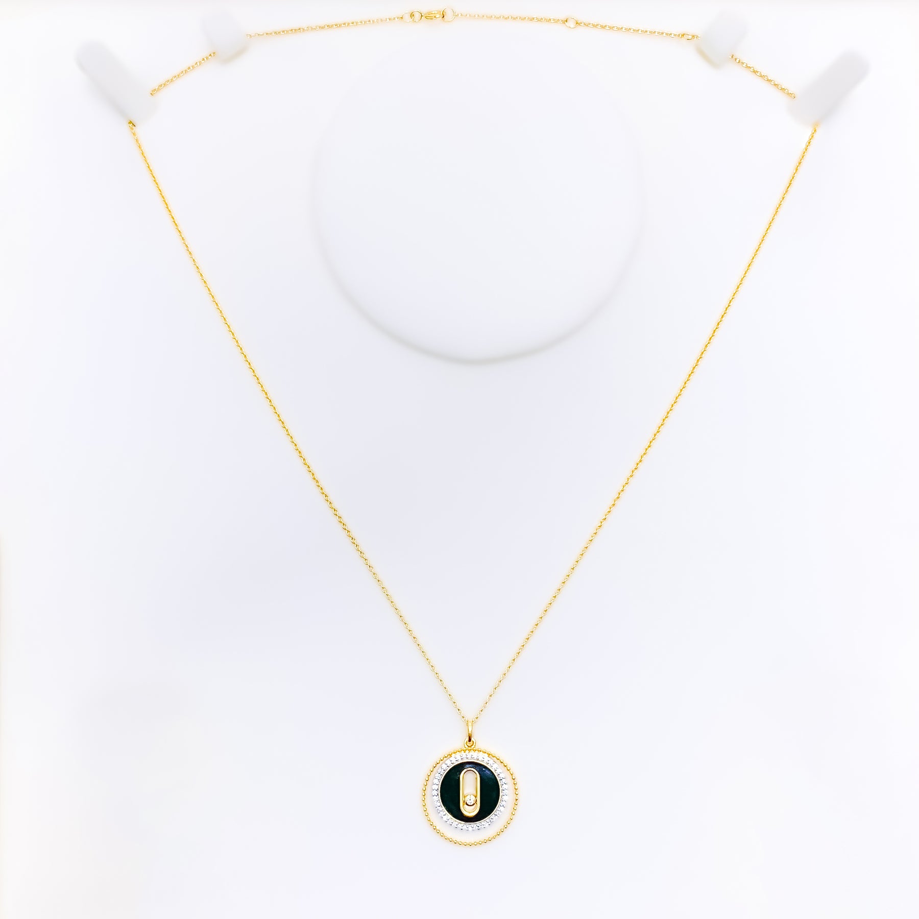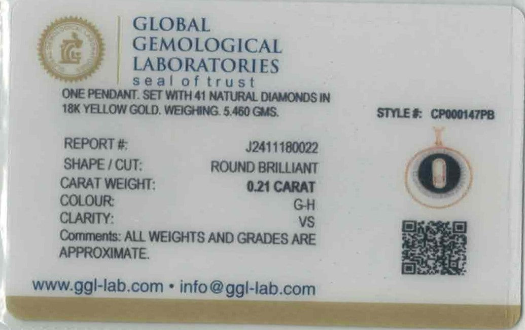 This luxurious 18k yellow gold necklace, weighing 5.46 grams, features an impressive design adorned with 0.21ct of sparkling round brilliant cut diamonds. The polished finish enhances its luminous brilliance, exuding timeless charm. Measuring 18" in length with a 1.2" drop, it includes 2" adjustable links and secures with a lobster ring lock. A certified GGL piece that beautifully blends opulence with refined sophistication, perfect for both elegant evenings and special celebrations.