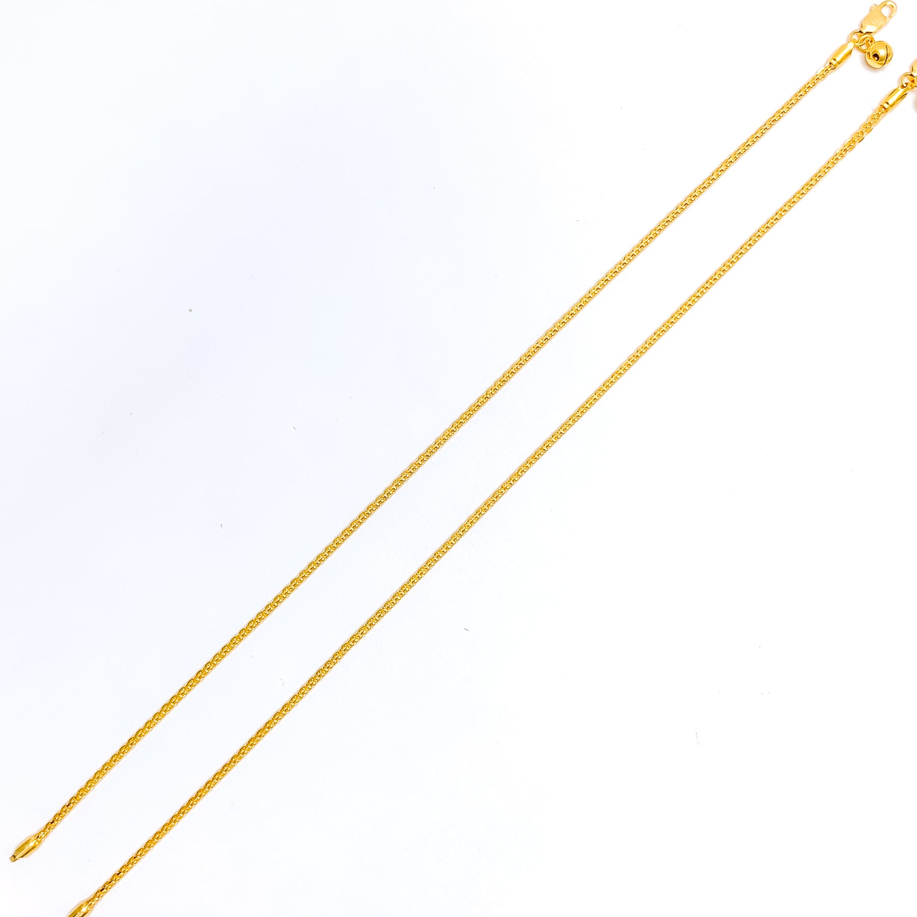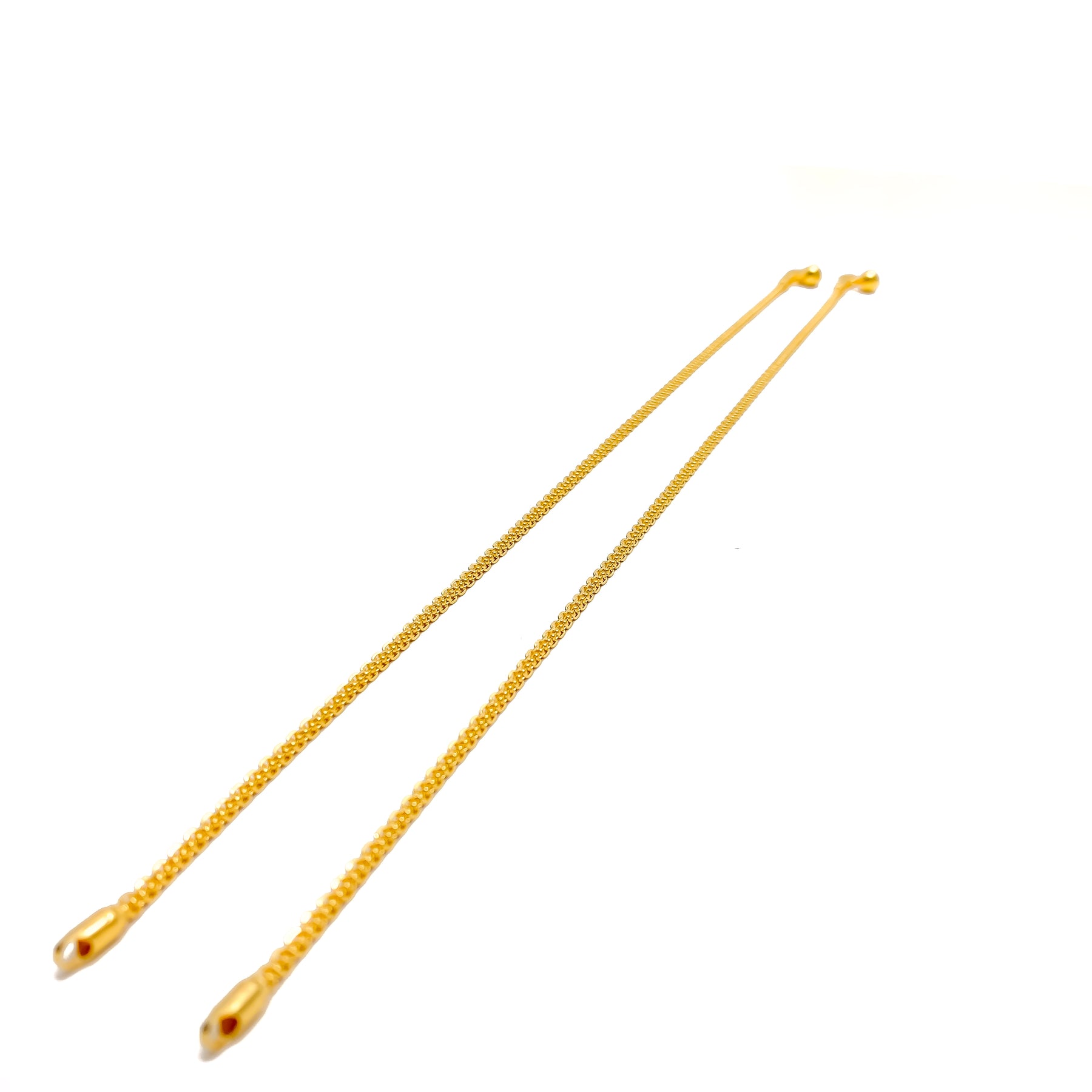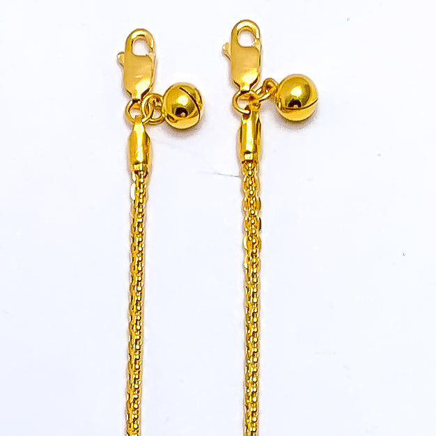 Outlined with luxurious presence, this 22k gold anklet pair showcases a refined 14.2-gram combined profile that flows smoothly along each polished 10.5-inch length. Their warm yellow-gold finish enriches every link with glowing depth and timeless brilliance. The dual design offers a harmonious blend of elevated elegance and everyday versatility suited for many styles. Secured with reliable lobster locks, these anklets add an opulent touch of radiant golden beauty to any sophisticated ensemble.