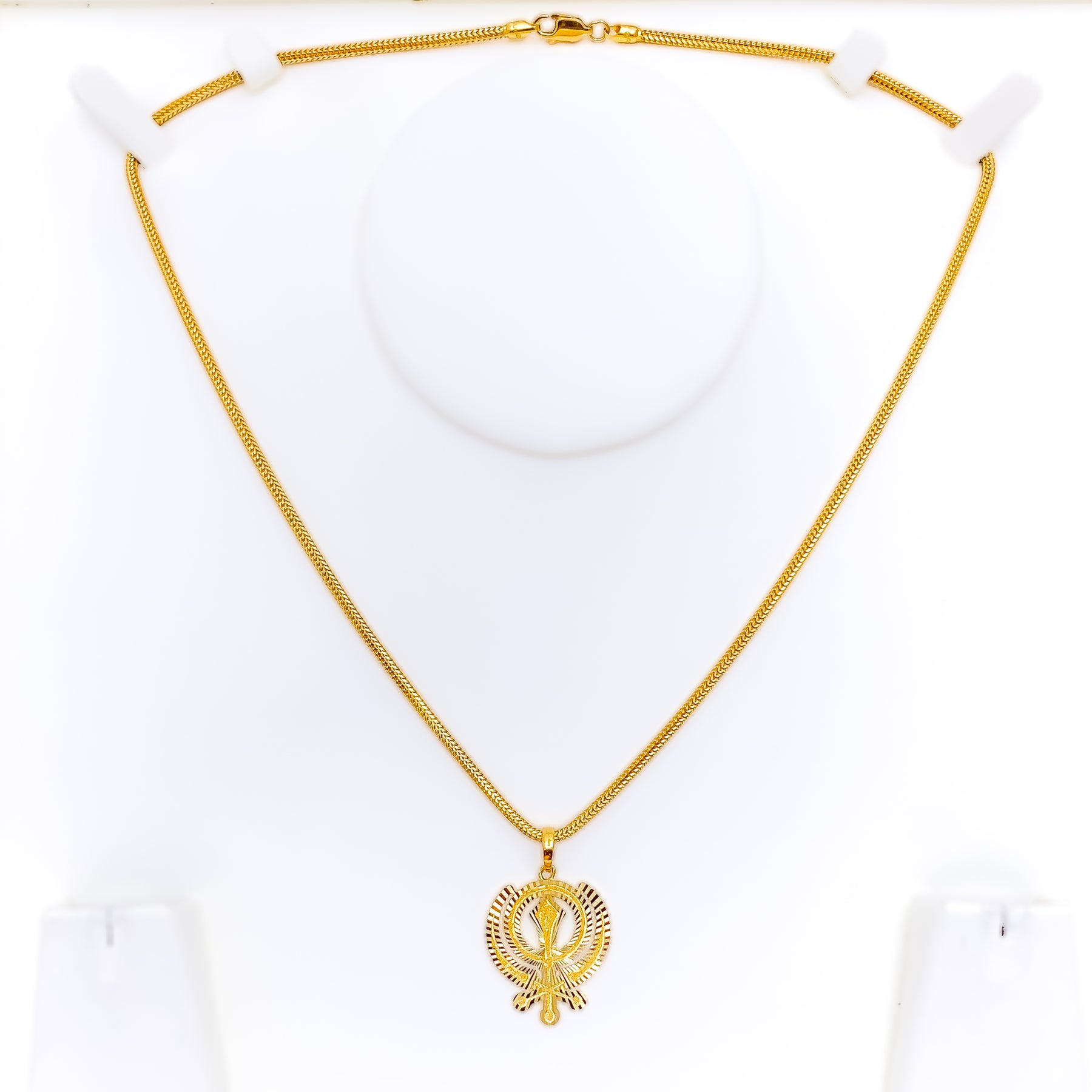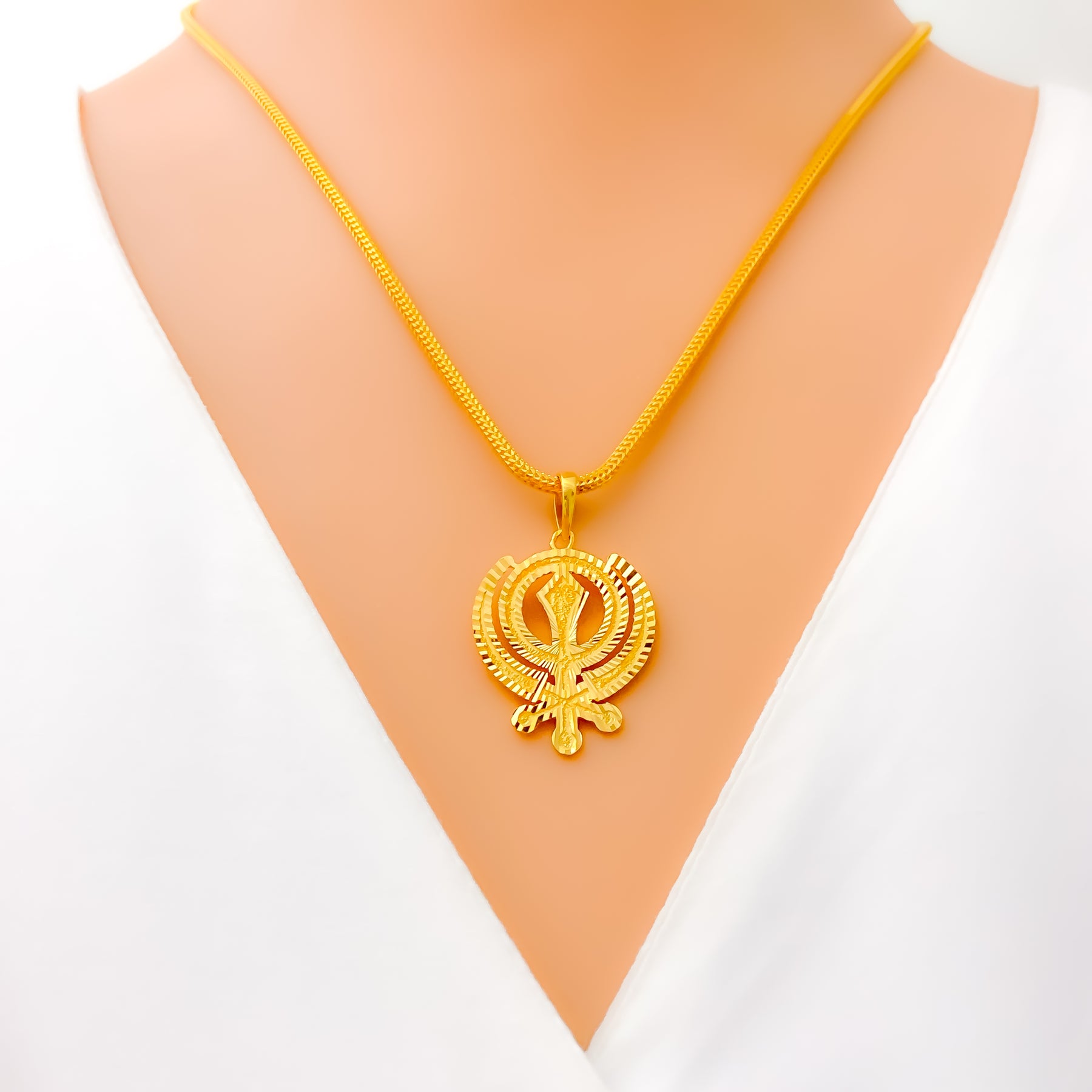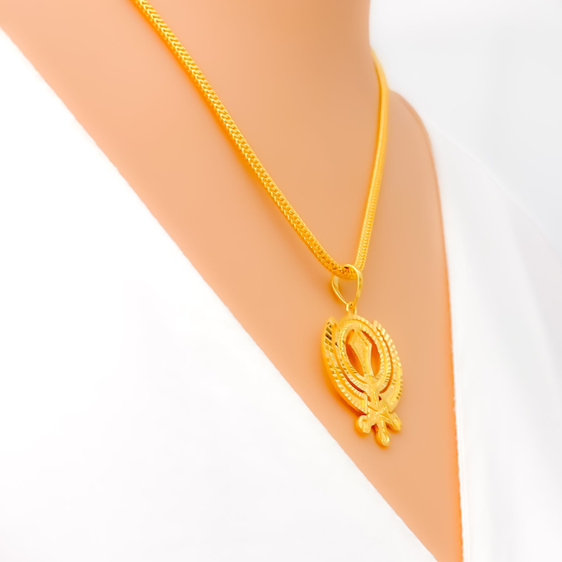 Crafted with sophistication, this Khanda pendant in pure 22k yellow gold carries a weight of 4.3 grams, offering a luxurious feel while remaining elegant. Its intricate ornamental detailing highlights traditional artistry with a regal touch. The polished finish enhances its brilliance, making it a radiant expression of faith and style. Measuring 1.3 inches, it is a versatile piece suited for both spiritual devotion and graceful wear.