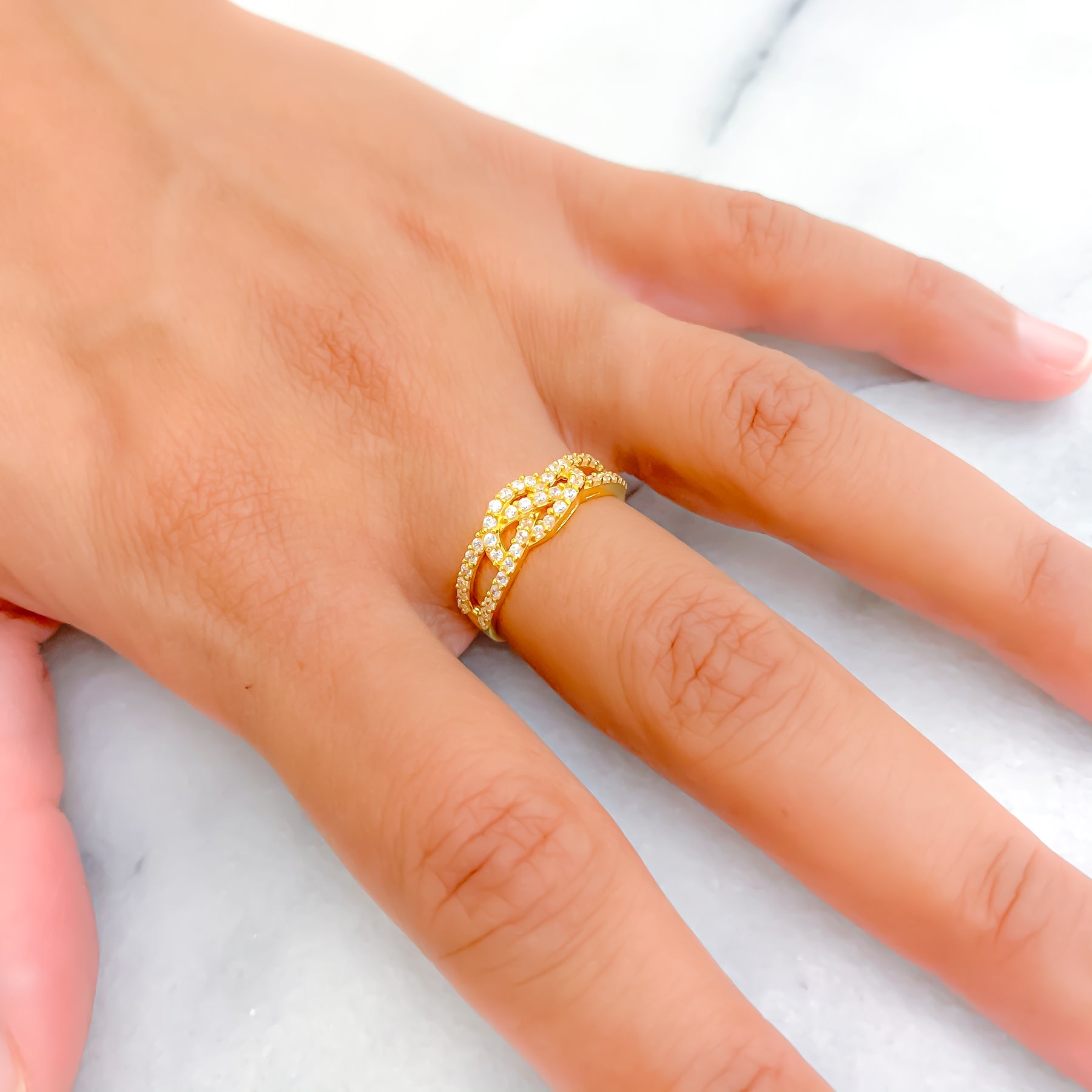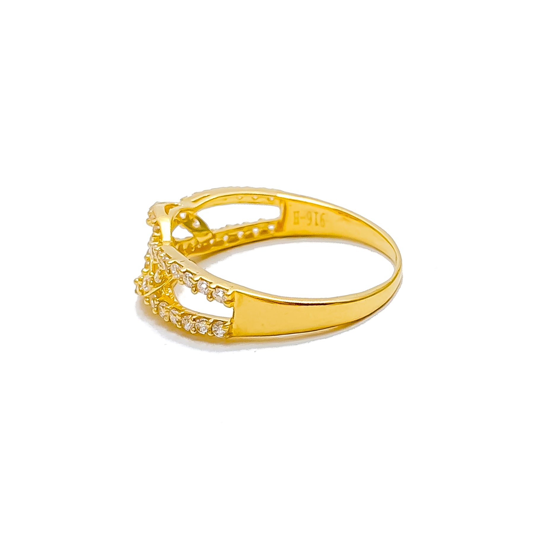 Expertly crafted in 22k yellow gold and weighing 2.5 grams, this ring showcases the refined brilliance of cubic zirconia stones. Its polished finish enhances the radiant sparkle, offering a touch of timeless sophistication. The classic yet plush design complements both traditional and modern attire effortlessly. Available in size 6.25 with re-sizing options for a flawless fit.