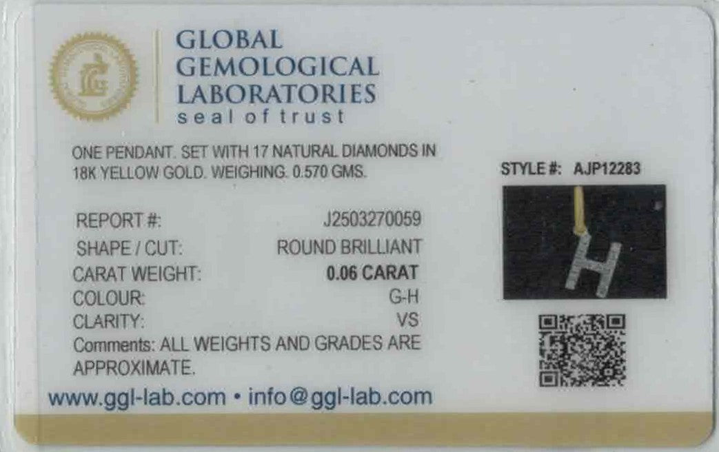 Elegant and timeless, this 18k yellow gold pendant features the letter H adorned with a 0.06ct VS-quality diamond for a refined sparkle. Weighing 0.57 grams and measuring 0.6 inches in length, it offers a graceful blend of personalization and brilliance. The polished gold finish adds warmth and sophistication. Chain not included, and it is GGL certified for guaranteed quality and authenticity.