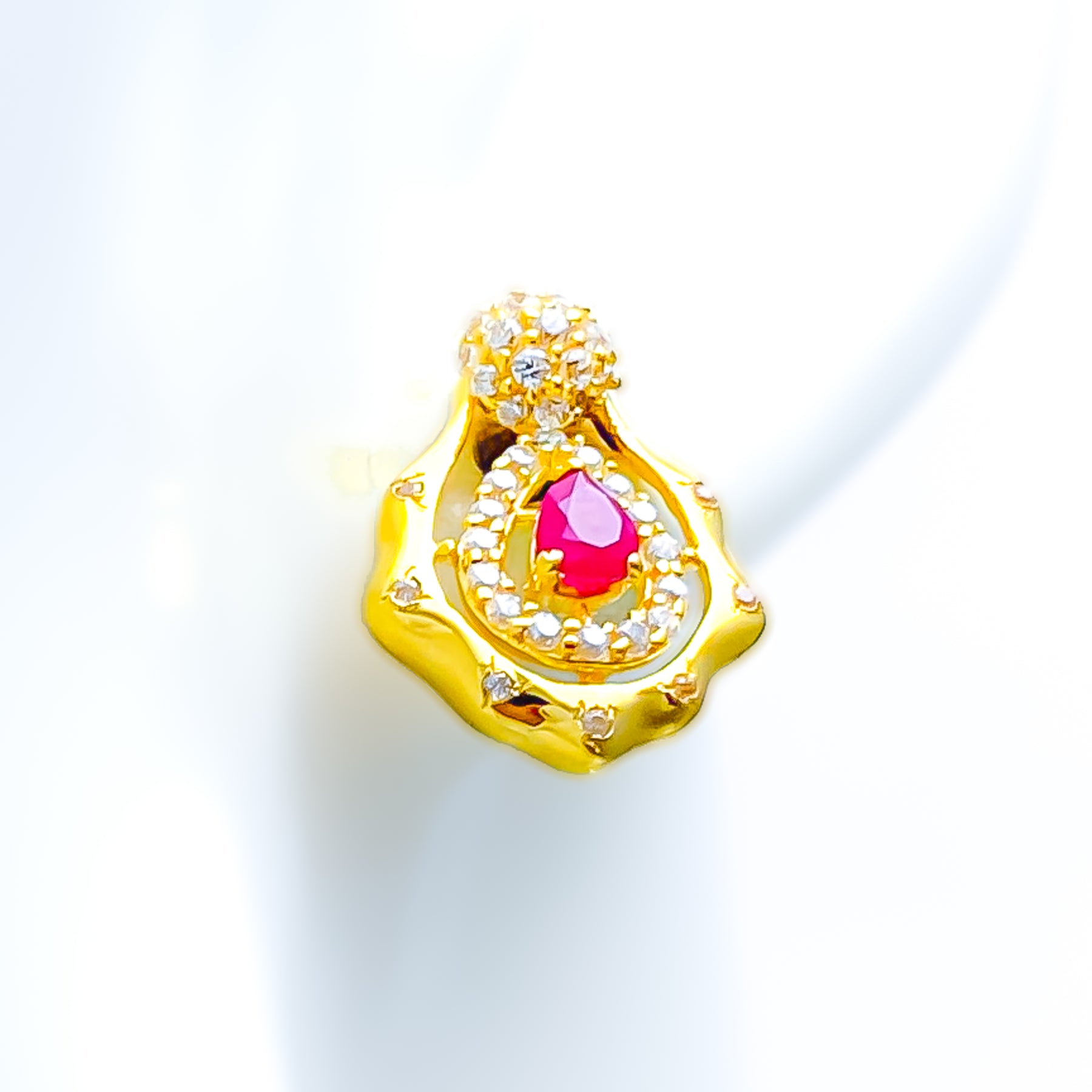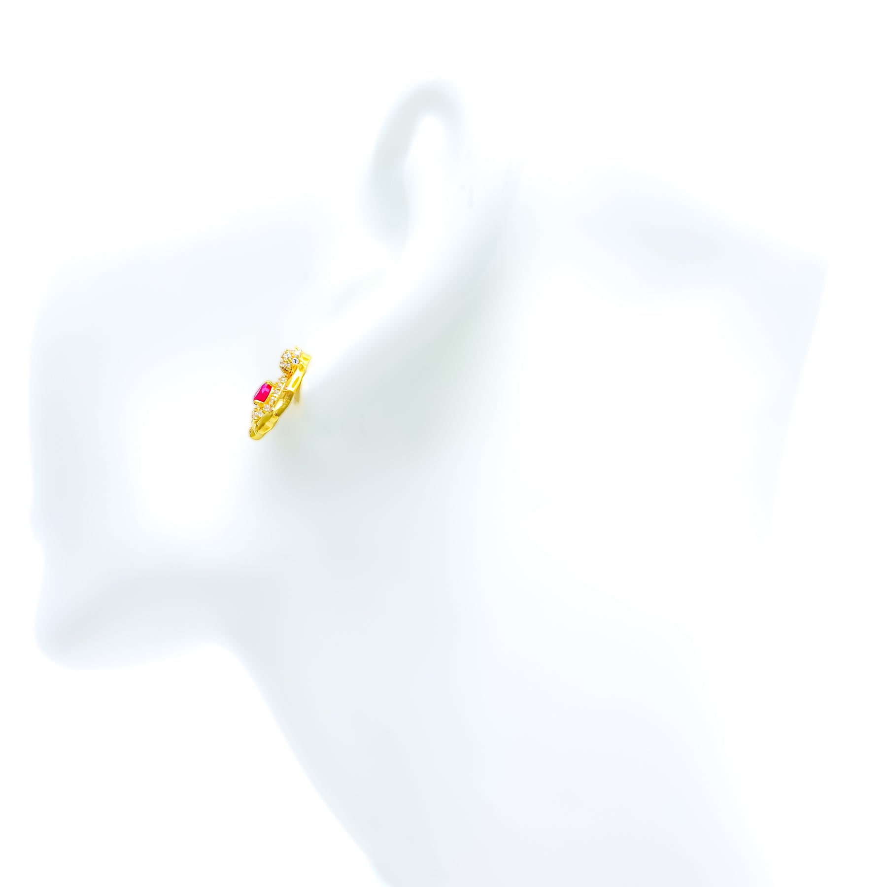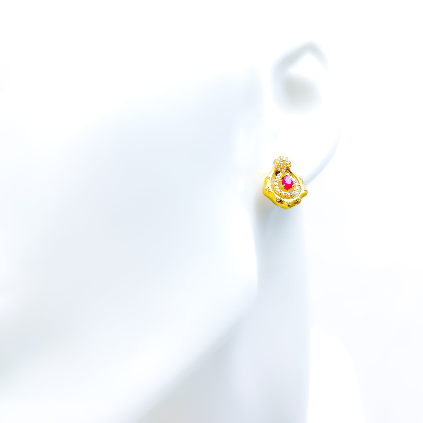Infused with vivid charm, these 22k gold earrings highlight shimmering cubic zirconia stones with a striking touch of red accent. The compact 0.6" length makes them an ideal choice for everyday elegance or subtle festive wear. Their polished yellow gold finish enhances the overall warmth and richness. Designed with secure screw-back posts, they ensure style with confidence.