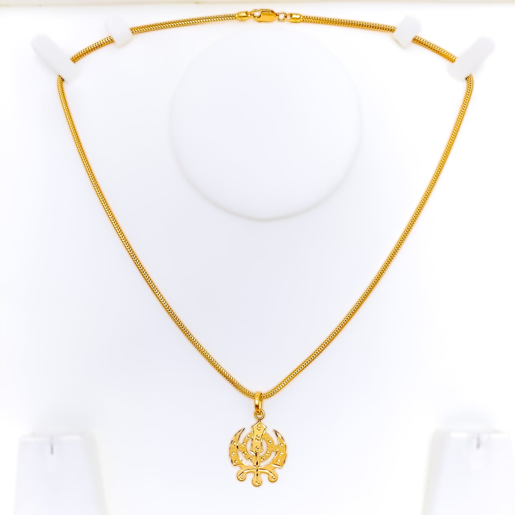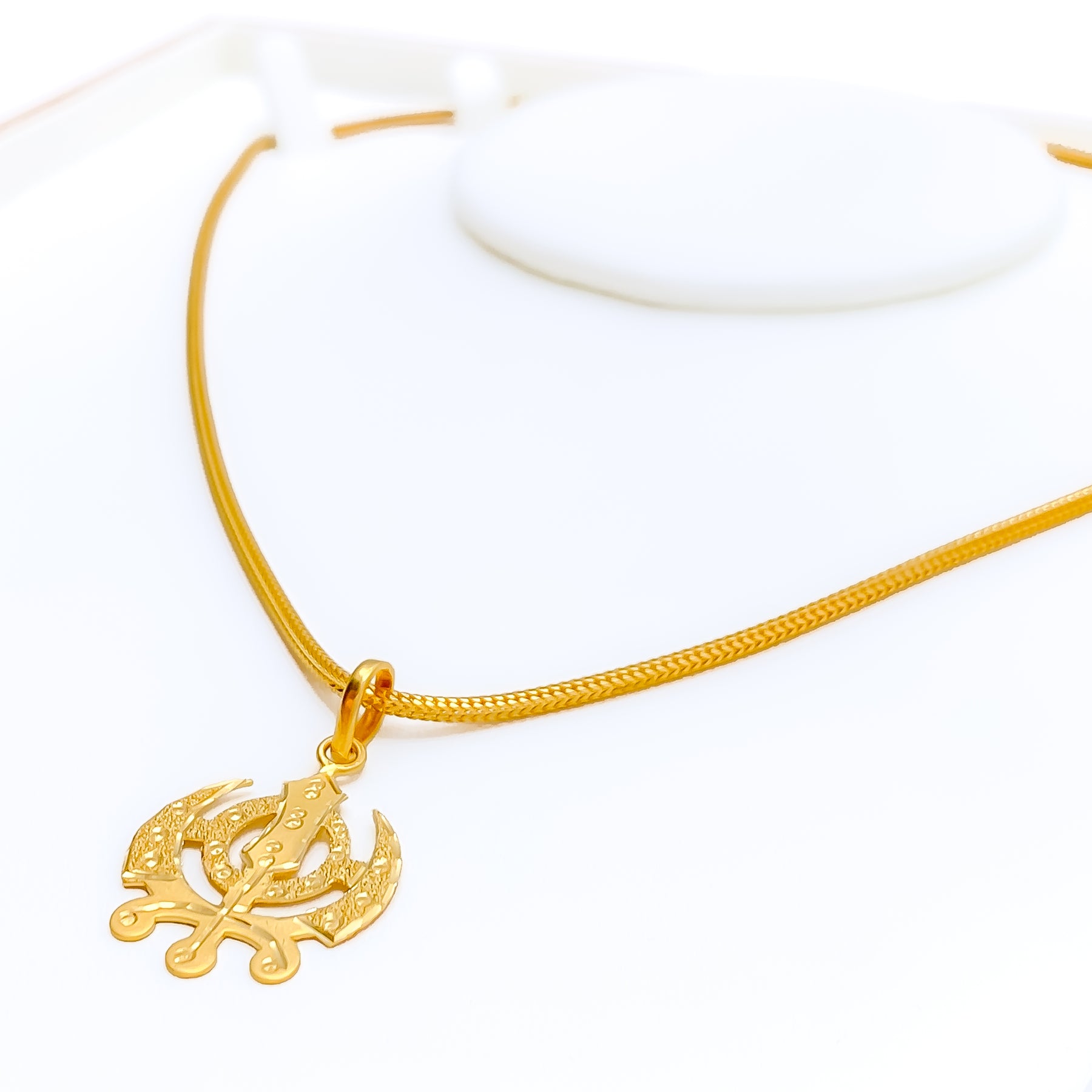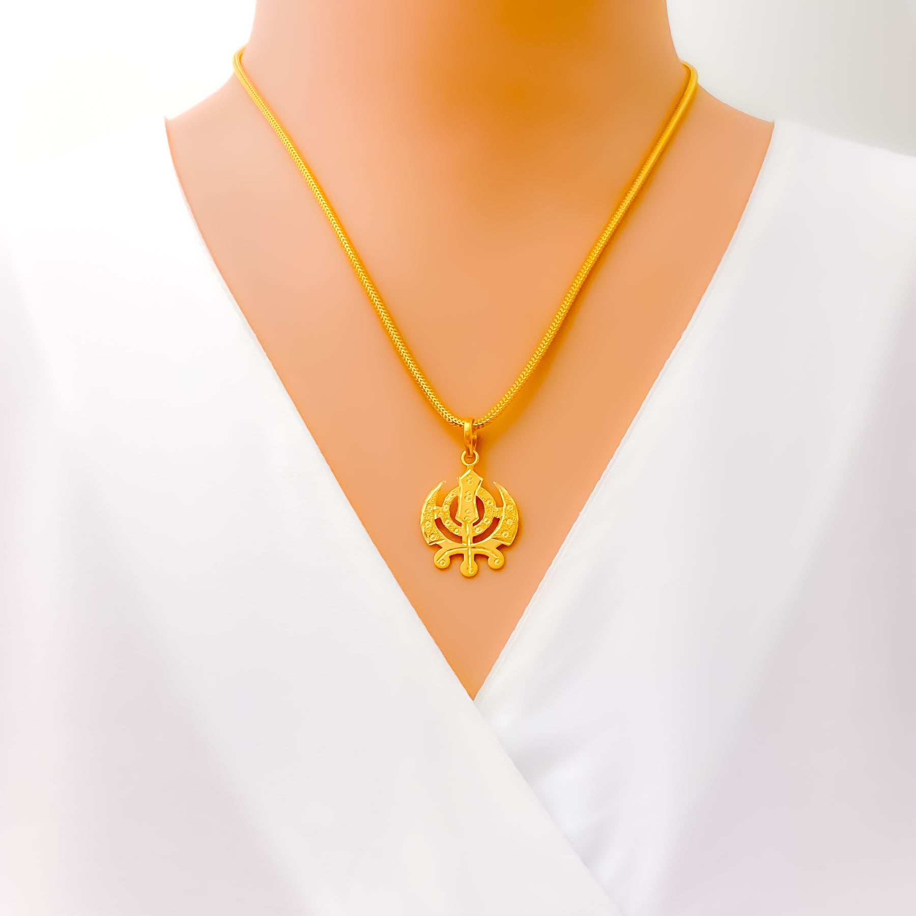 This elegant Khanda pendant is beautifully crafted in 22k yellow gold, weighing 2.6 grams for a balanced, refined presence. With a 1.3-inch length, it showcases traditional artistry that reflects timeless cultural significance. The polished finish enhances its radiant glow, making it a meaningful yet stylish piece. Chain not included, allowing you to pair it with your preferred choice.