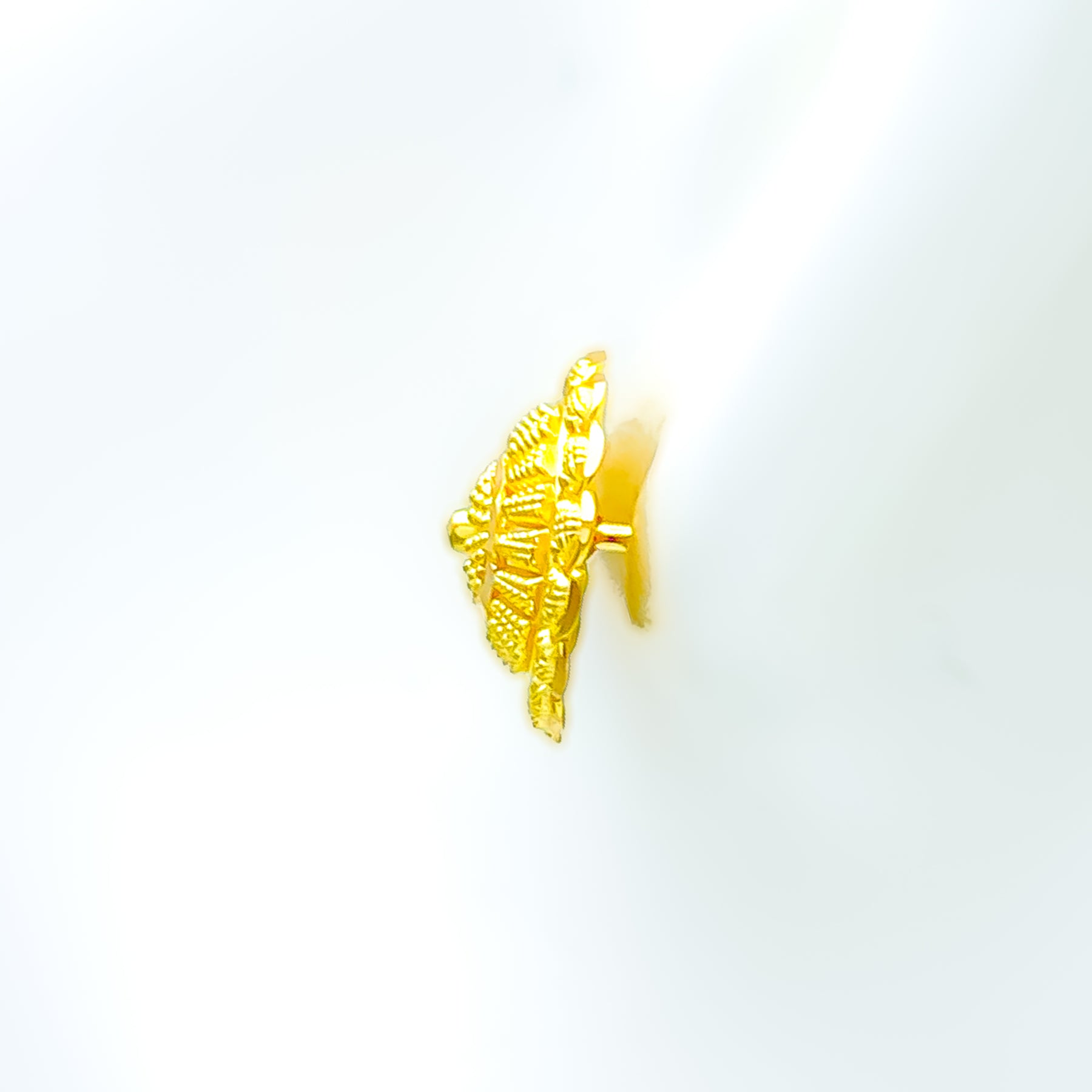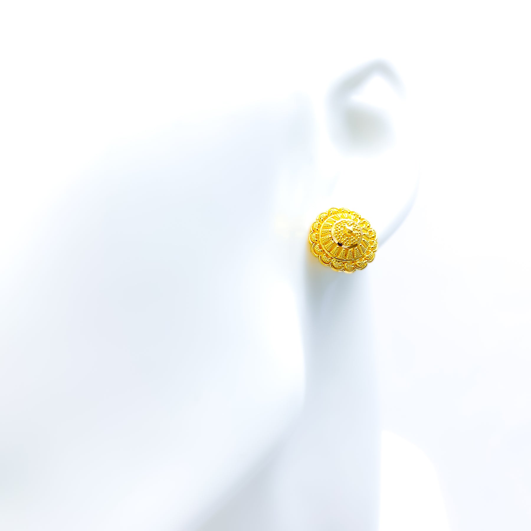 Crafted with timeless appeal, these 22k gold earrings showcase refined elegance in a compact 0.6" diameter. The radiant yellow gold finish enhances their regal look, perfect for elevating both traditional and modern outfits. Their polished design speaks to understated luxury. Completed with secure screw-back posts for lasting comfort and wear.