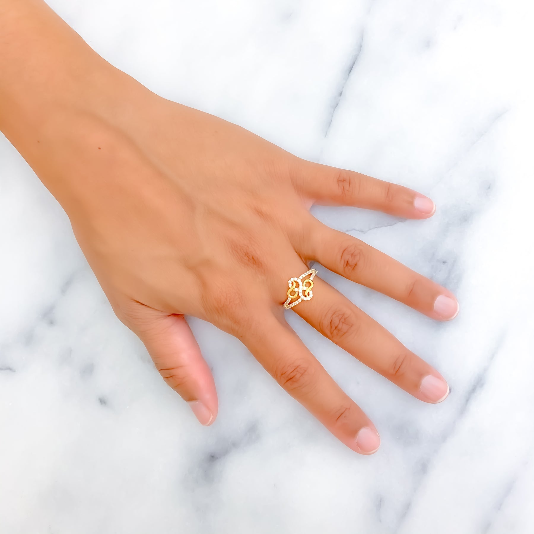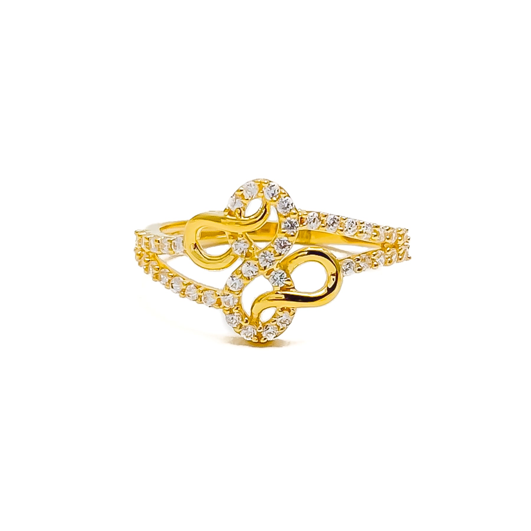 Expertly crafted in 22k yellow gold and weighing 2.4 grams, this striking ring features a refined geometric design adorned with radiant cubic zirconia stones. The intricate symmetry and polished finish exude contemporary elegance while maintaining a timeless appeal. Ideal for those who appreciate bold yet balanced artistry, it complements any sophisticated style. Available in size 6.75 with re-sizing options for a perfect fit.