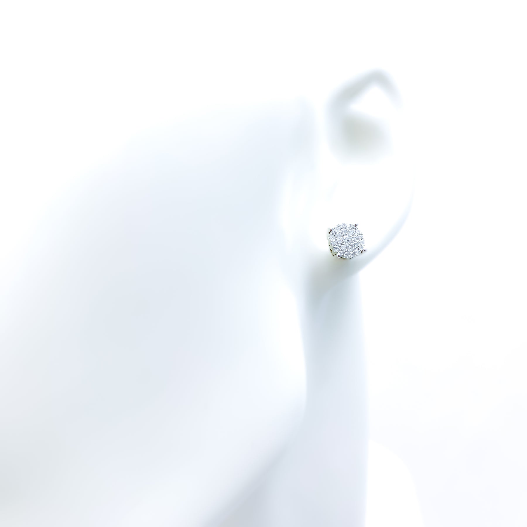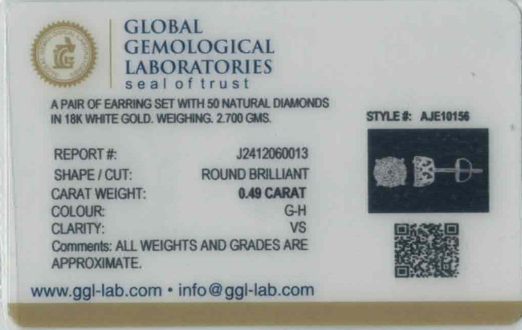 Exquisitely crafted, these 18k white gold diamond earrings radiate regal elegance and refined brilliance. Weighing 2.7 grams, they offer a graceful balance of sophistication and lightness. The 0.49ct of G-H color, VS clarity round brilliant-cut diamonds sparkle with captivating luminosity. Measuring 0.3 inches, they’re a timeless symbol of luxury and elegance.