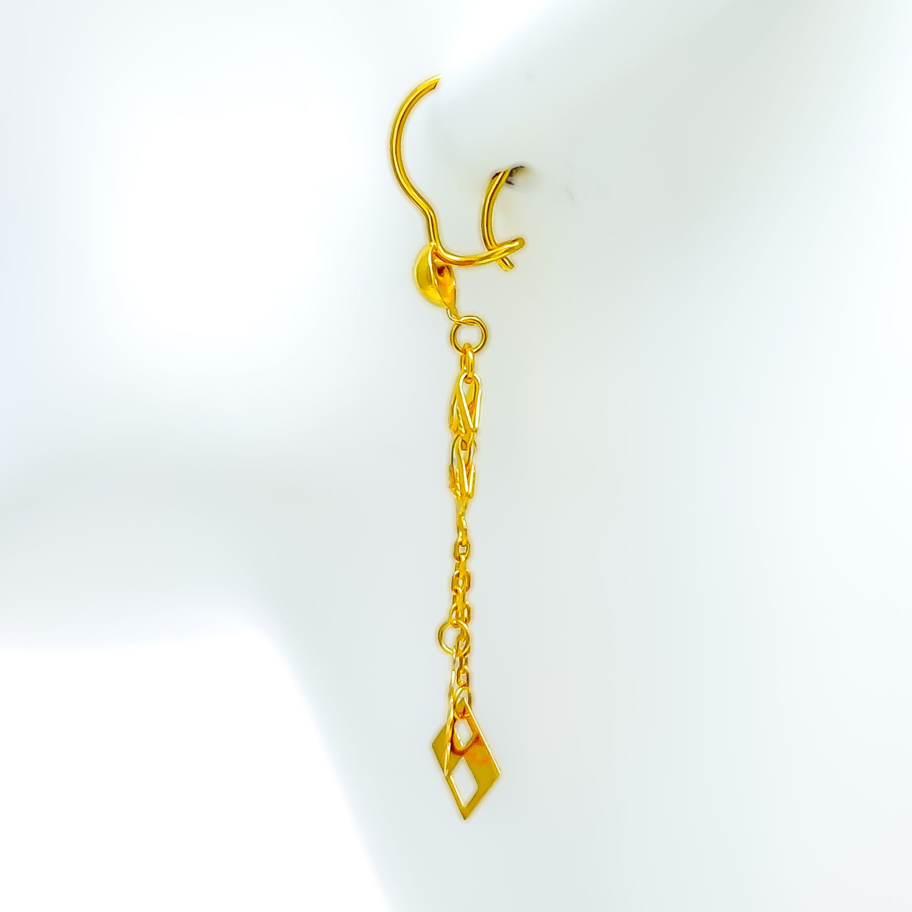 Crafted in luminous 21k yellow gold, these 2.5-gram earrings feature a sleek, elongated silhouette designed for effortless elegance. With a 2.3-inch length and secure hook backs, they offer graceful movement and everyday comfort. A minimal yet stylish accent for refined, modern looks.