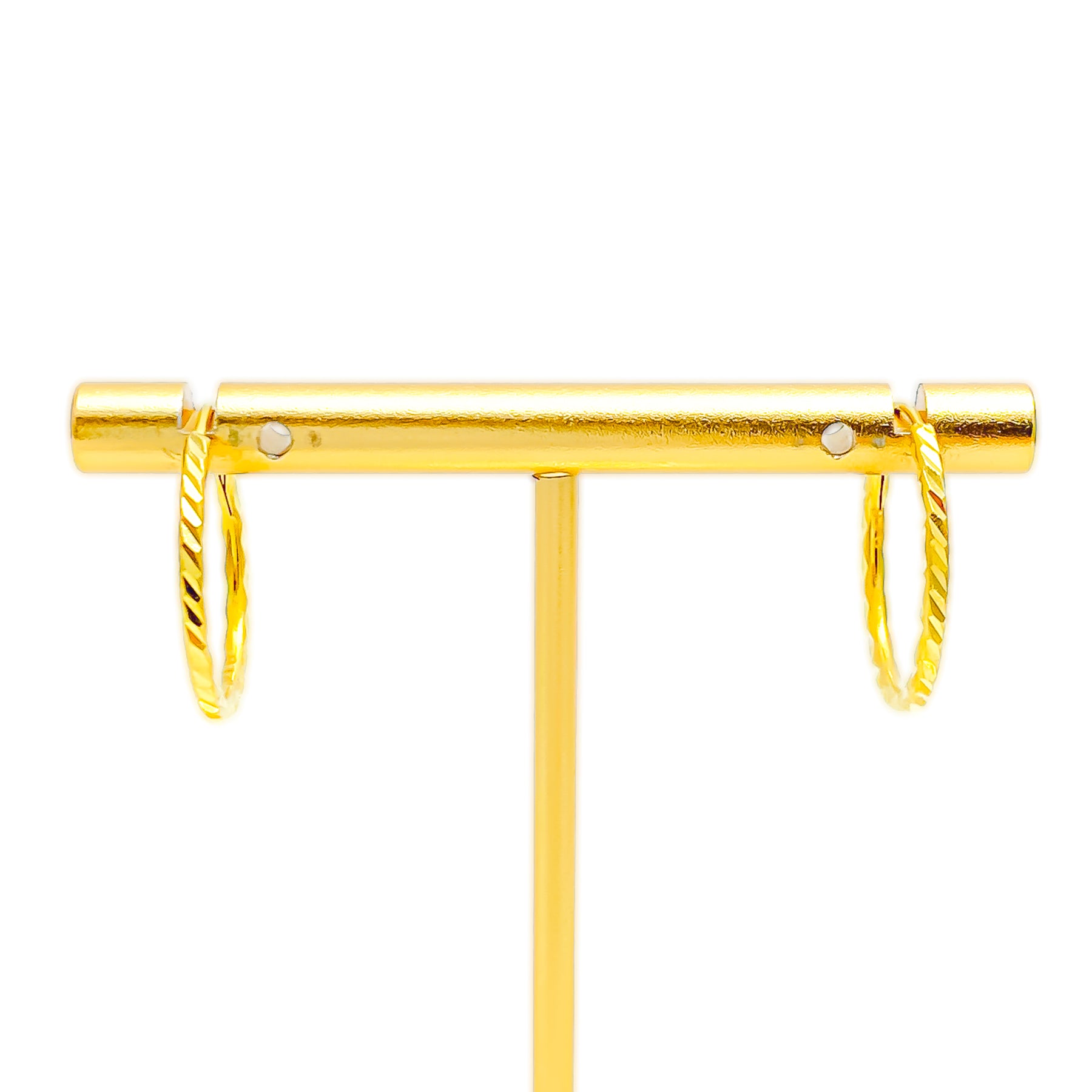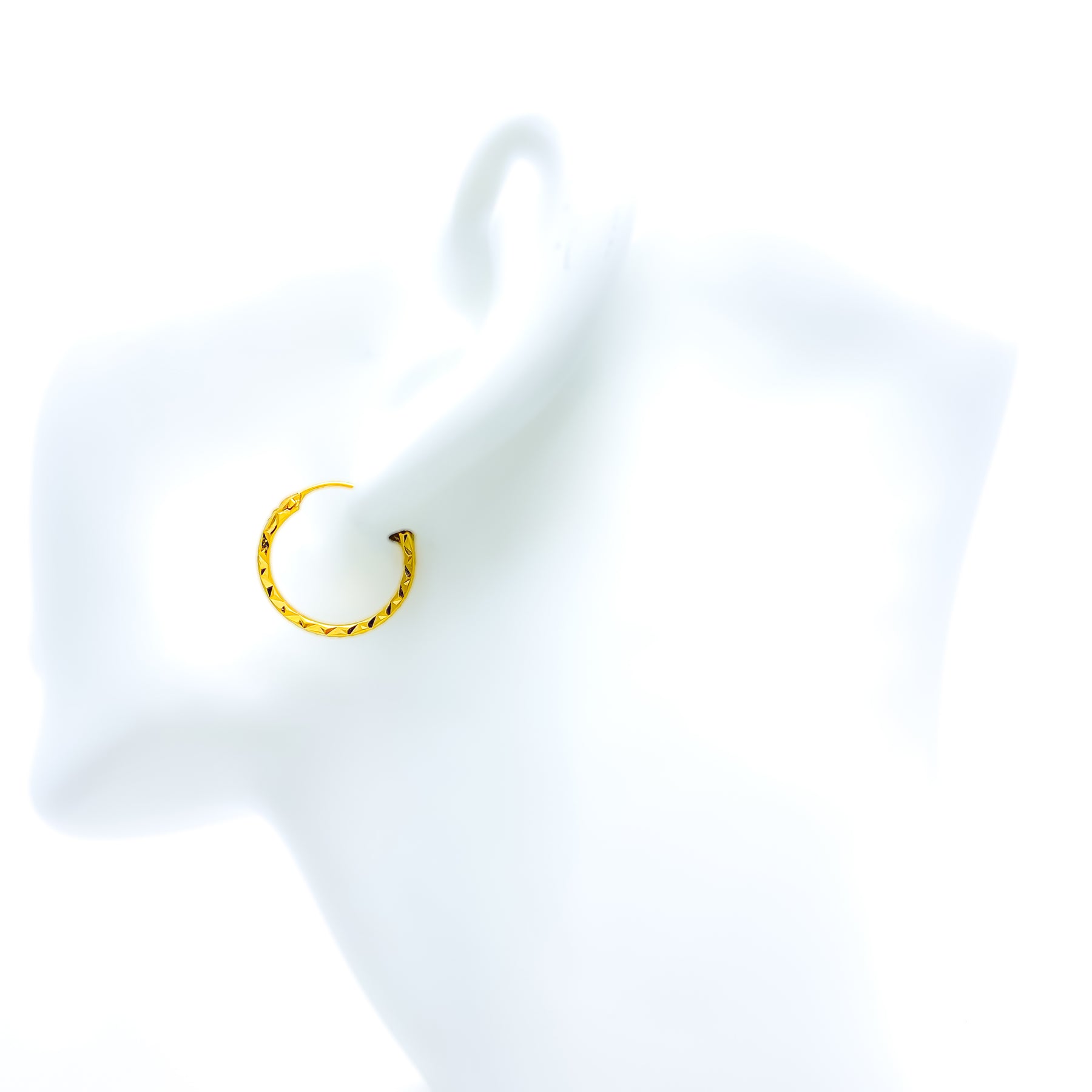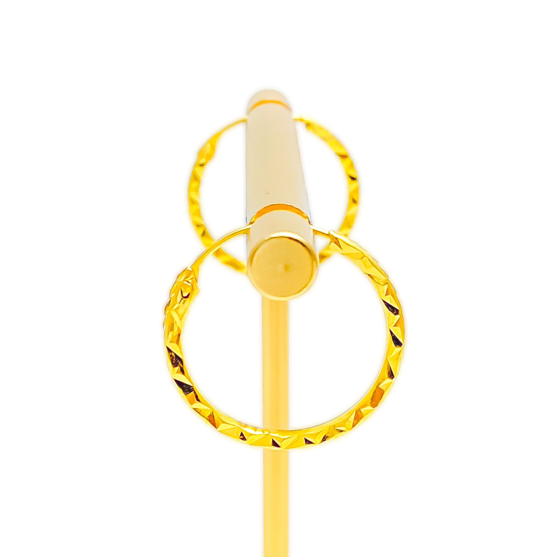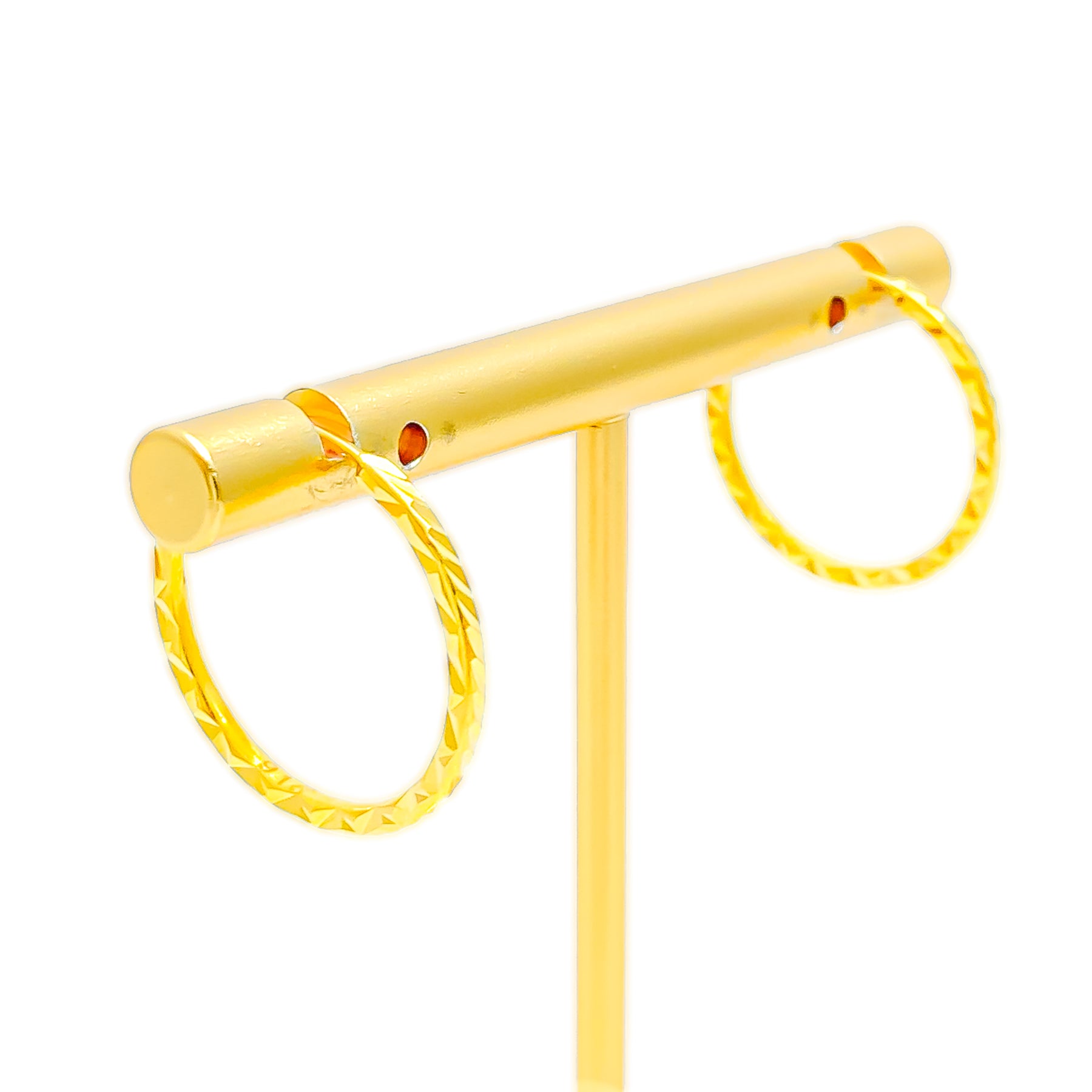 Crafted in 22k yellow gold with a weight of 2.1 grams, these elegant hoops radiate refined brilliance. The polished finish enriches their posh design, offering a luminous blend of charm and sophistication. Measuring 0.8 inches in diameter, they provide versatile elegance with lightweight comfort. Stylish yet durable, they are a timeless jewel suited for both everyday wear and celebratory occasions.