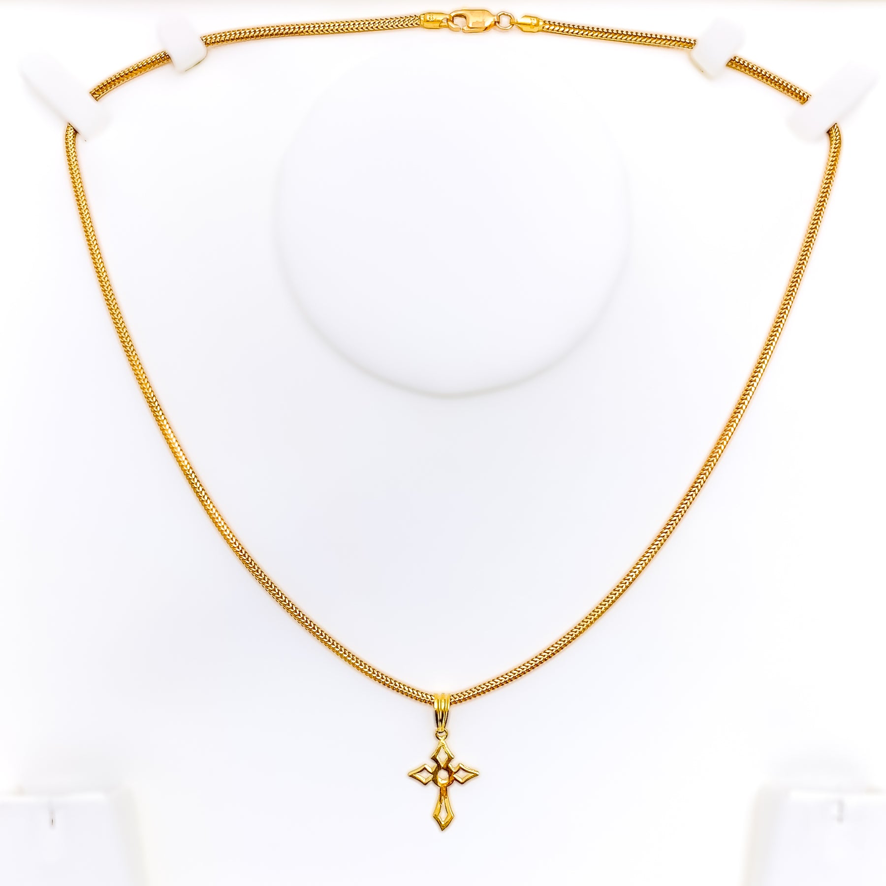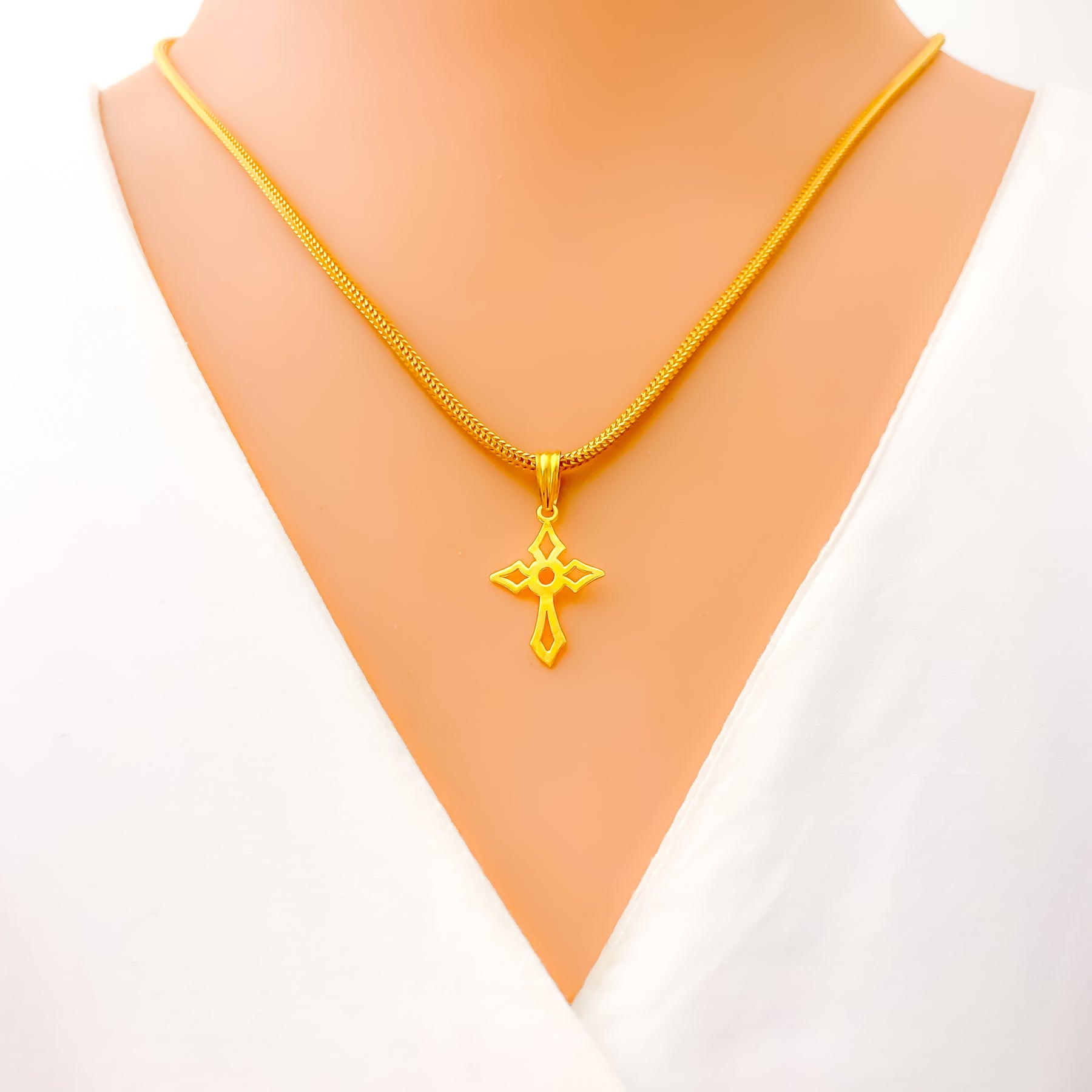 Crafted from radiant 22k yellow gold, this pendant exudes refined elegance and understated charm. Its sleek polished finish adds a touch of brilliance while preserving a timeless design. Lightweight yet substantial, it is perfect for both everyday wear and special occasions. A graceful expression of faith, it embodies beauty and devotion.