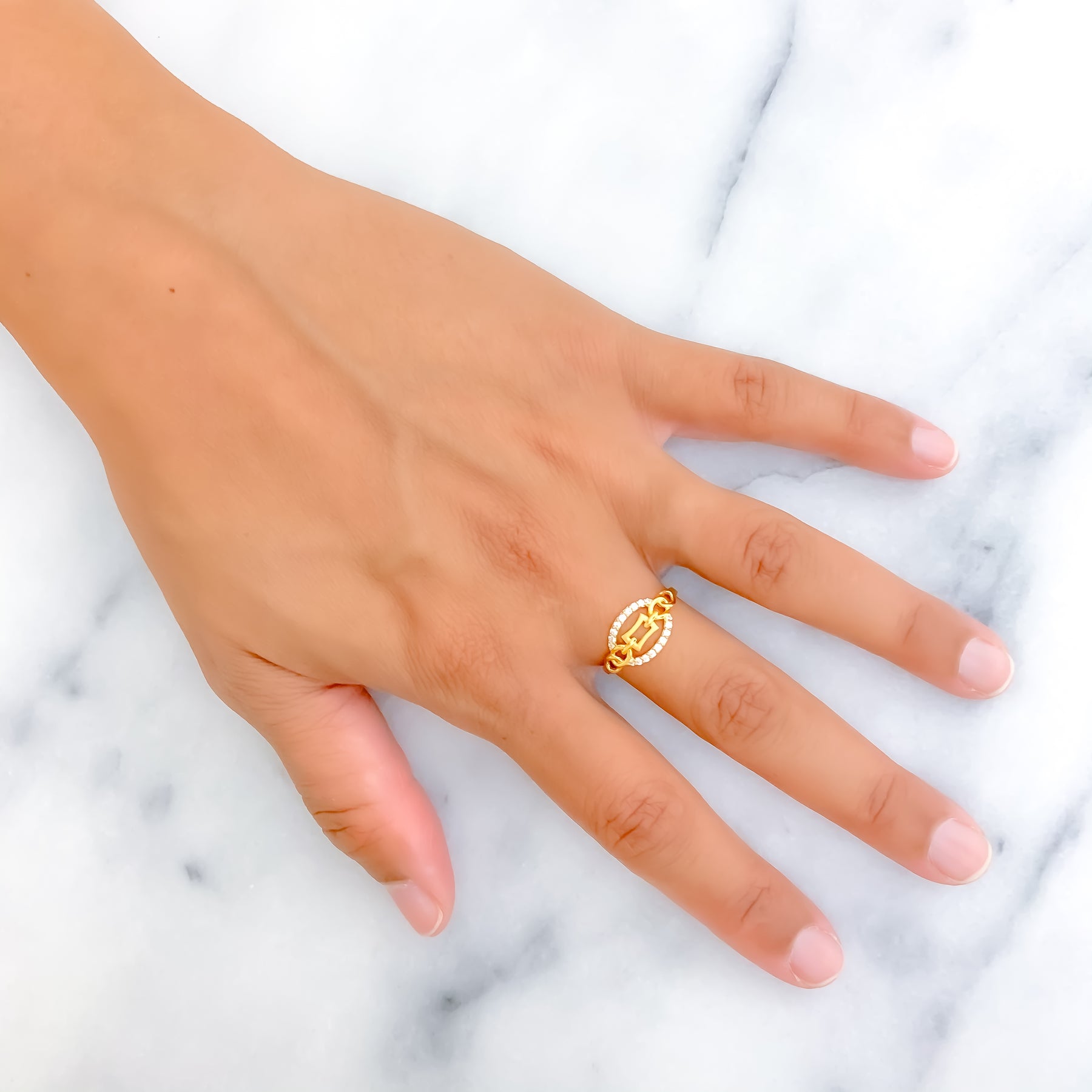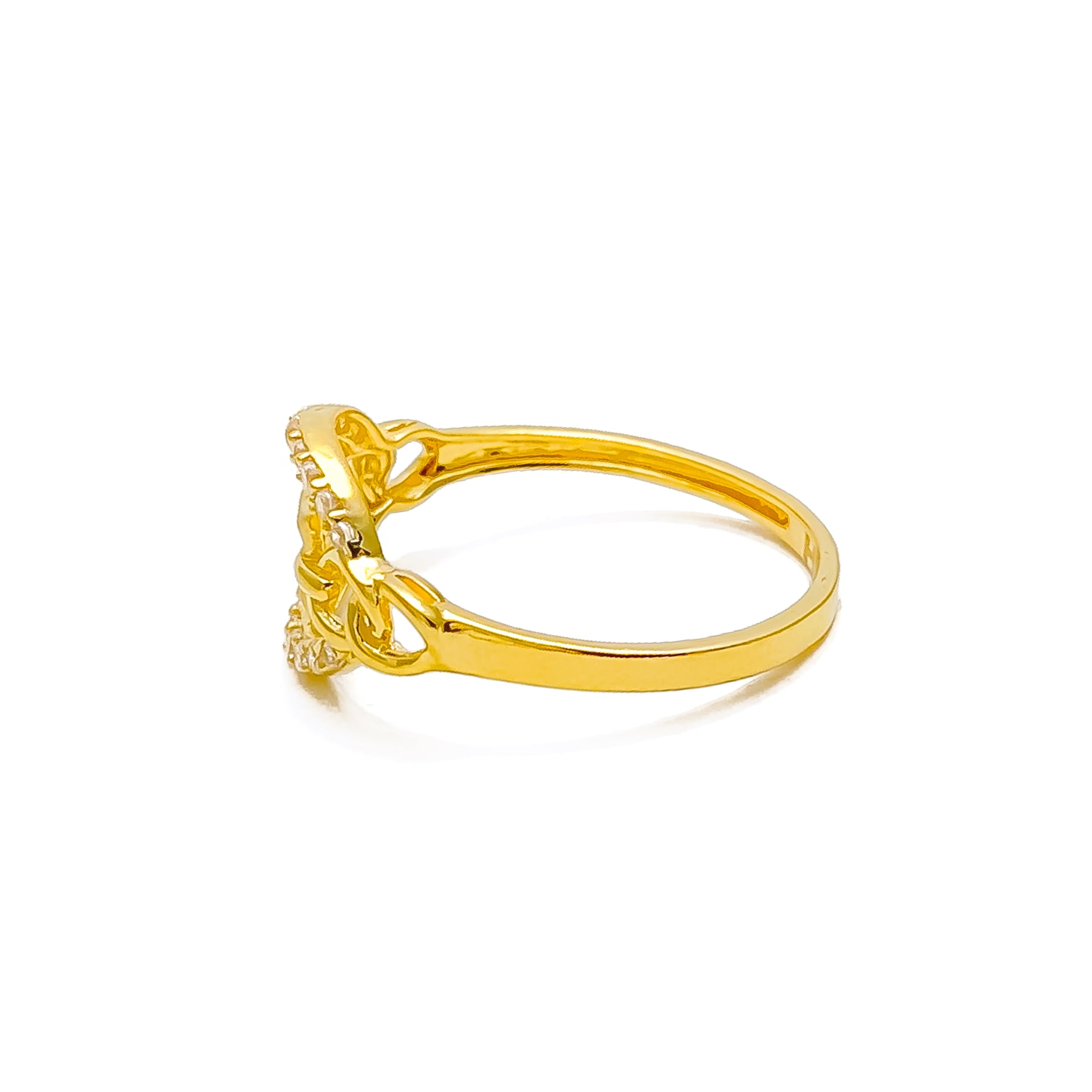 Crafted in radiant 22k yellow gold, this 1.8-gram ring exudes refined sophistication with its glittering cubic zirconia centerpiece. The polished finish adds a lustrous sheen, making it a stunning choice for both festive and formal occasions. Its sleek, dressy silhouette pairs timeless appeal with modern charm. Available in size 7 with re-sizing options for a perfect fit.