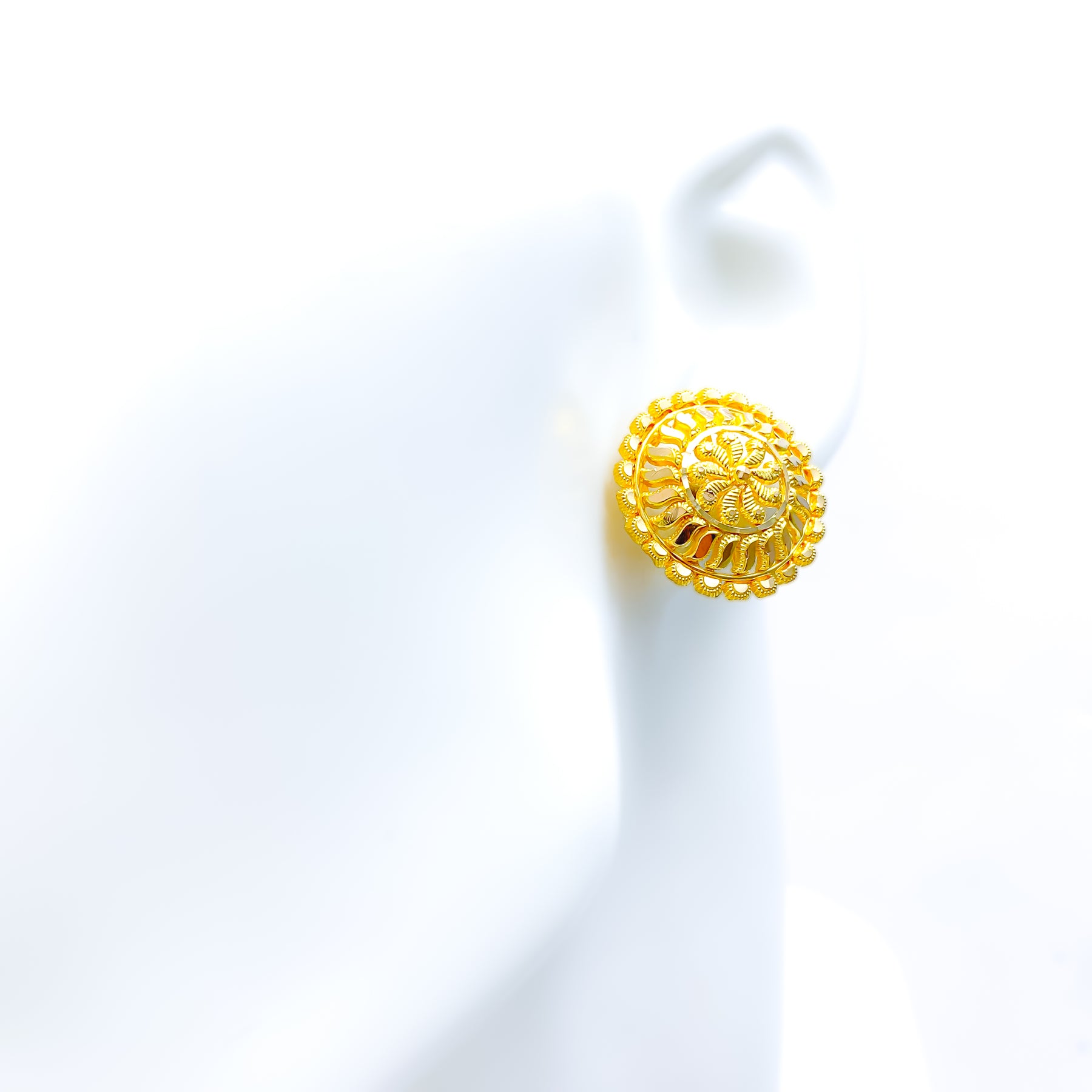 This exquisite pair of 22k yellow gold earrings, weighing 7.1 grams, showcases a blooming tops design that radiates stunning elegance. The polished finish enhances their radiant brilliance, adding timeless sophistication. With a 0.9" diameter and secure screw-back posts, they provide a graceful yet striking presence. A luxurious accessory that beautifully blends floral artistry with classic refinement, perfect for both festive occasions and refined daily wear.