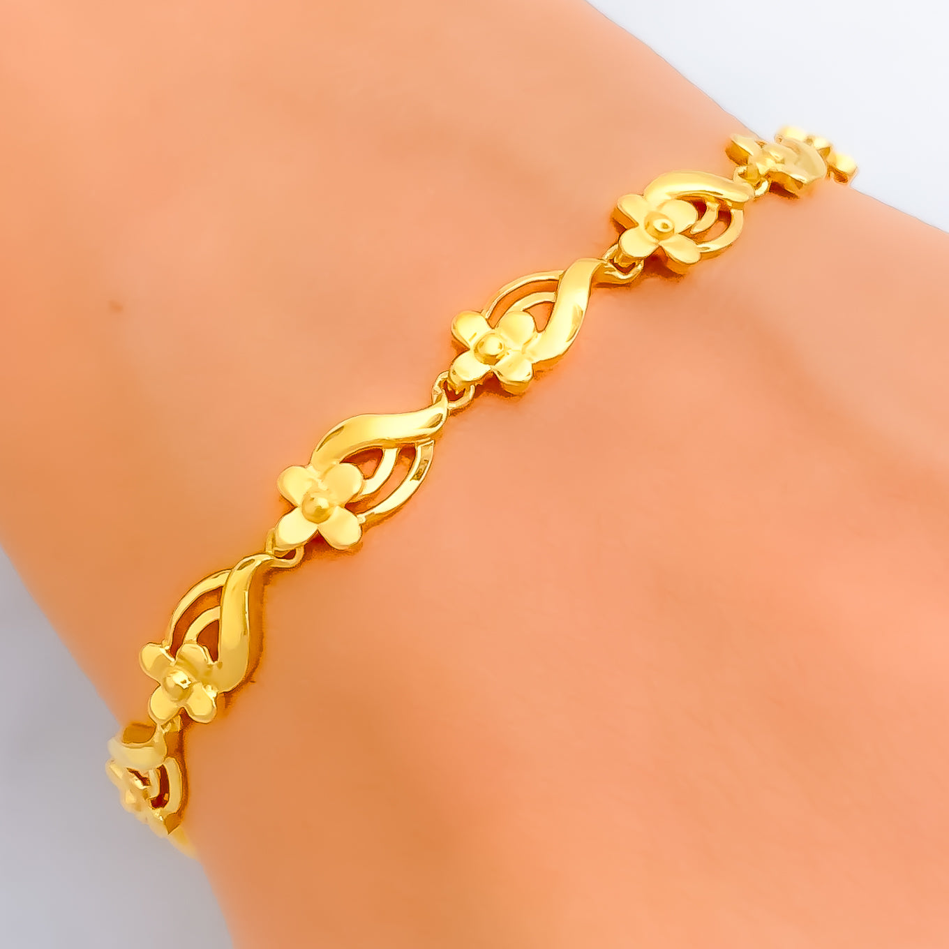 Crafted in 22k yellow gold with a weight of 8.8 grams, this refined bracelet radiates polished sophistication. The sleek design is accentuated by its luminous finish, blending modern elegance with timeless charm. Measuring 7.3 inches in length with 0.5-inch adjustable links, it ensures a tailored fit. Completed with a secure S lock, it is a versatile jewel perfect for both daily wear and festive occasions.