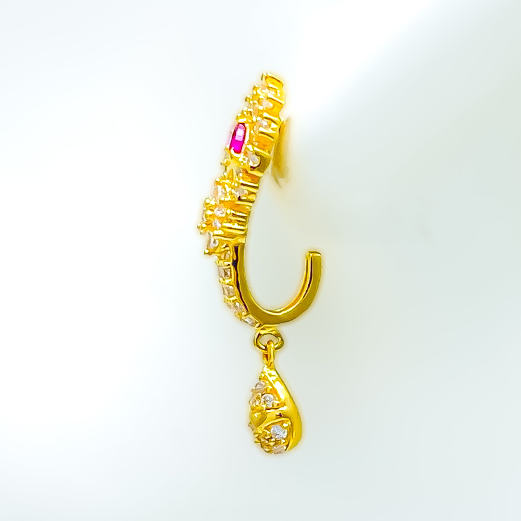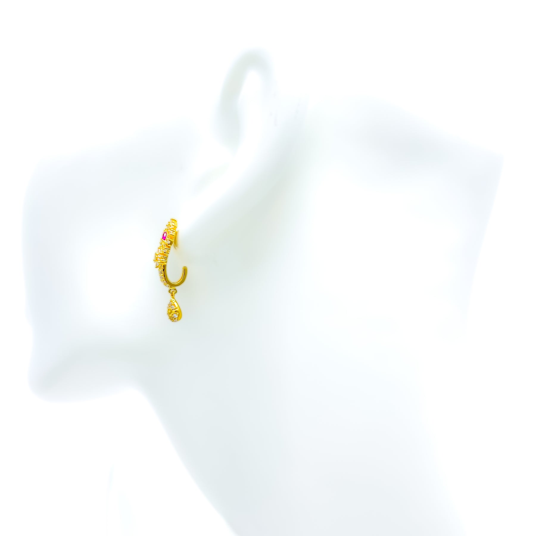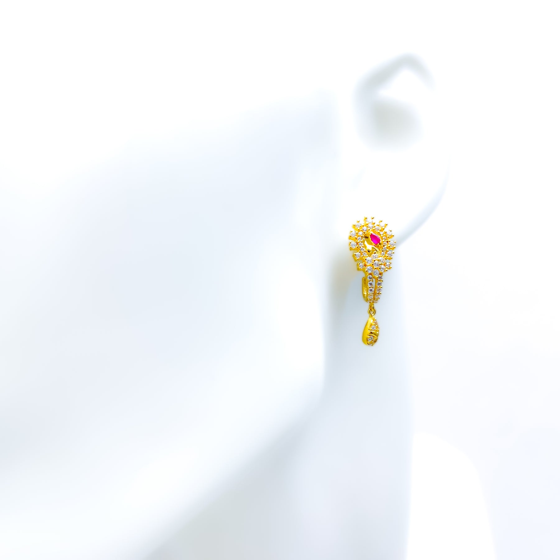 Refined and luminous, these 22k gold earrings exude a graceful yet bold charm ideal for statement styling. The shimmering cubic zirconia stones add radiant depth against the polished yellow gold finish. At 1.1" in length, they strike the perfect balance of elegance and presence. Designed with secure screw-back posts, they’re a flawless choice for all-day confidence.