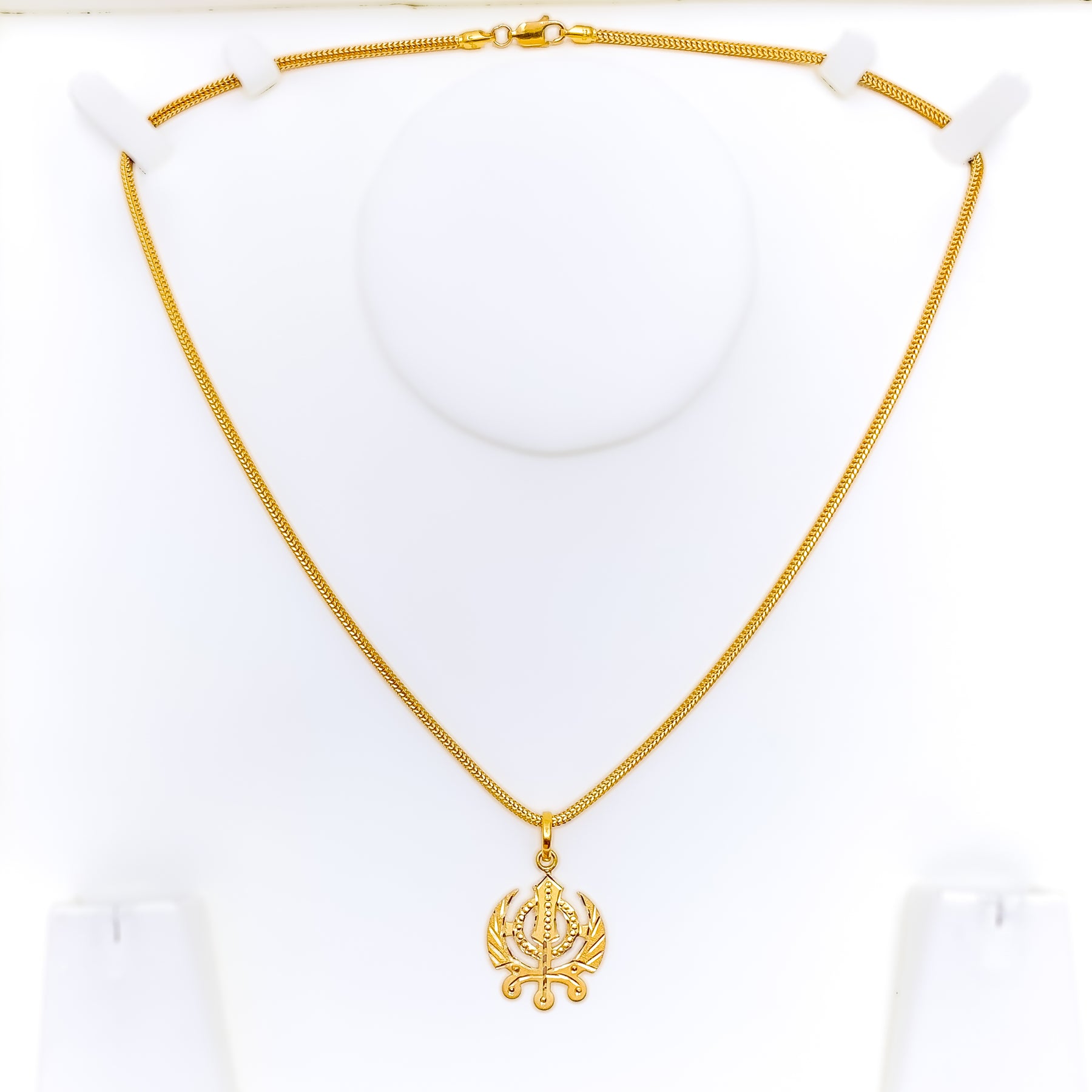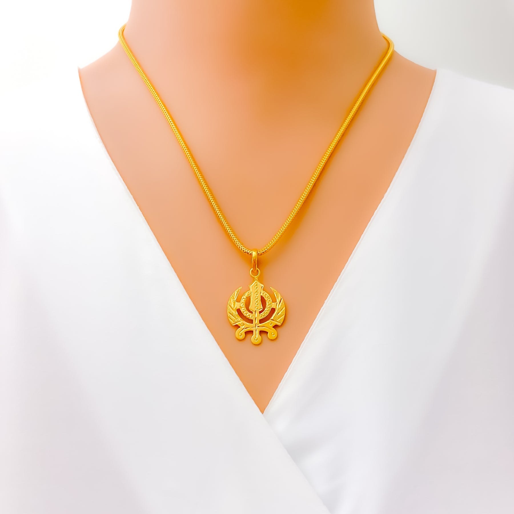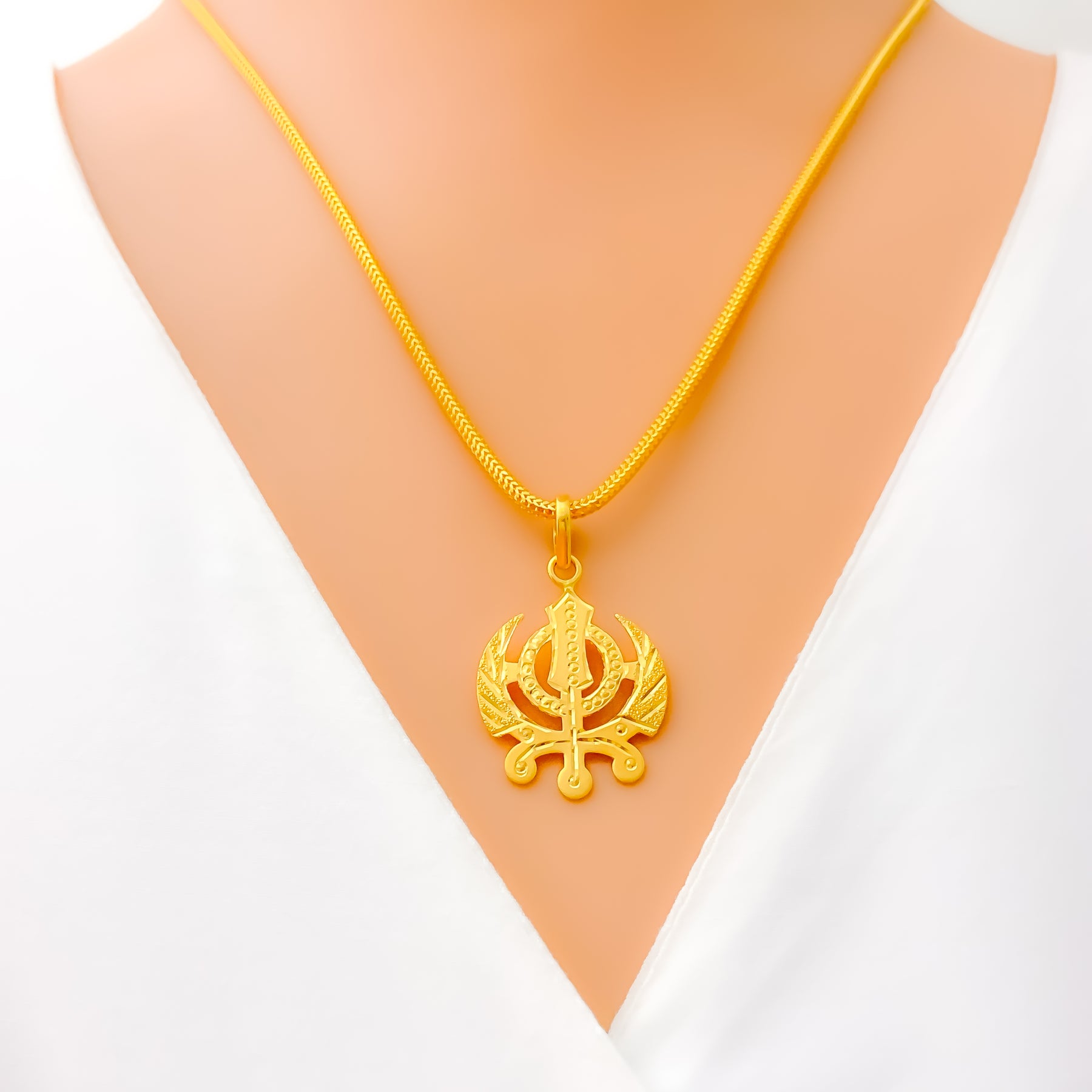 This elegant Khanda pendant is beautifully crafted in 22k yellow gold, weighing 2.7 grams for a refined balance of presence and comfort. Measuring 1.3 inches in length, it showcases symbolic artistry with timeless sophistication. The polished finish enhances its golden glow, adding depth to its meaningful design. Without an included chain, it offers versatile styling with your choice of pairing.