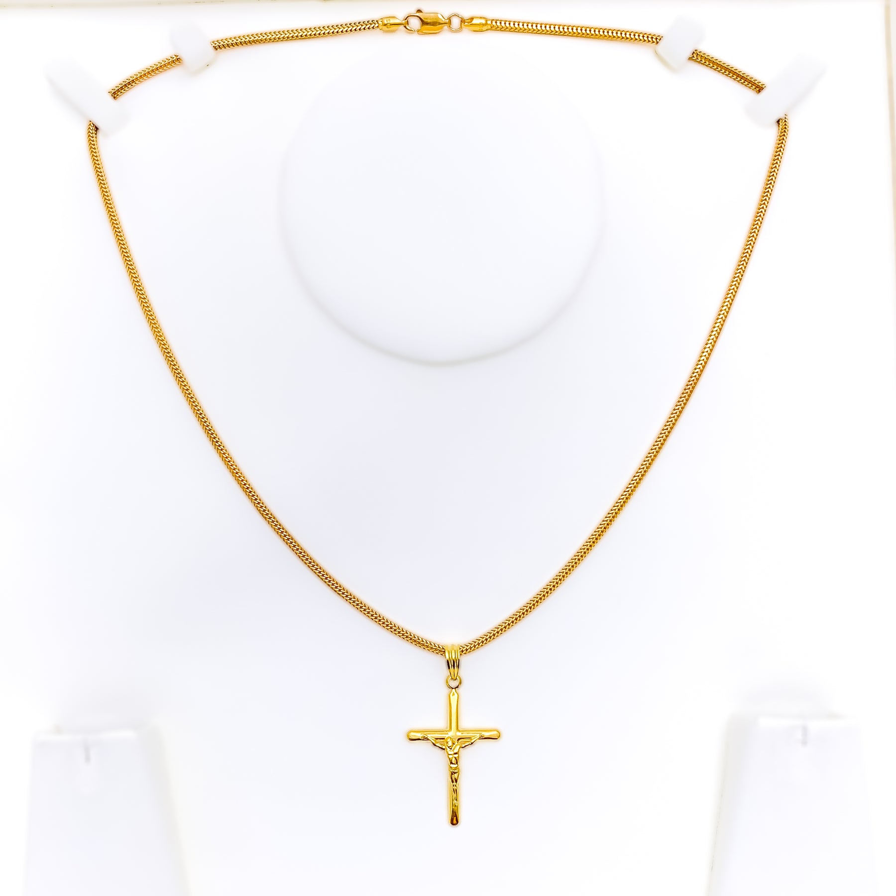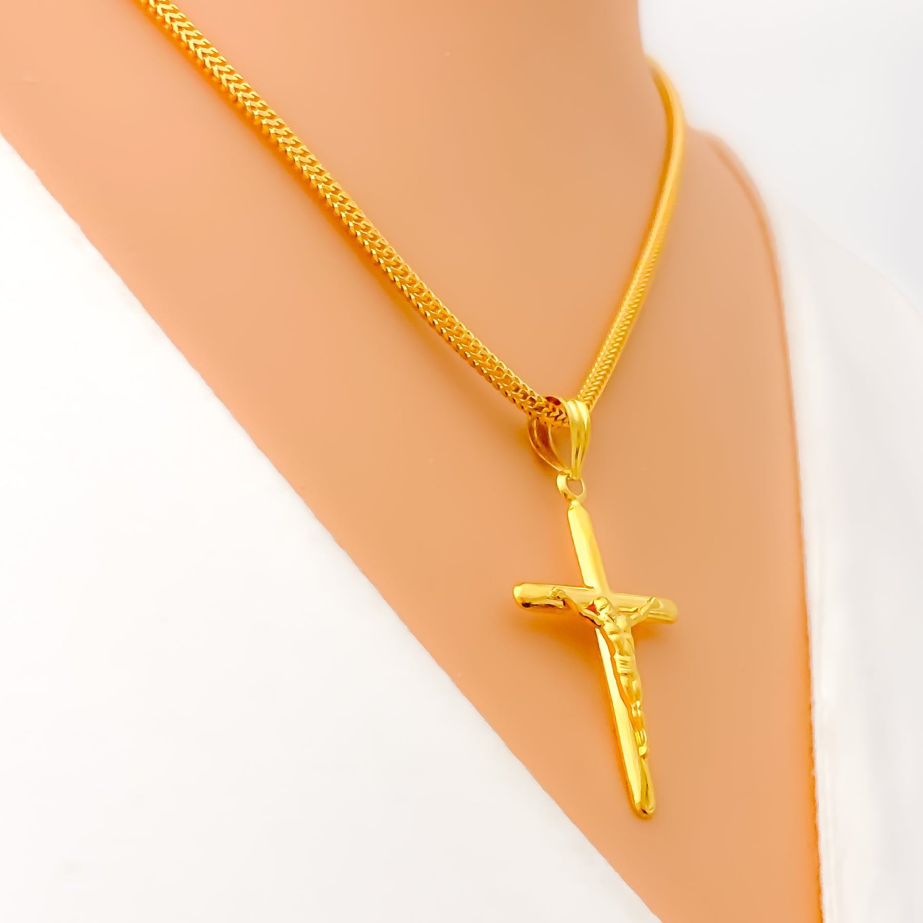 This graceful pendant is finely crafted in luminous 22k yellow gold, offering a radiant and enduring shine. Its clean cross design is elevated by a smooth, high-polish finish for timeless elegance. Weighing 1.4 grams, it strikes the perfect balance between lightness and presence. An ideal piece for everyday wear or as a cherished gift of faith.