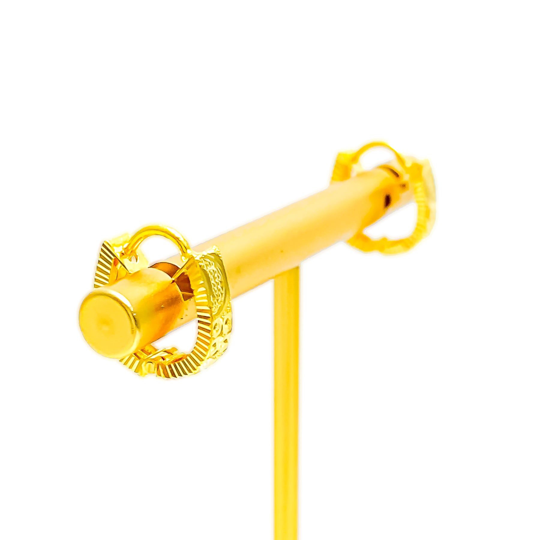 Gracefully detailed, these 22k yellow gold earrings weigh 2.2 grams and feature a beautifully textured finish that enhances their classic Bali-style hoop silhouette. Measuring 0.5 inches in length, they offer a timeless look secured with a comfortable clip lock. Their alluring glow and intricate surface make them a versatile choice for daily elegance or subtle festive charm, perfectly blending tradition with refined appeal.