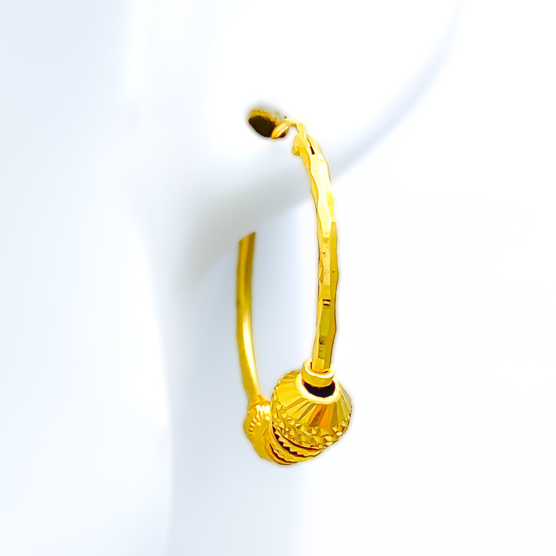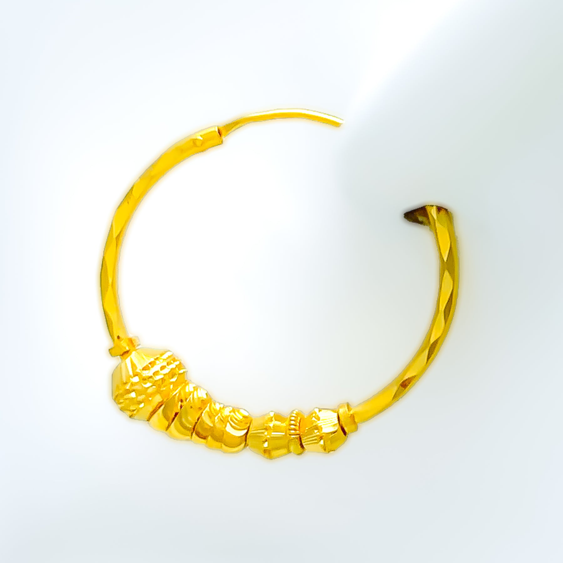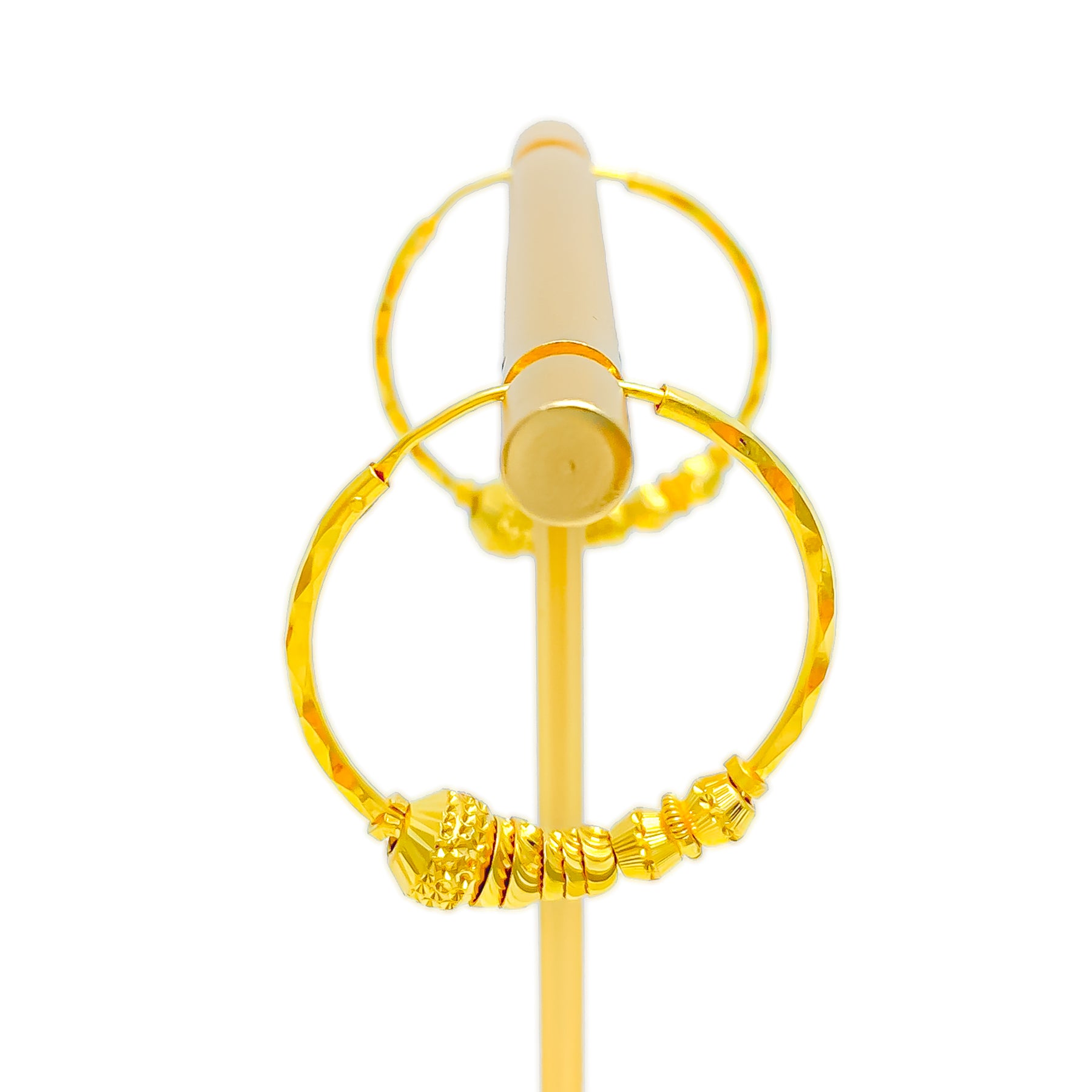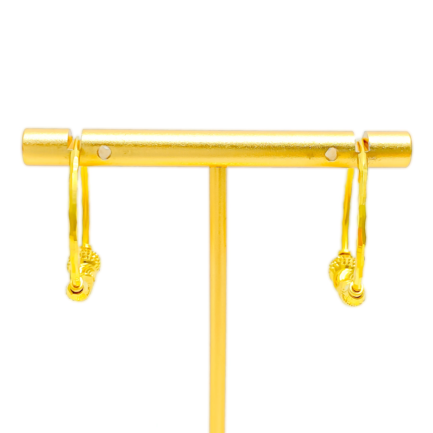 Crafted in 22k yellow gold with a weight of 4.1 grams, these elegant bali earrings radiate luminous brilliance. The polished finish enriches their sparkling design, offering a refined balance of sophistication and charm. Measuring 1 inch in both diameter and length, they provide versatile elegance with lightweight comfort. Durable and stylish, they are a timeless jewel suited for both daily wear and festive occasions.