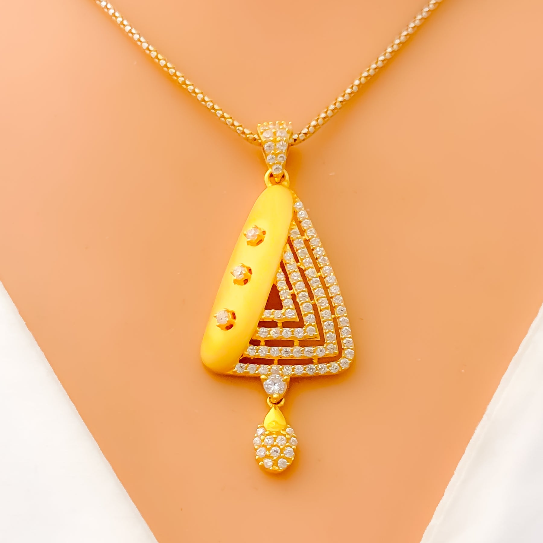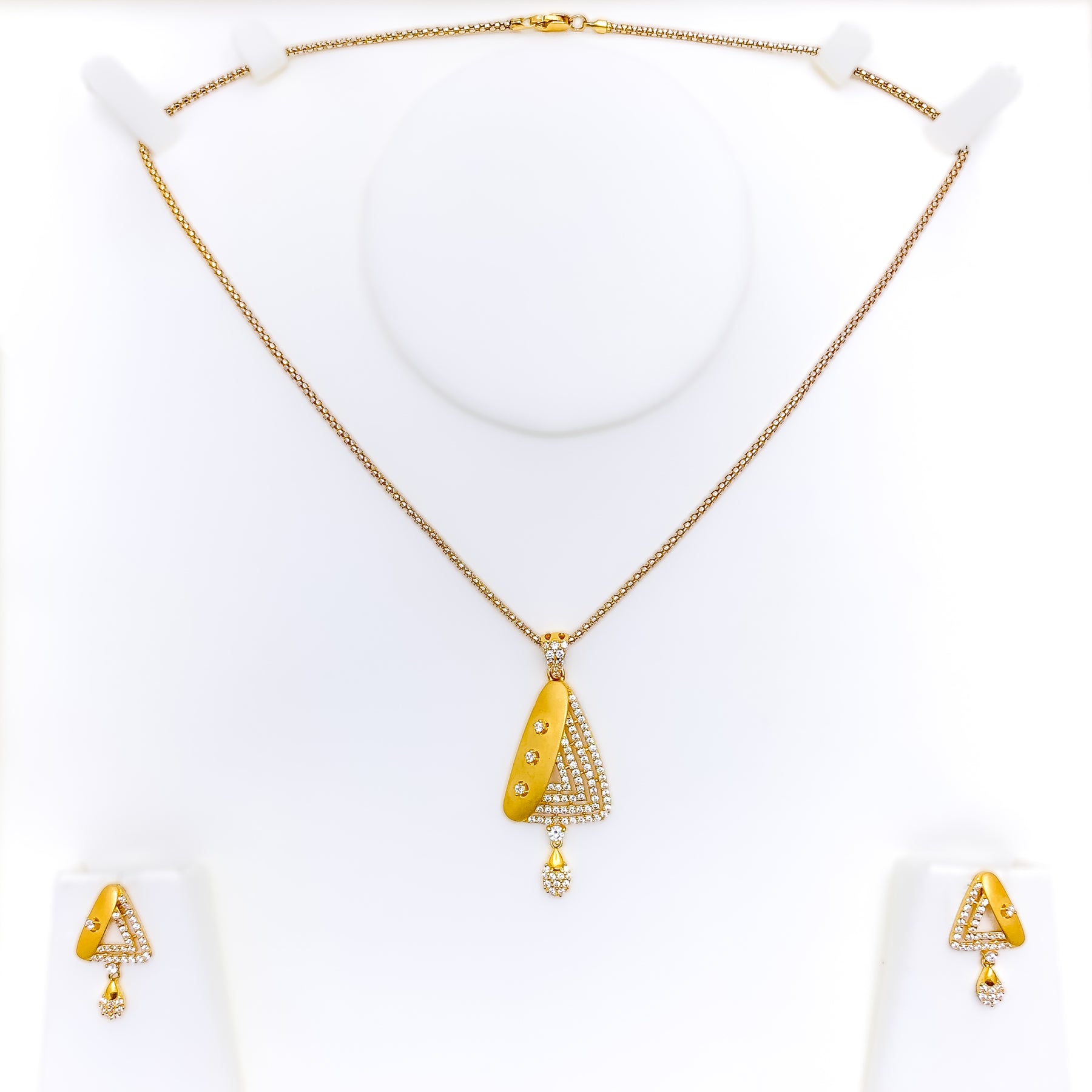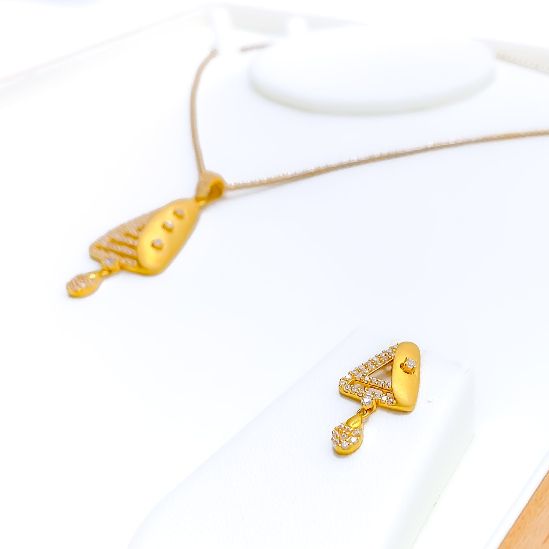 This striking 22k yellow gold pendant set, weighing 9.6 grams, features an abstract floral motif adorned with dazzling cubic zirconia. The 1.8" pendant is paired with 0.9" screw-back earrings, offering a graceful balance. Its polished finish radiates brilliance, making it versatile for elegant wear. A refined three-piece ensemble that beautifully blends artistry and timeless allure, with chain not included.
