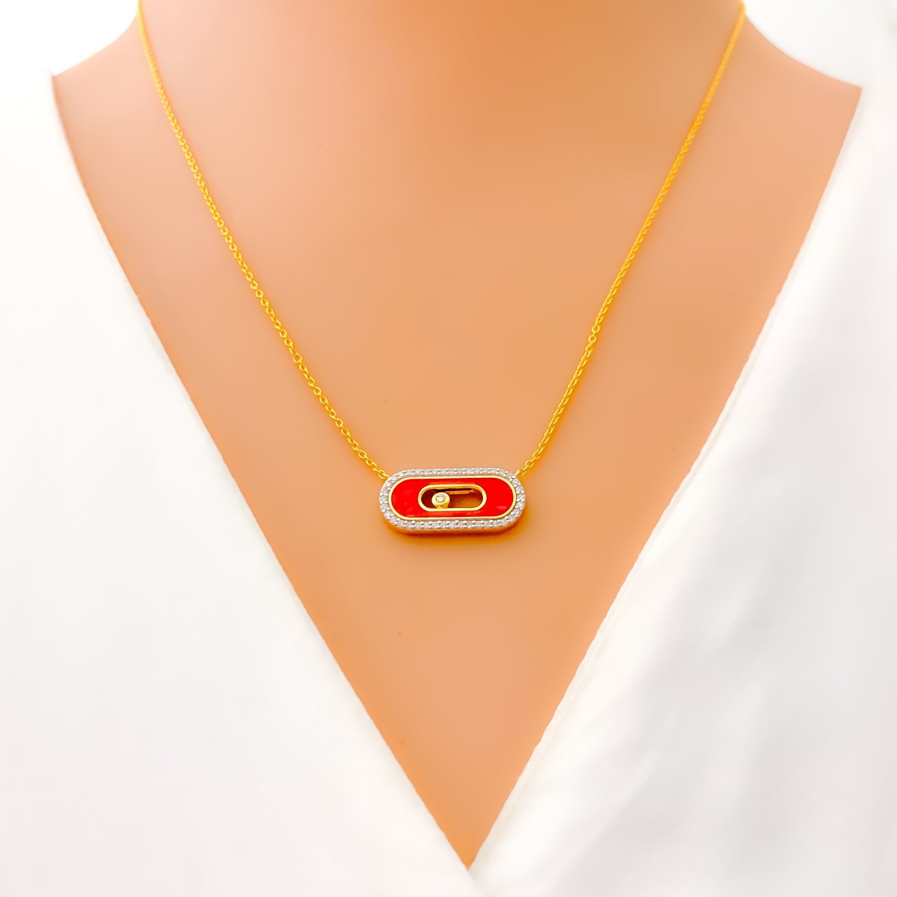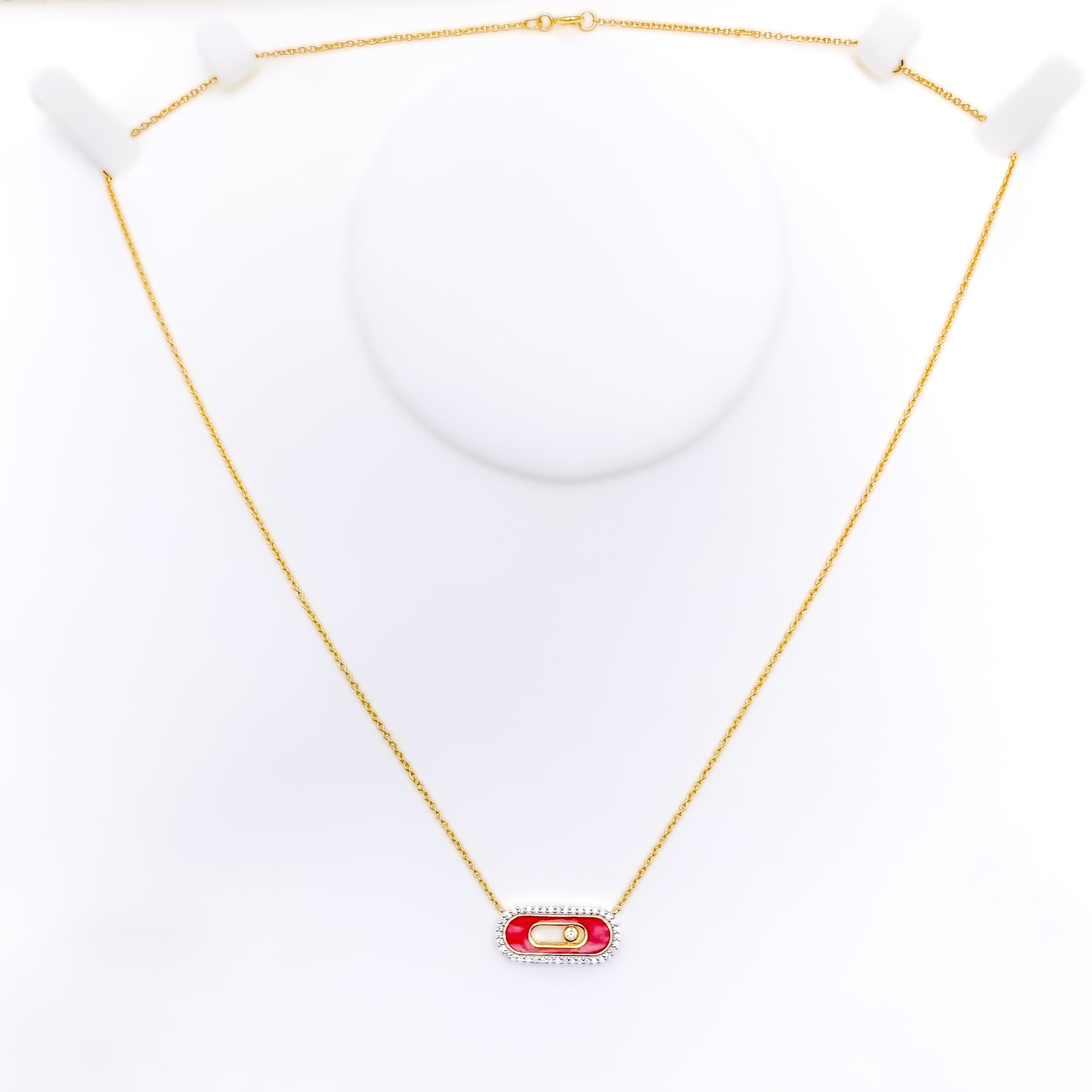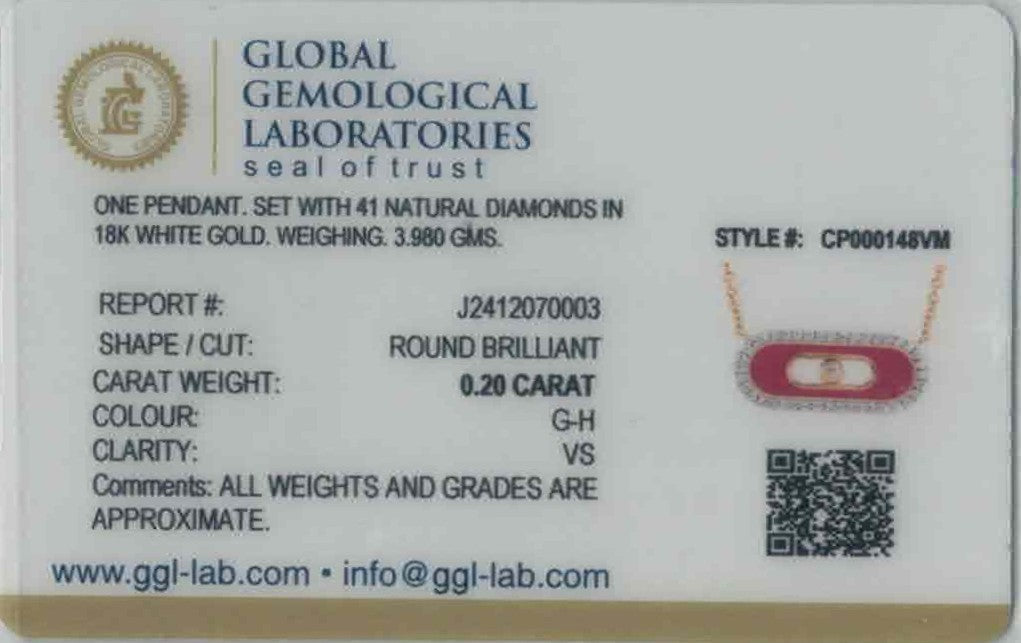 This stylish 18k yellow gold necklace, weighing 3.98 grams, showcases a trendy design accented with 0.20ct of sparkling round brilliant cut diamonds. The polished finish enhances its radiant brilliance, creating refined allure. Measuring 17" in length with a 0.3" drop, it includes 2" adjustable links and secures with a lobster ring lock. A certified GGL piece that blends modern sophistication with timeless elegance, perfect for daily wear or special occasions.