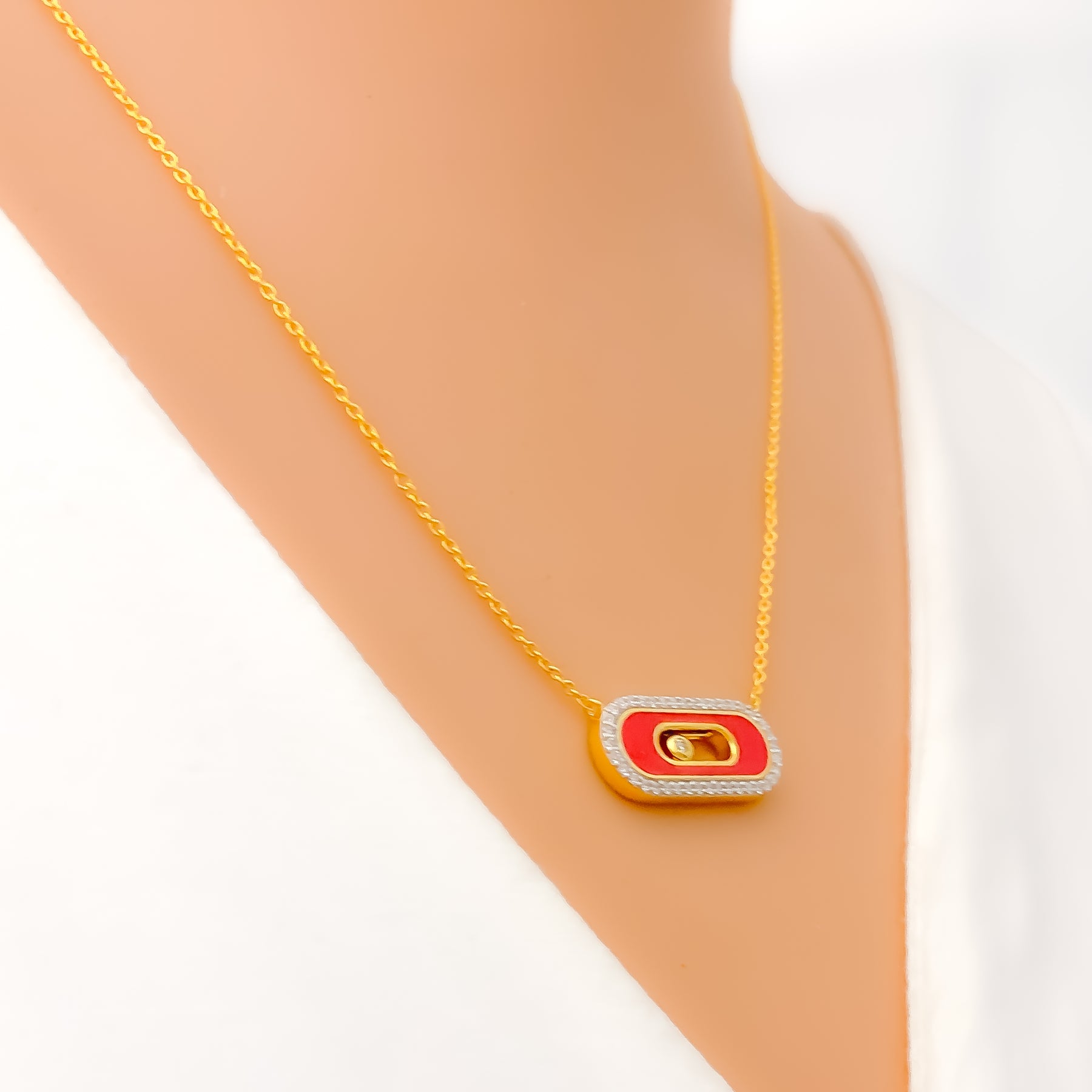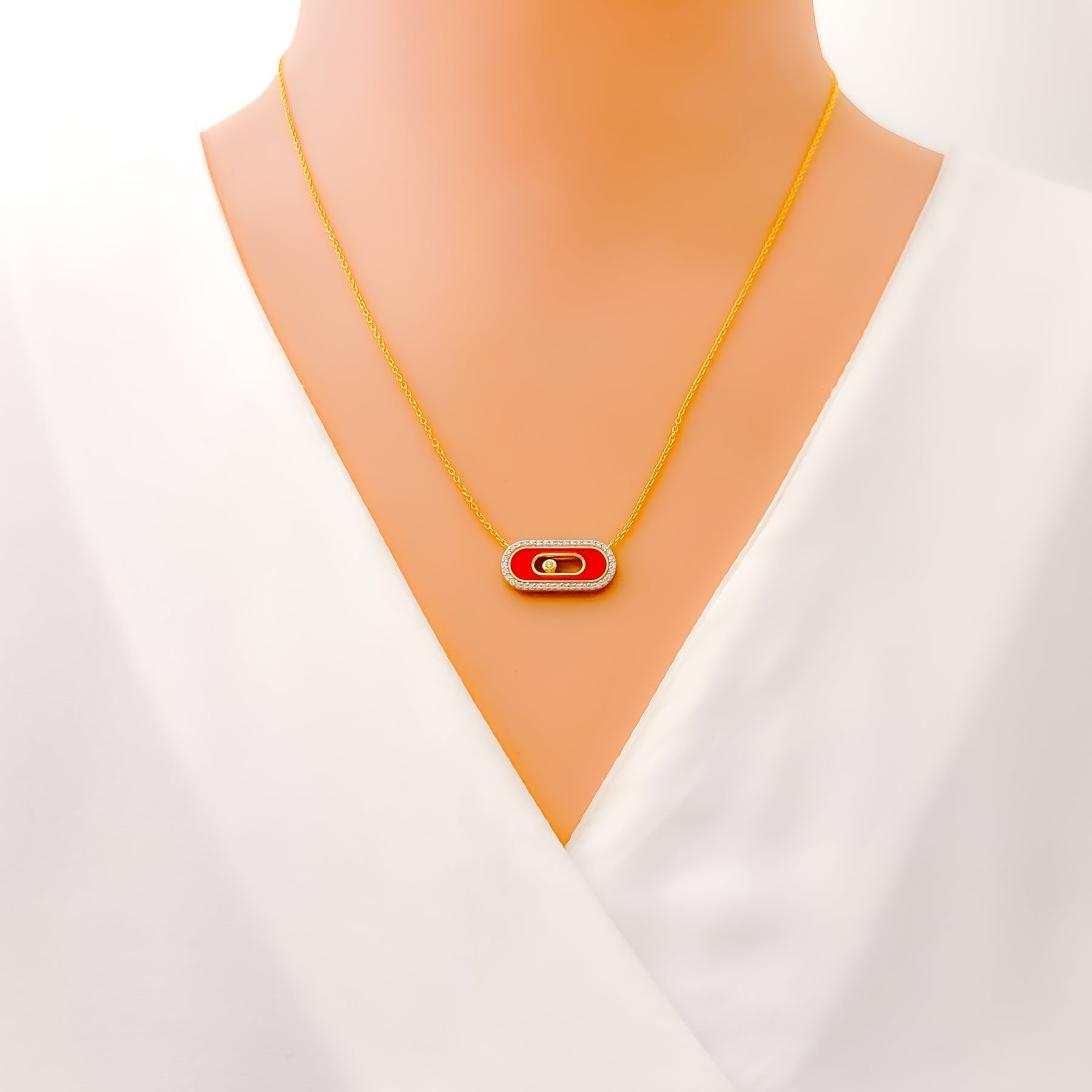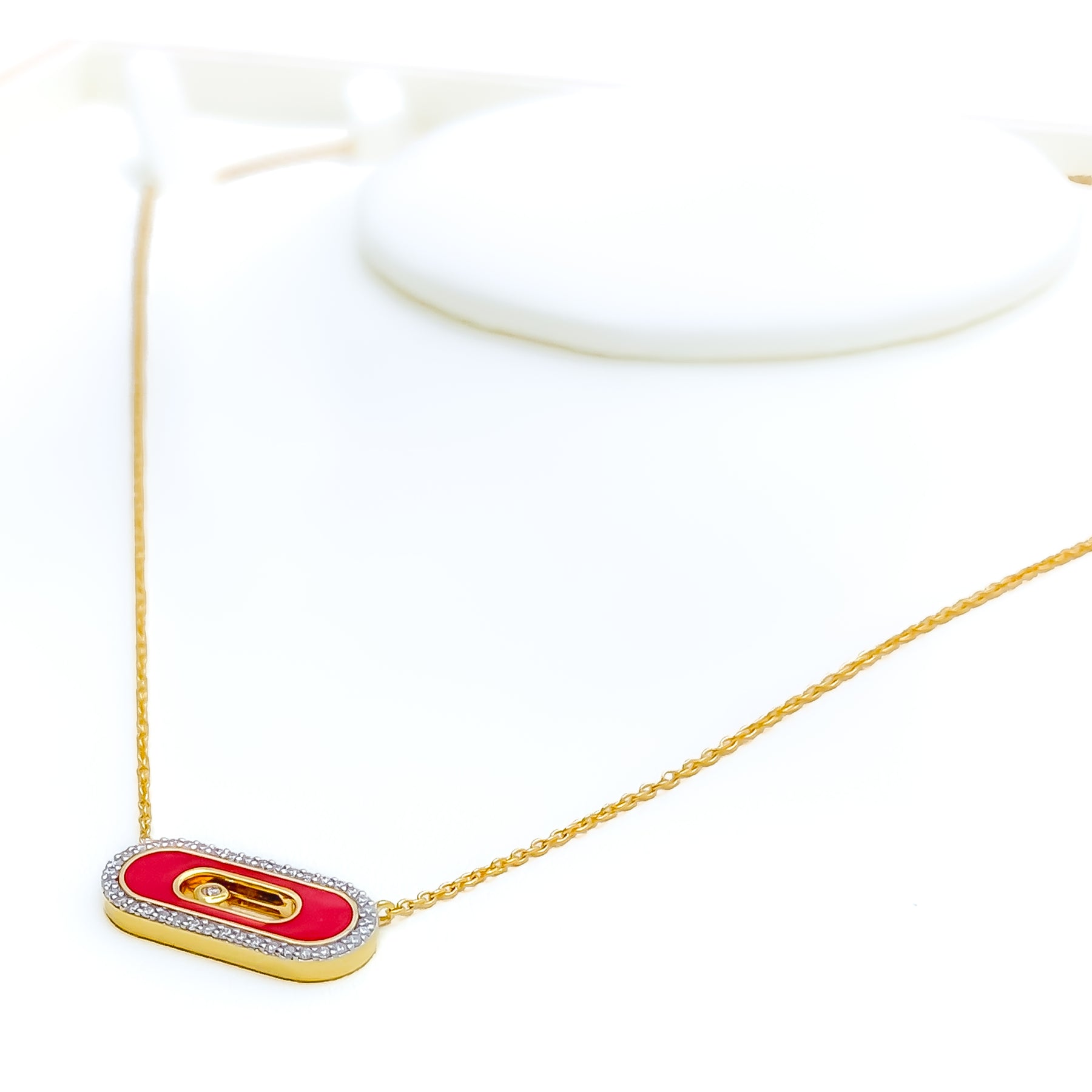 This stylish 18k yellow gold necklace, weighing 3.98 grams, showcases a trendy design accented with 0.20ct of sparkling round brilliant cut diamonds. The polished finish enhances its radiant brilliance, creating refined allure. Measuring 17" in length with a 0.3" drop, it includes 2" adjustable links and secures with a lobster ring lock. A certified GGL piece that blends modern sophistication with timeless elegance, perfect for daily wear or special occasions.