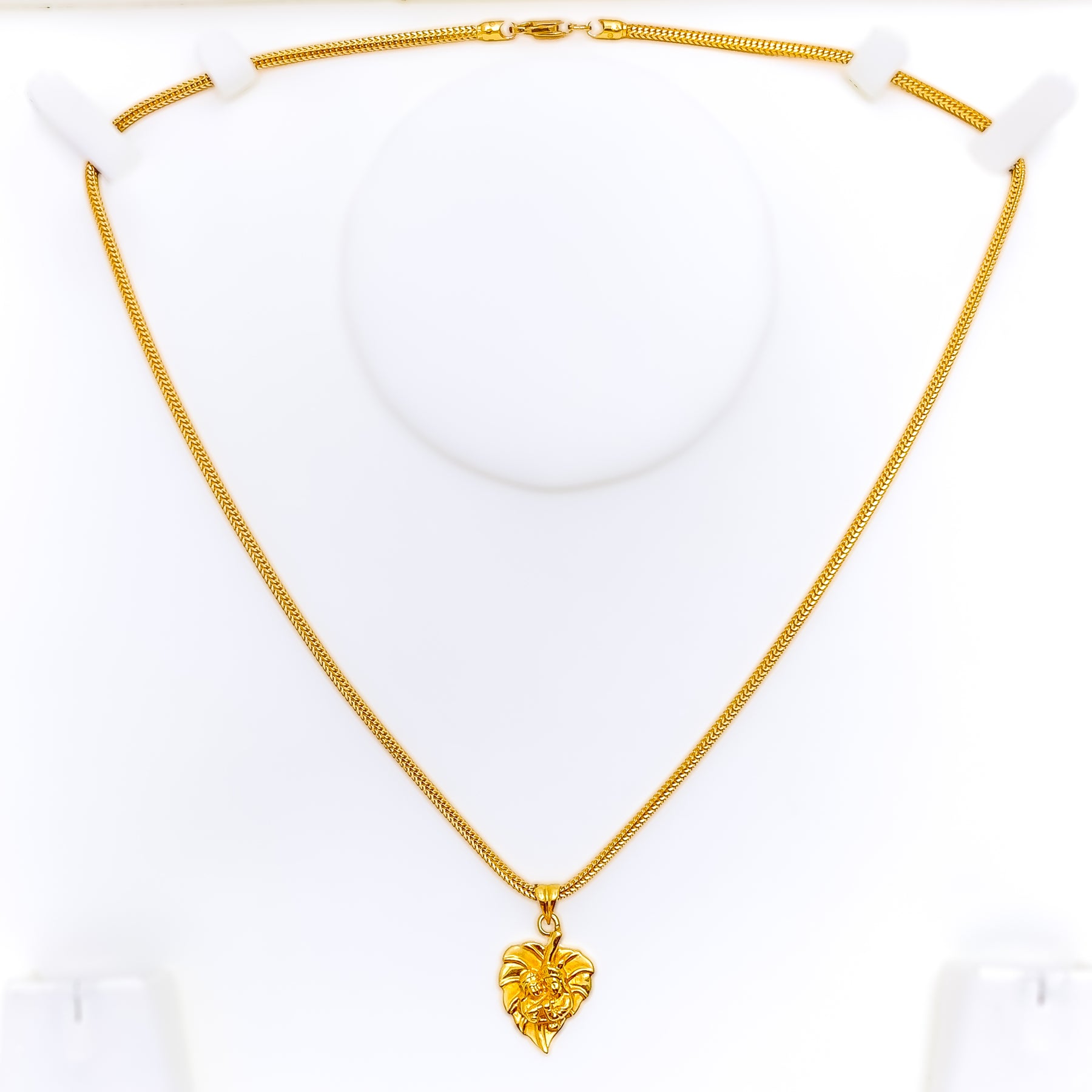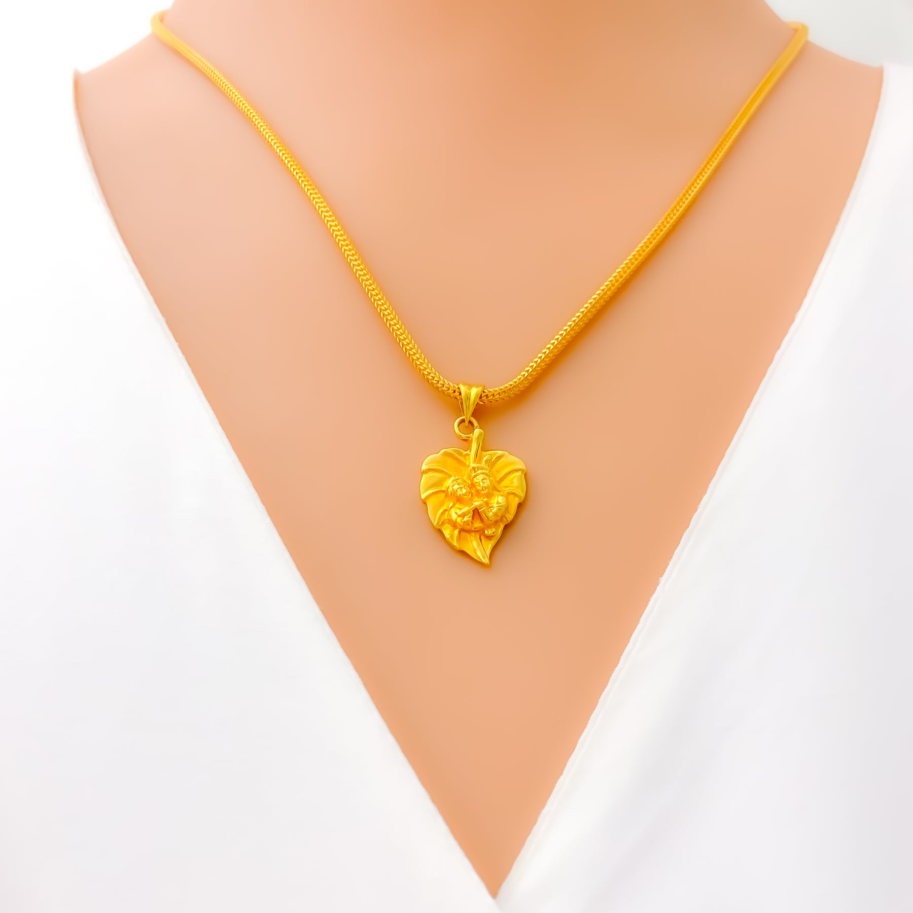 This elegant 22k yellow gold pendant, weighing 4.1 grams, features a leaf-inspired design that radiates vibrant charm. The polished finish enhances its golden brilliance, adding refined sophistication. Measuring 1.1" in length, it offers a graceful and versatile presence. A timeless accessory that beautifully blends natural artistry with classic elegance, perfect for both everyday wear and special occasions, with chain not included.