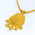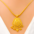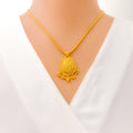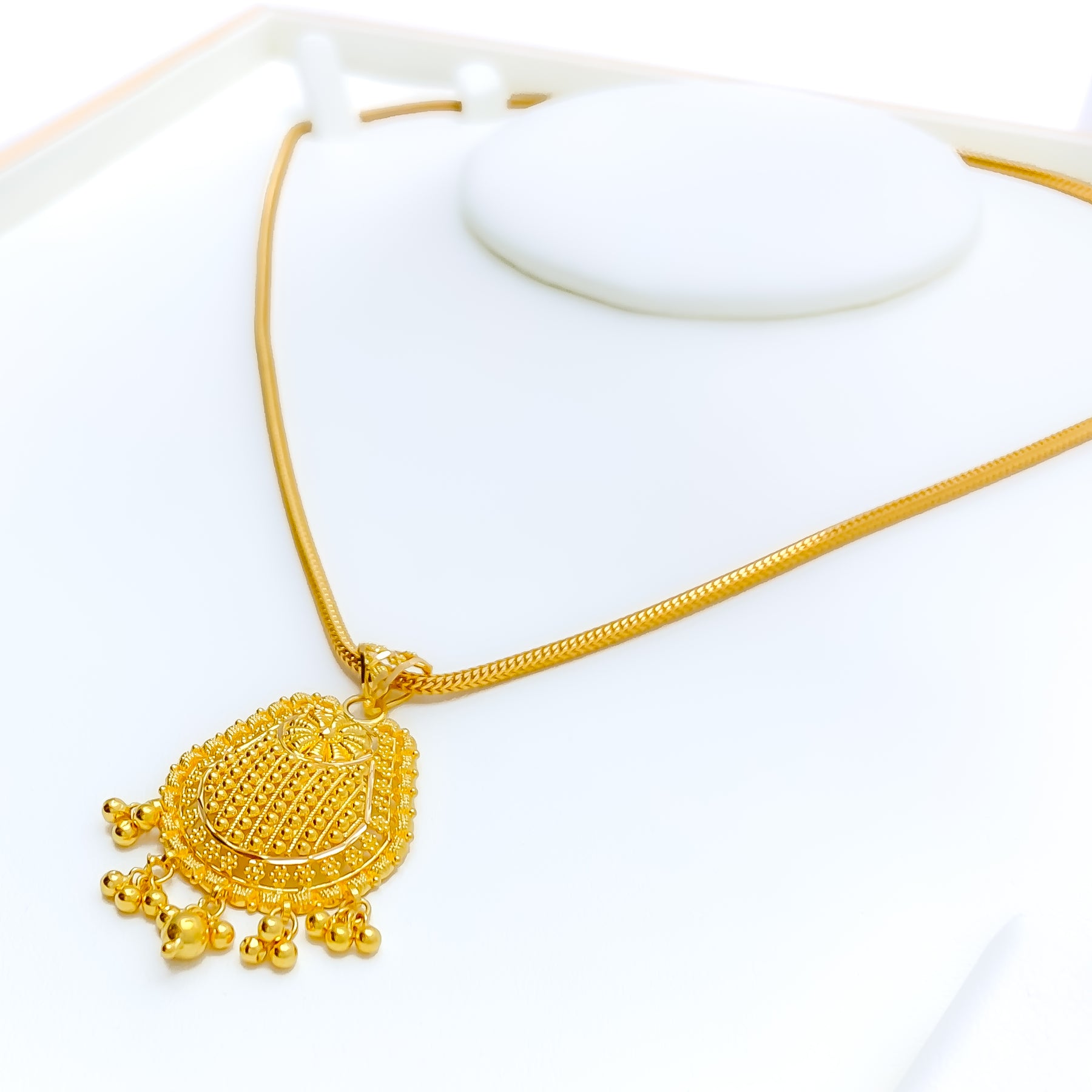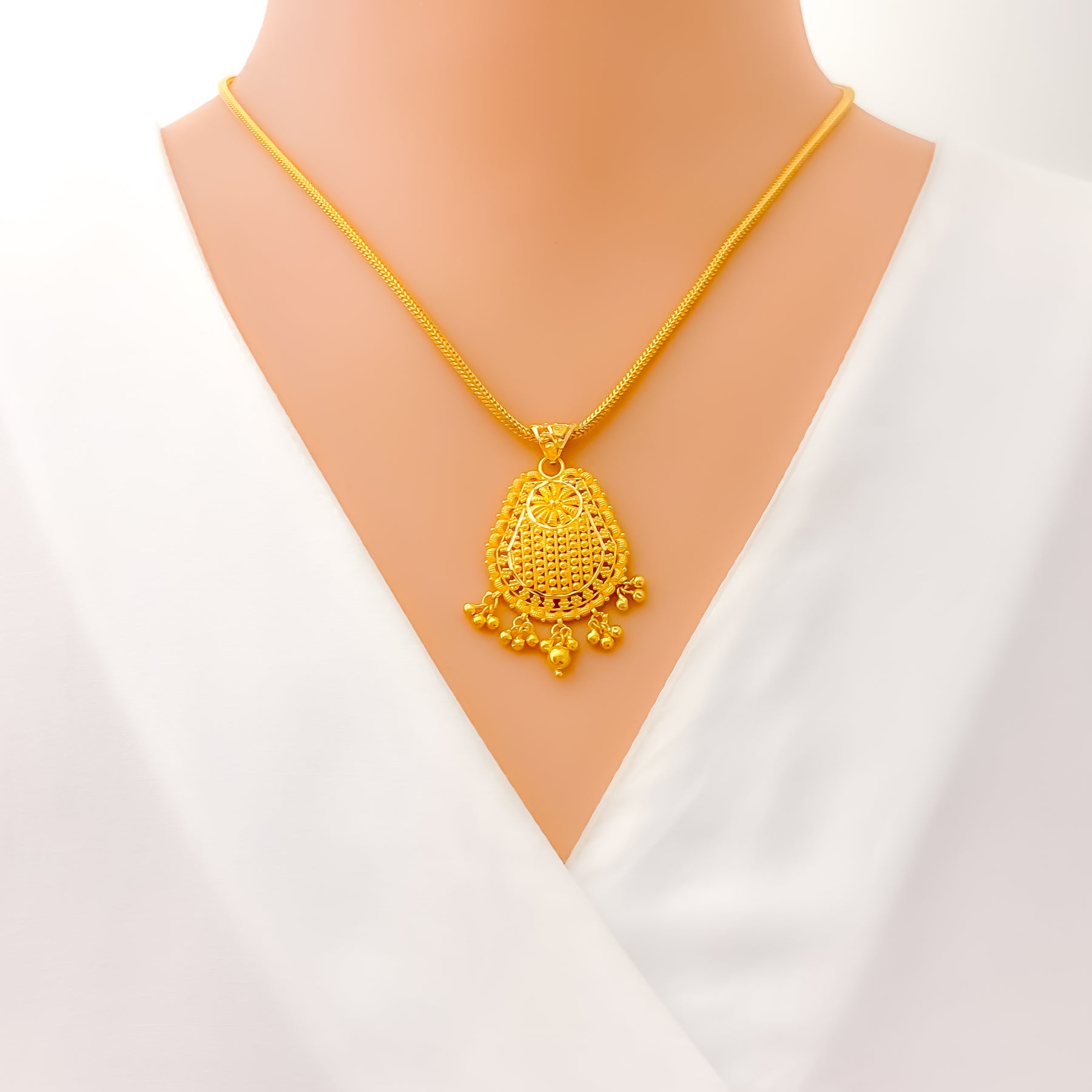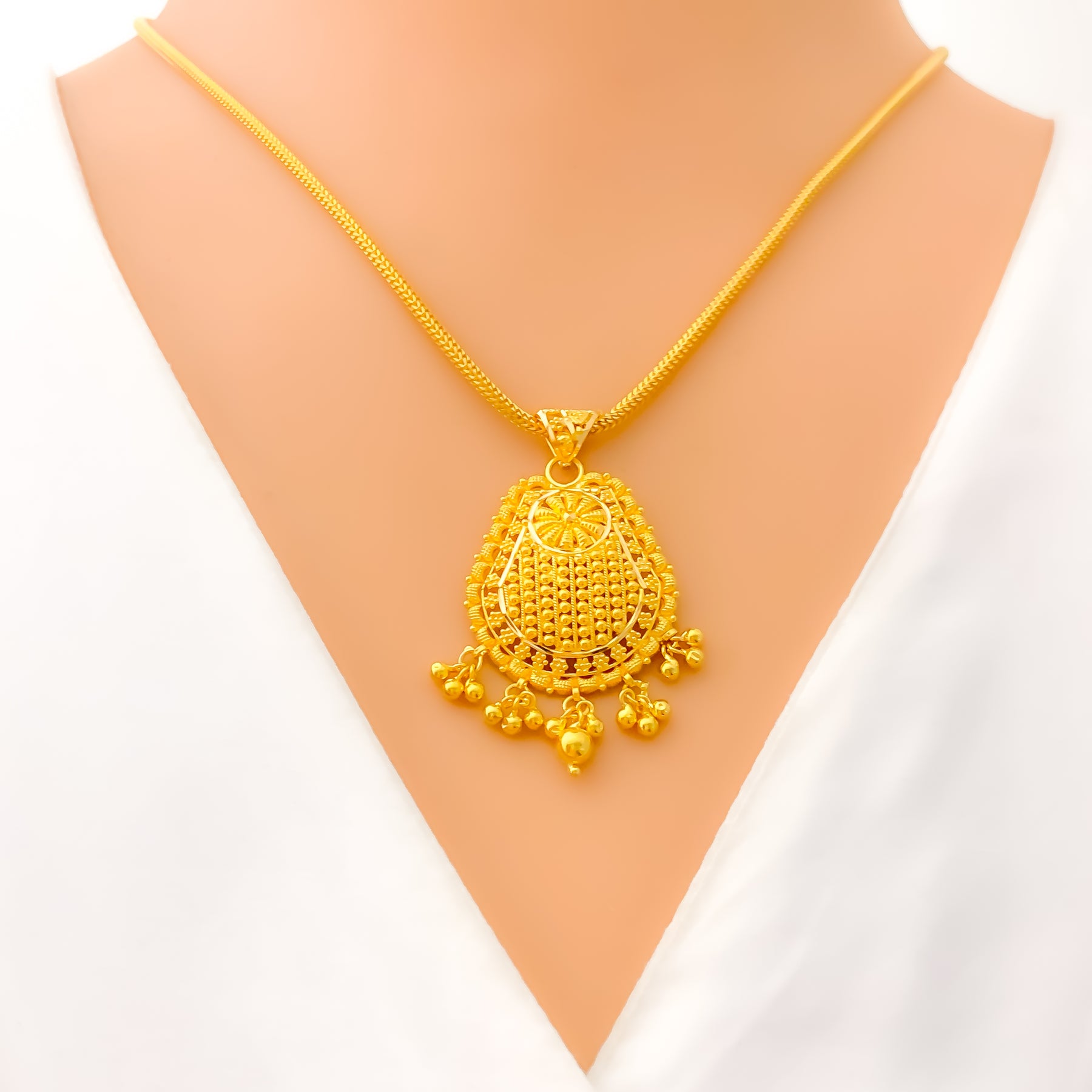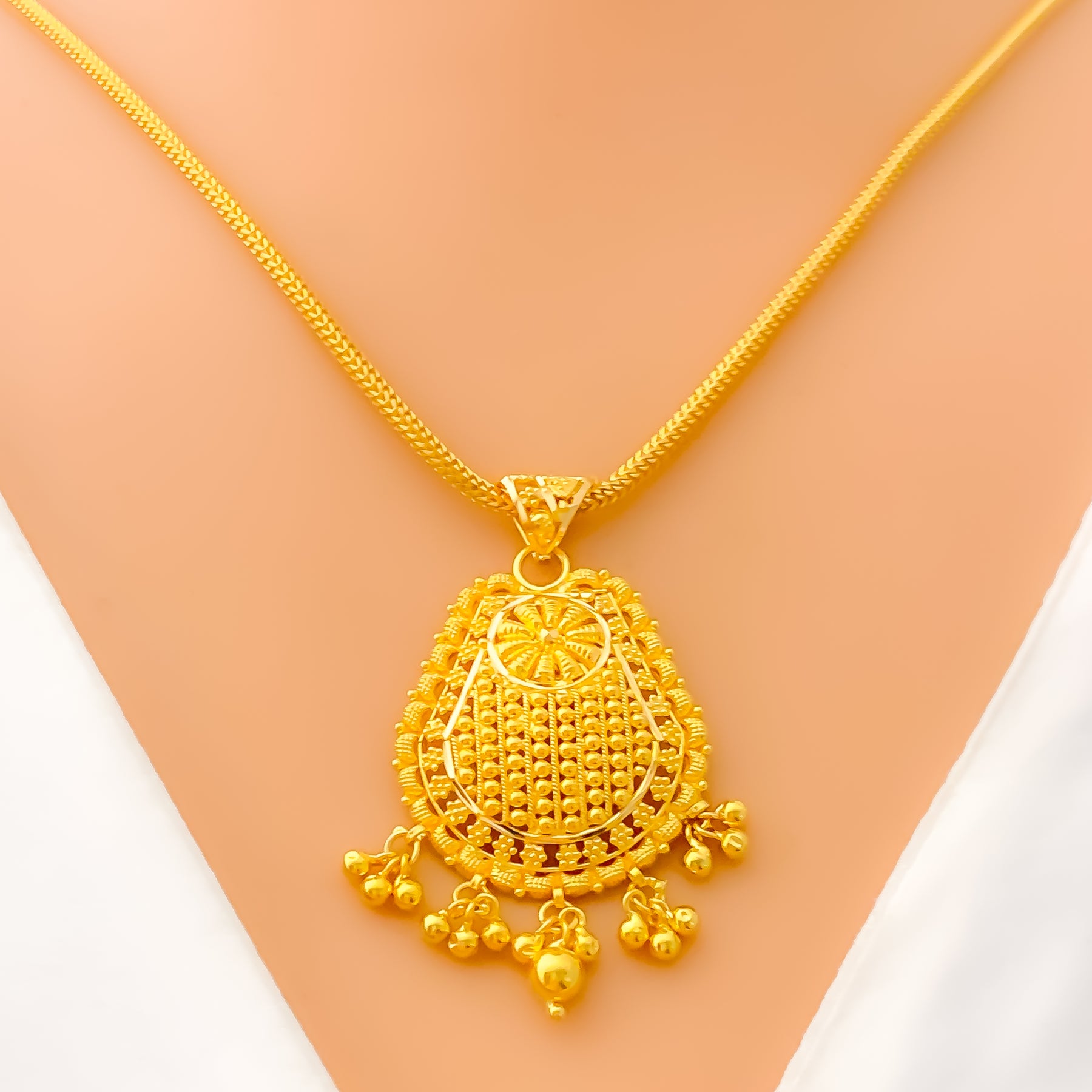 Designed to charm with its radiant allure, this 22k yellow gold pendant features an elegant floral pattern enriched with ornate detailing. The 5.7-gram weight and 1.75" length offer a perfect balance of grace and presence. Its intricate craftsmanship lends a timeless sophistication suited for both festive occasions and refined everyday wear. Chain is not included, offering flexibility in personal styling.