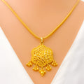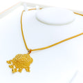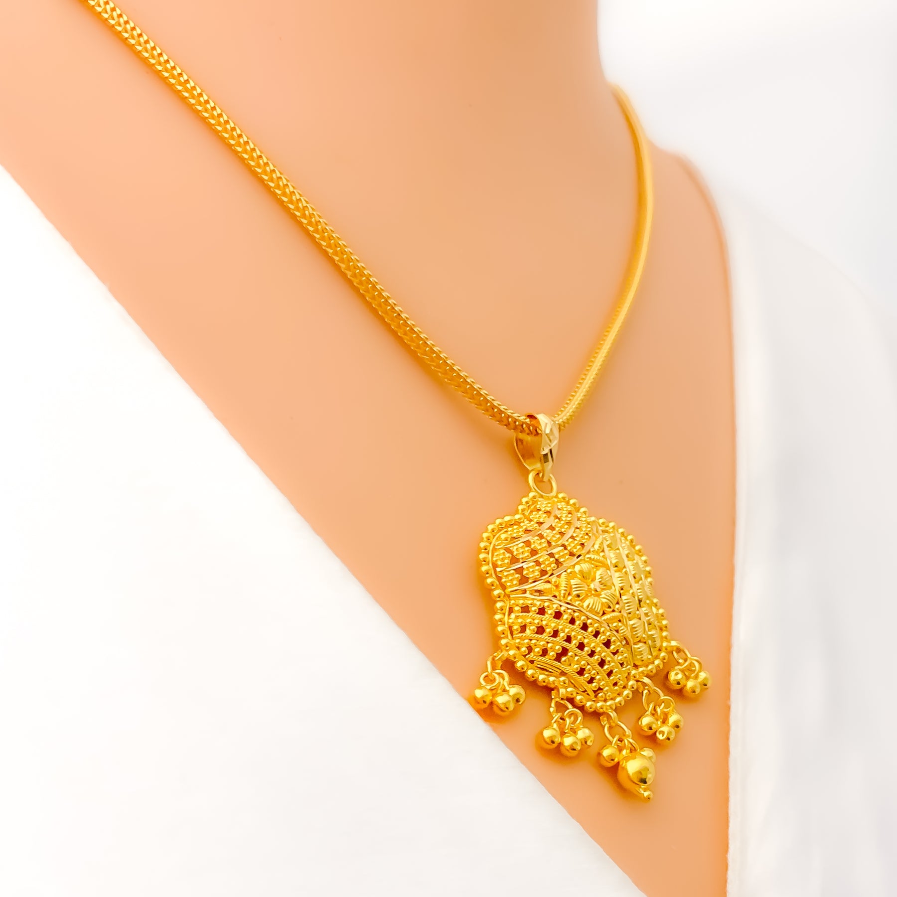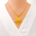 Elegantly crafted in a blooming floral motif, this 22k yellow gold pendant captures natural beauty with a refined, radiant touch. Weighing 5.5 grams, it features delicate petal work and a luminous finish that elevates any chain it’s paired with. Measuring 1.75" in length, it offers a bold yet graceful presence. Chain not included, giving you flexibility to personalize the look.